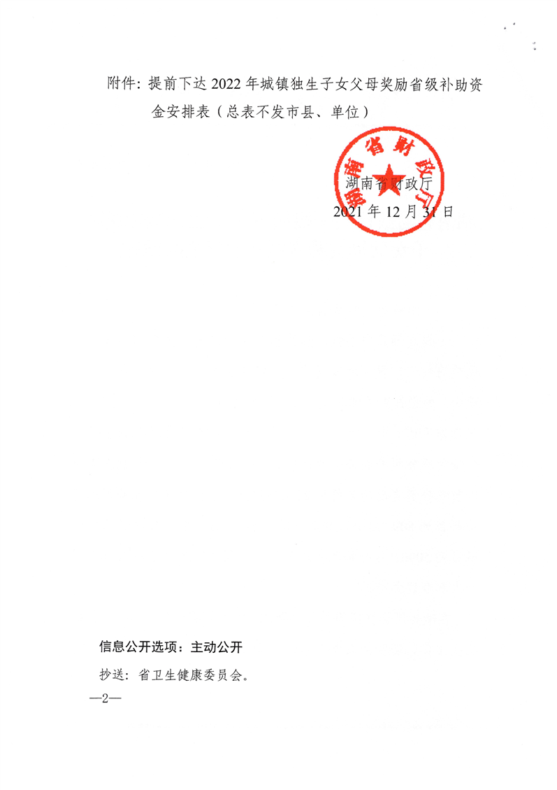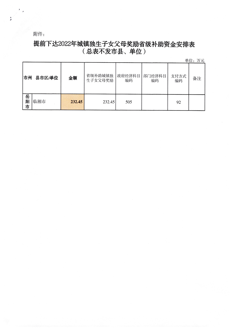 关于提前下达2022年城镇独生子女奖励省级补助资金的通知