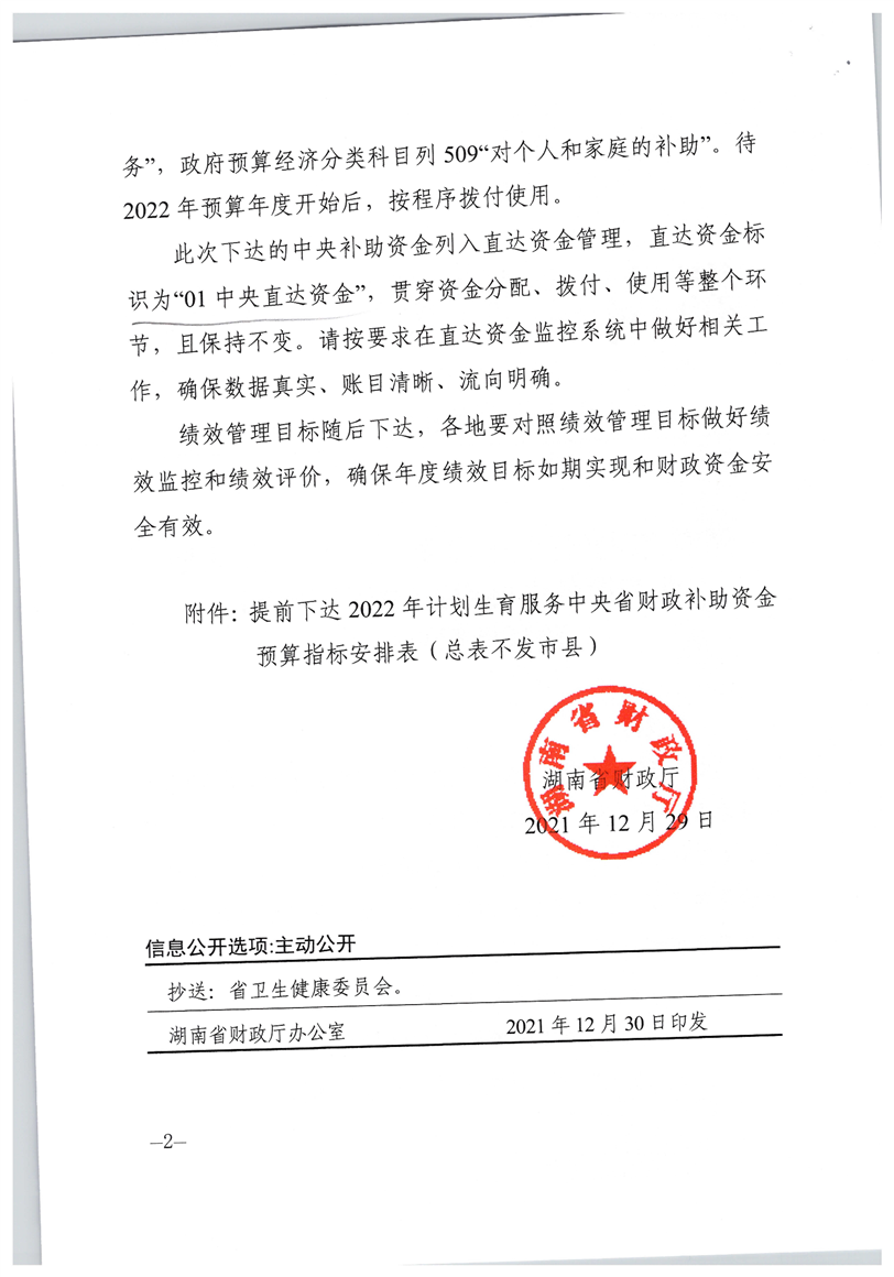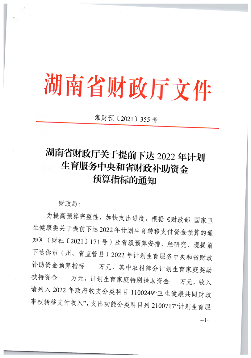 关于提前下达2022年计划生育服务中央和省财政补助资金预算指标的通知