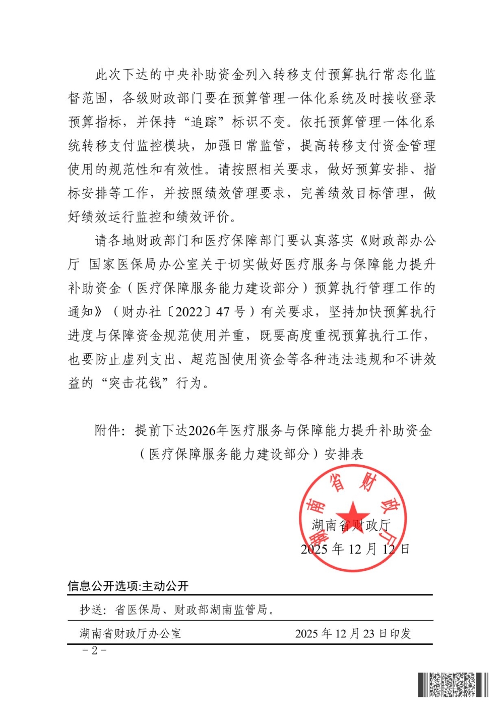 湖南省财政厅关于提前下达2026年医疗服务与保障能力提升补助资金(医疗保障服务能力建设部分)中央财政补助资金的通知