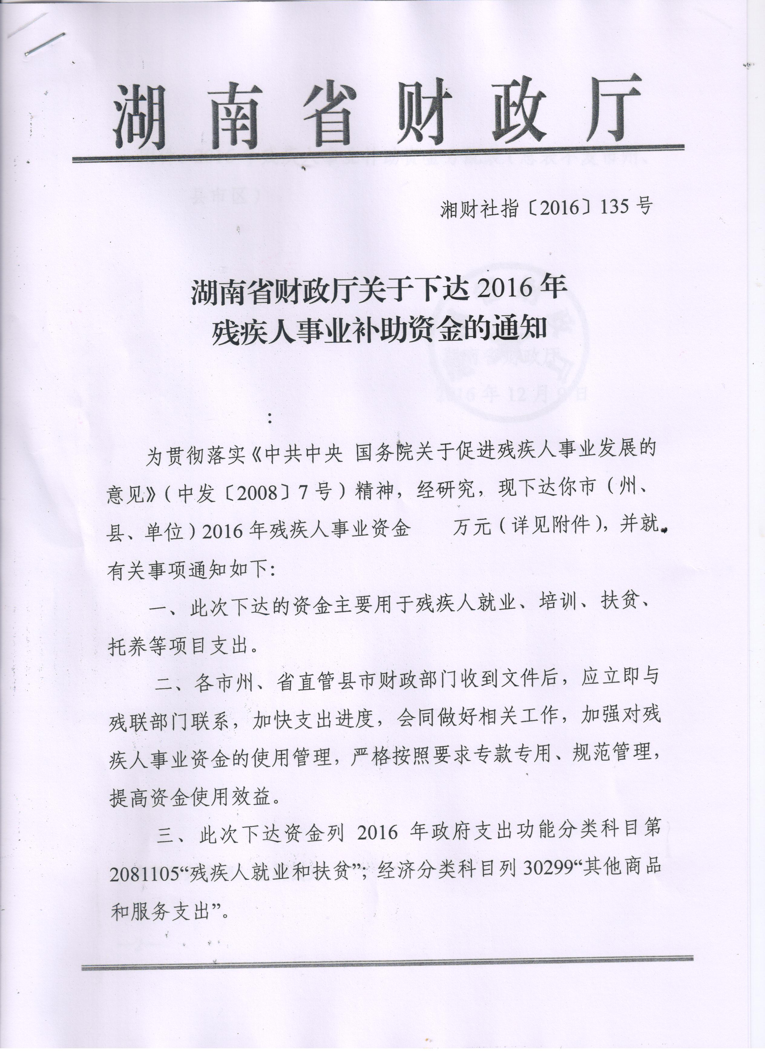 湖南省财政厅关于提前下达2017年残疾人事业补助资金预算指标的通知