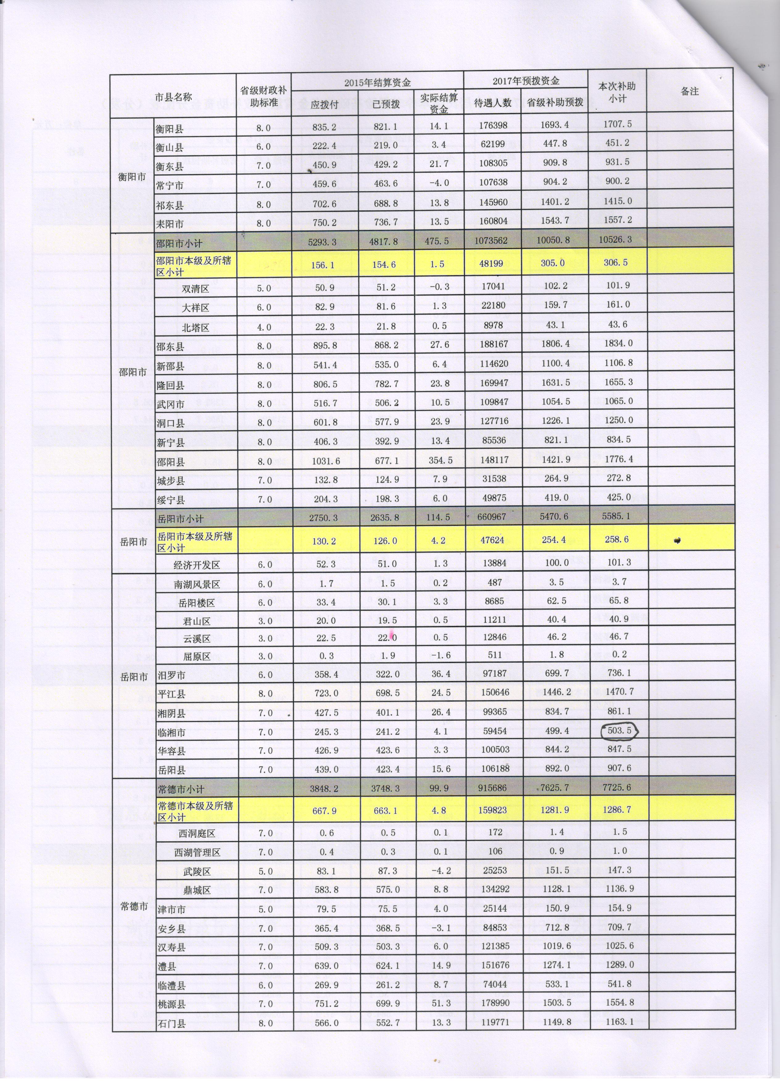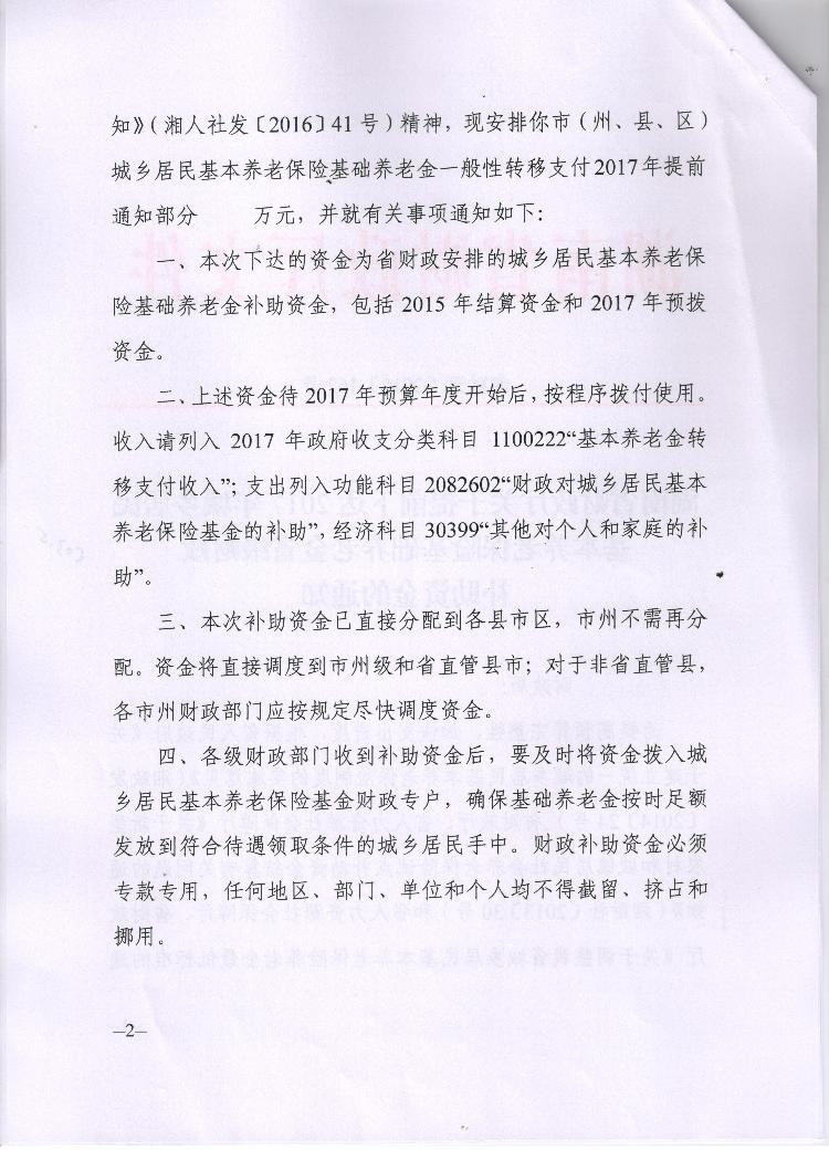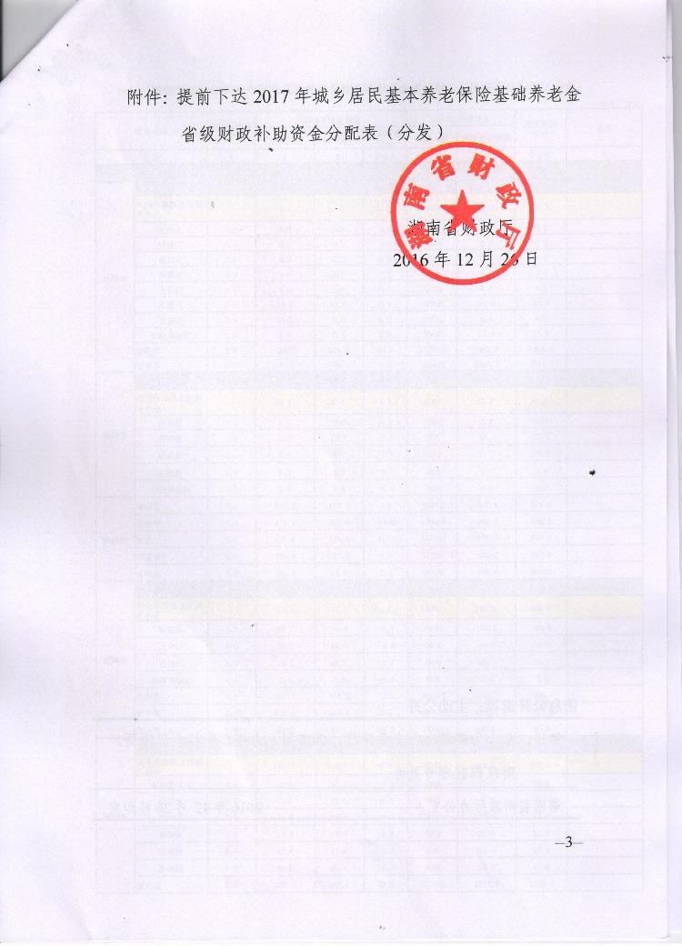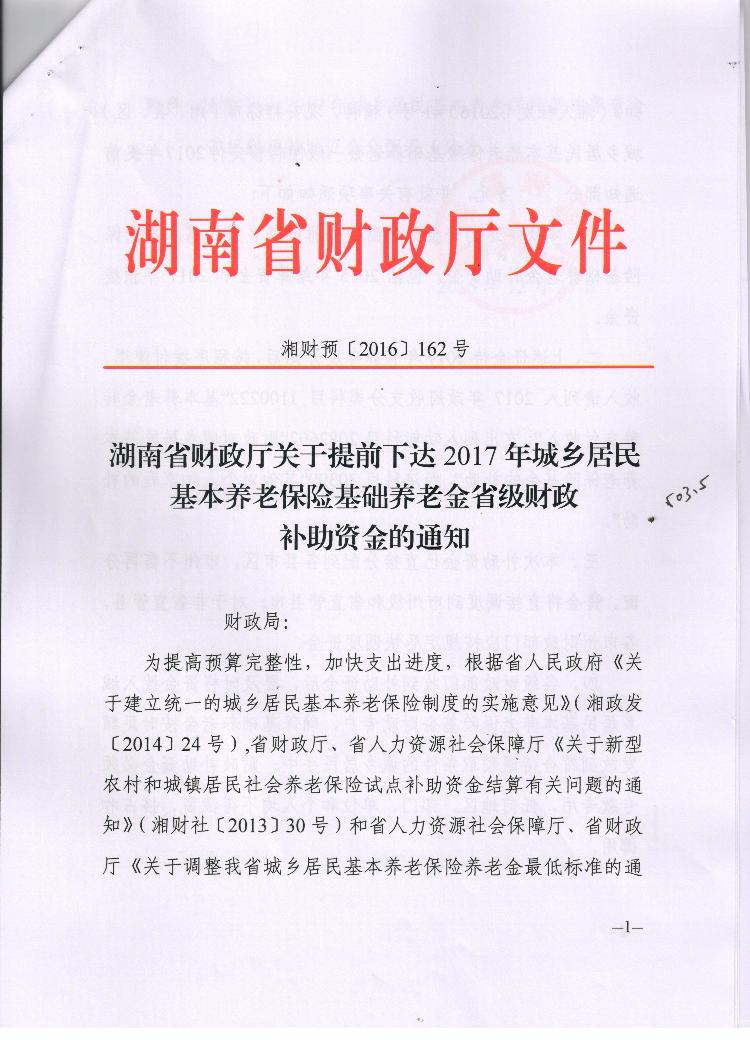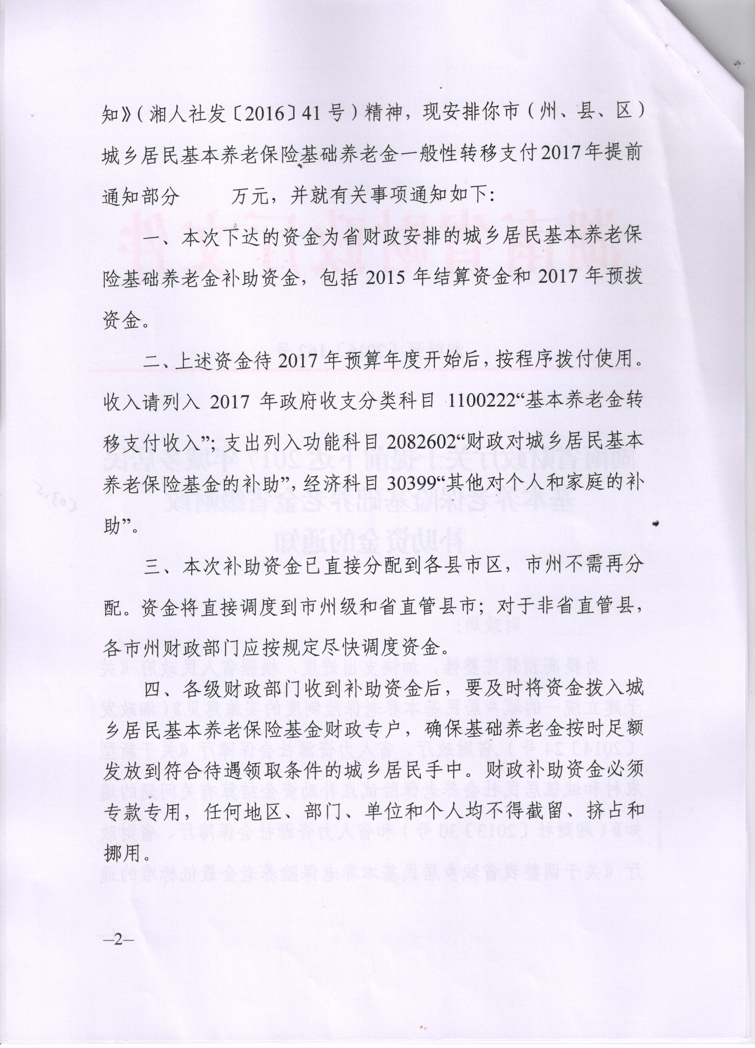 湖南省财政厅关于下达2017年城乡居民基本养老保险省级财政补助资金的通知