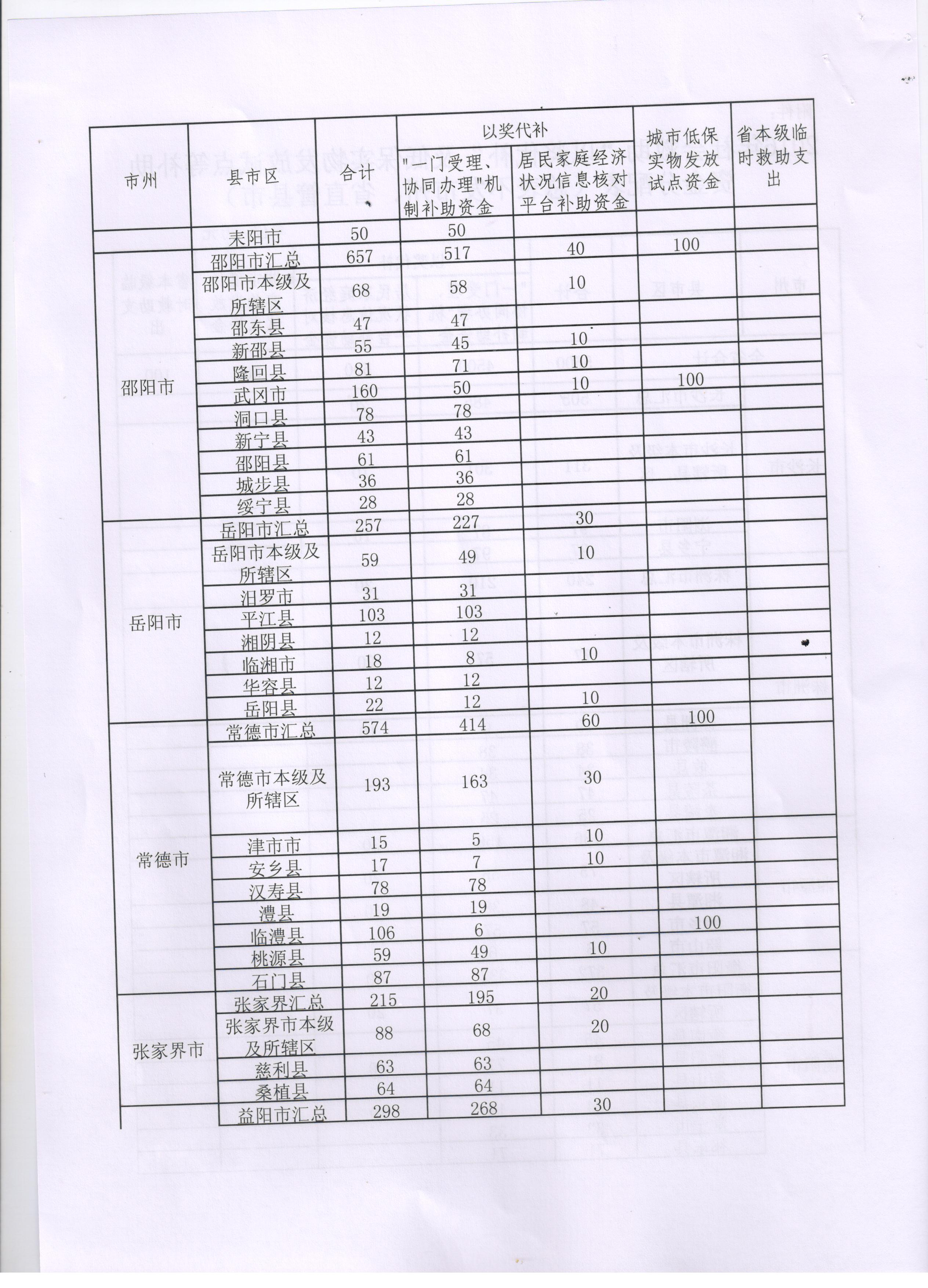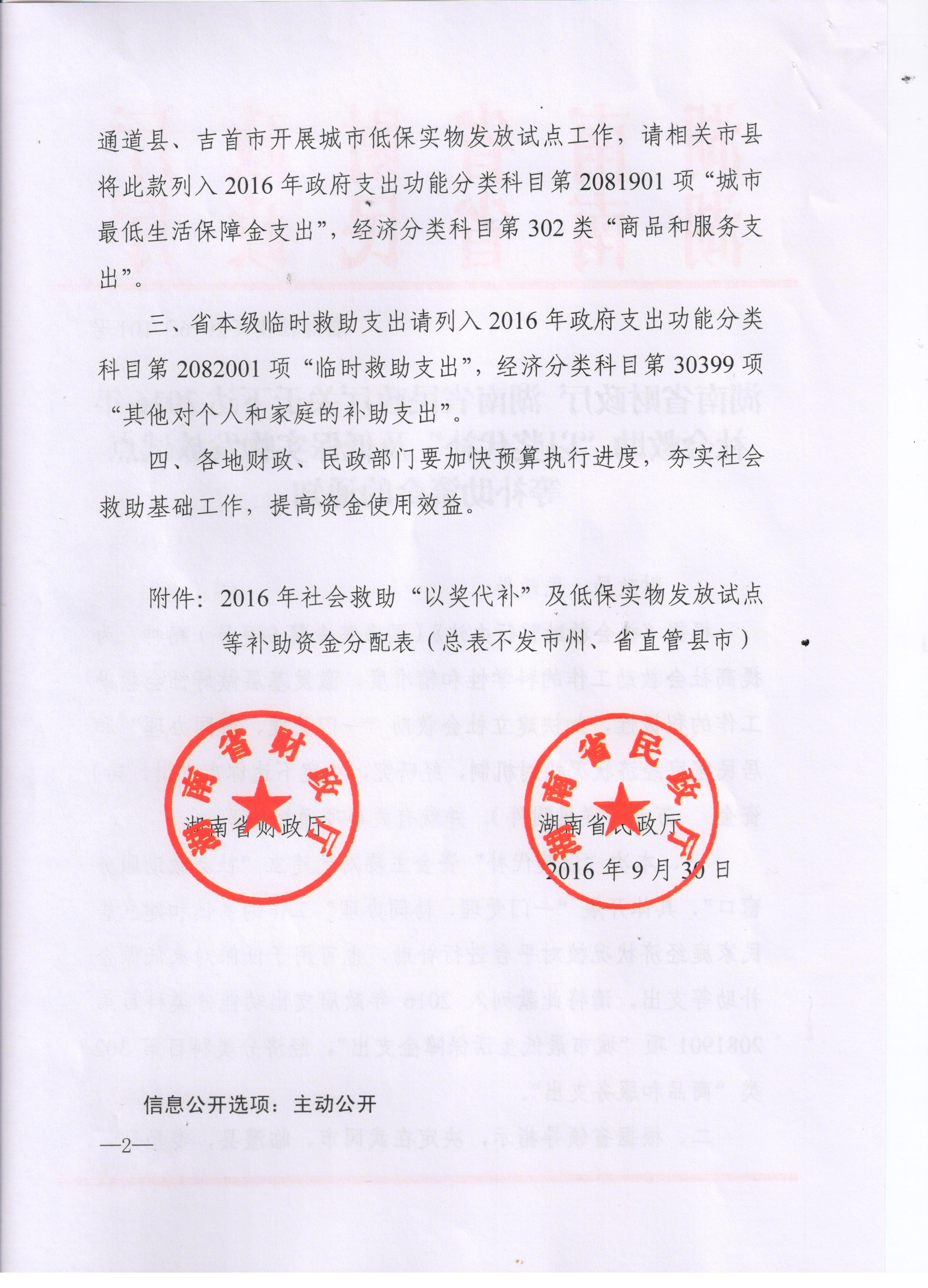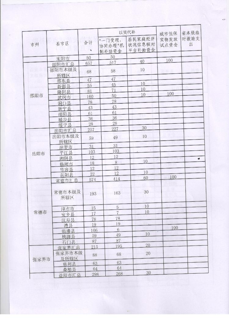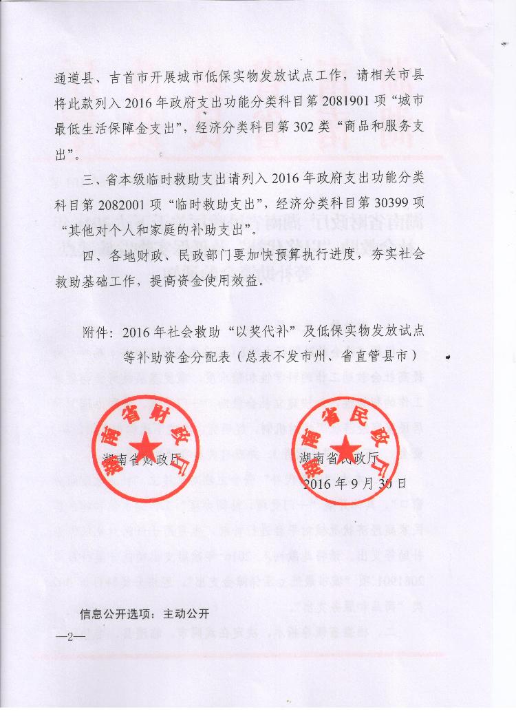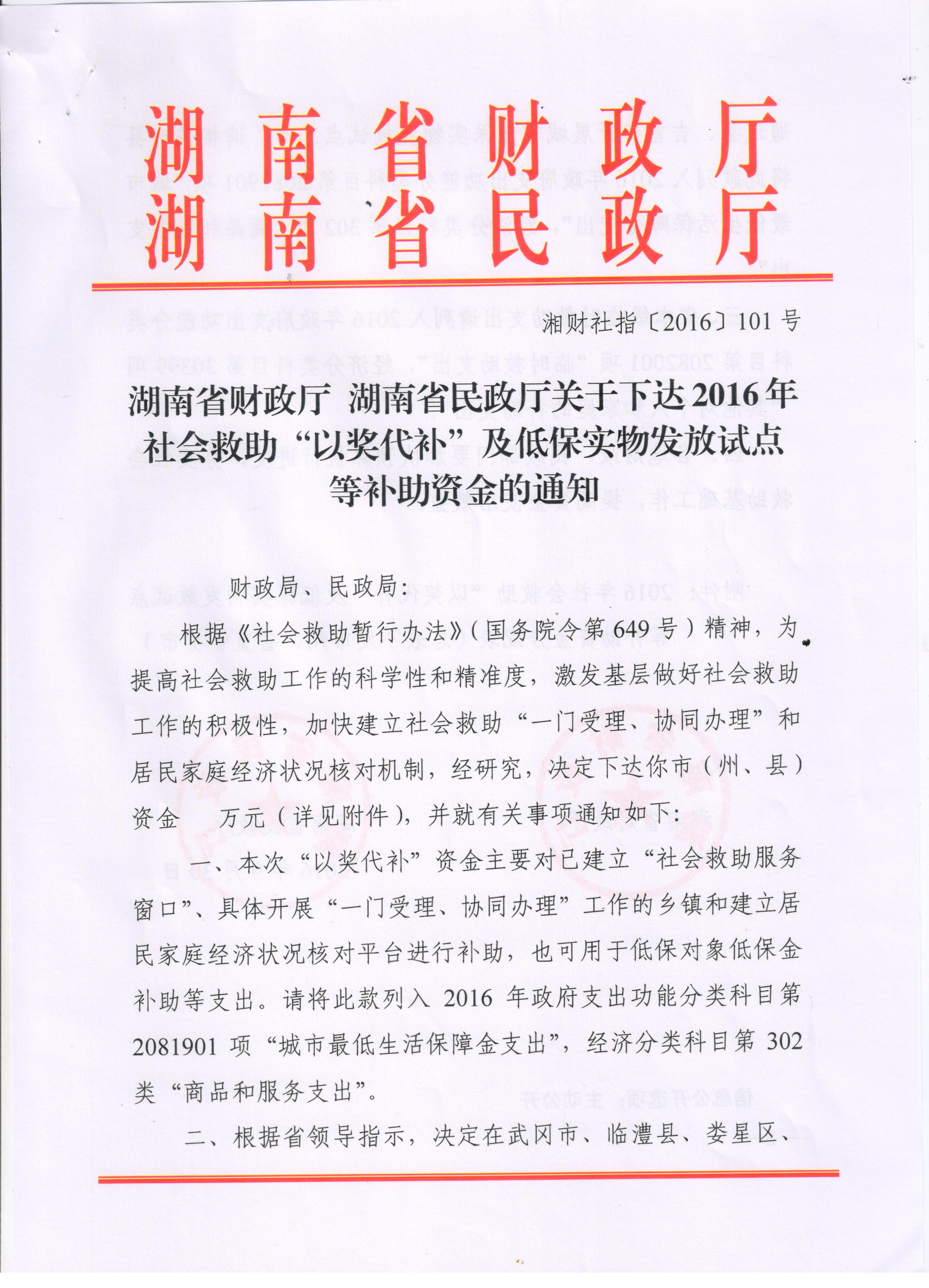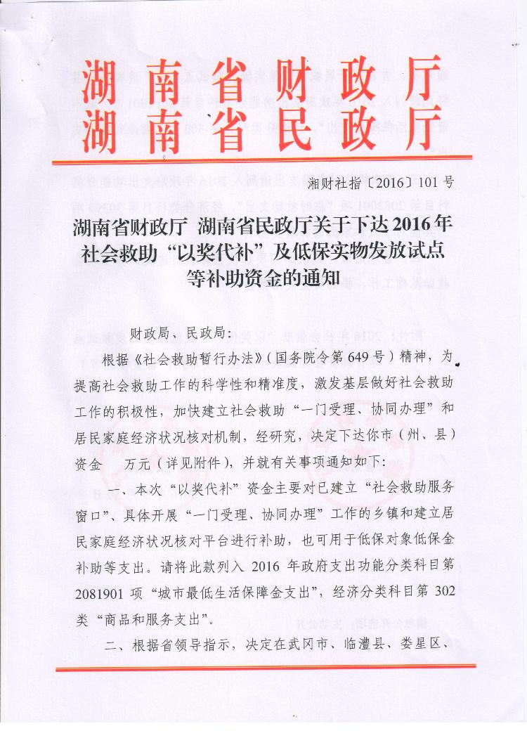 湖南省财政厅 湖南民政厅关于下达2016年社会救助“以奖代补”及低保实物发放试点等补助资金的通知