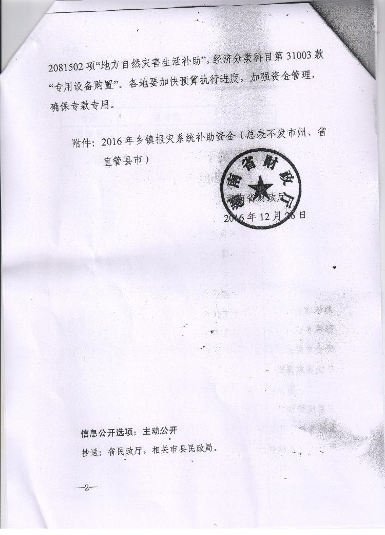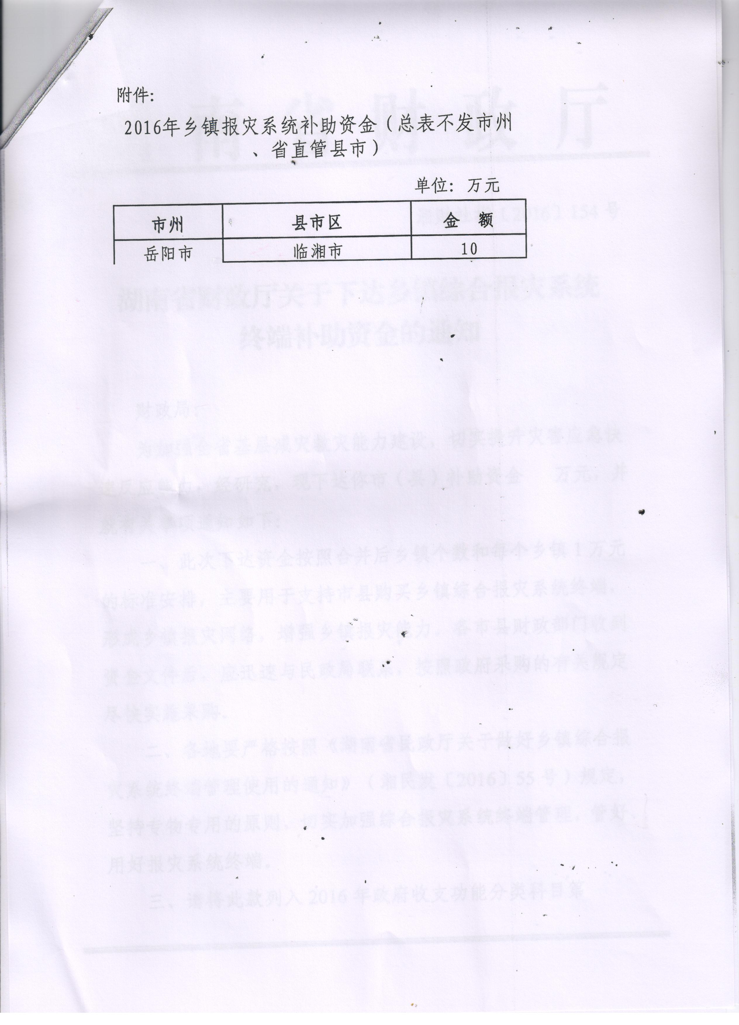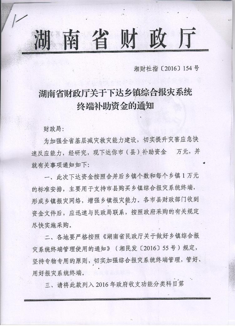 湖南省财政厅关于下达乡镇综合报灾系统终端补助资金的通知