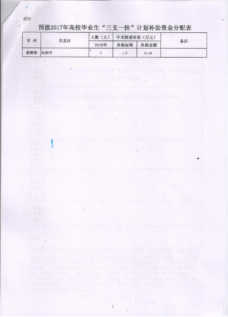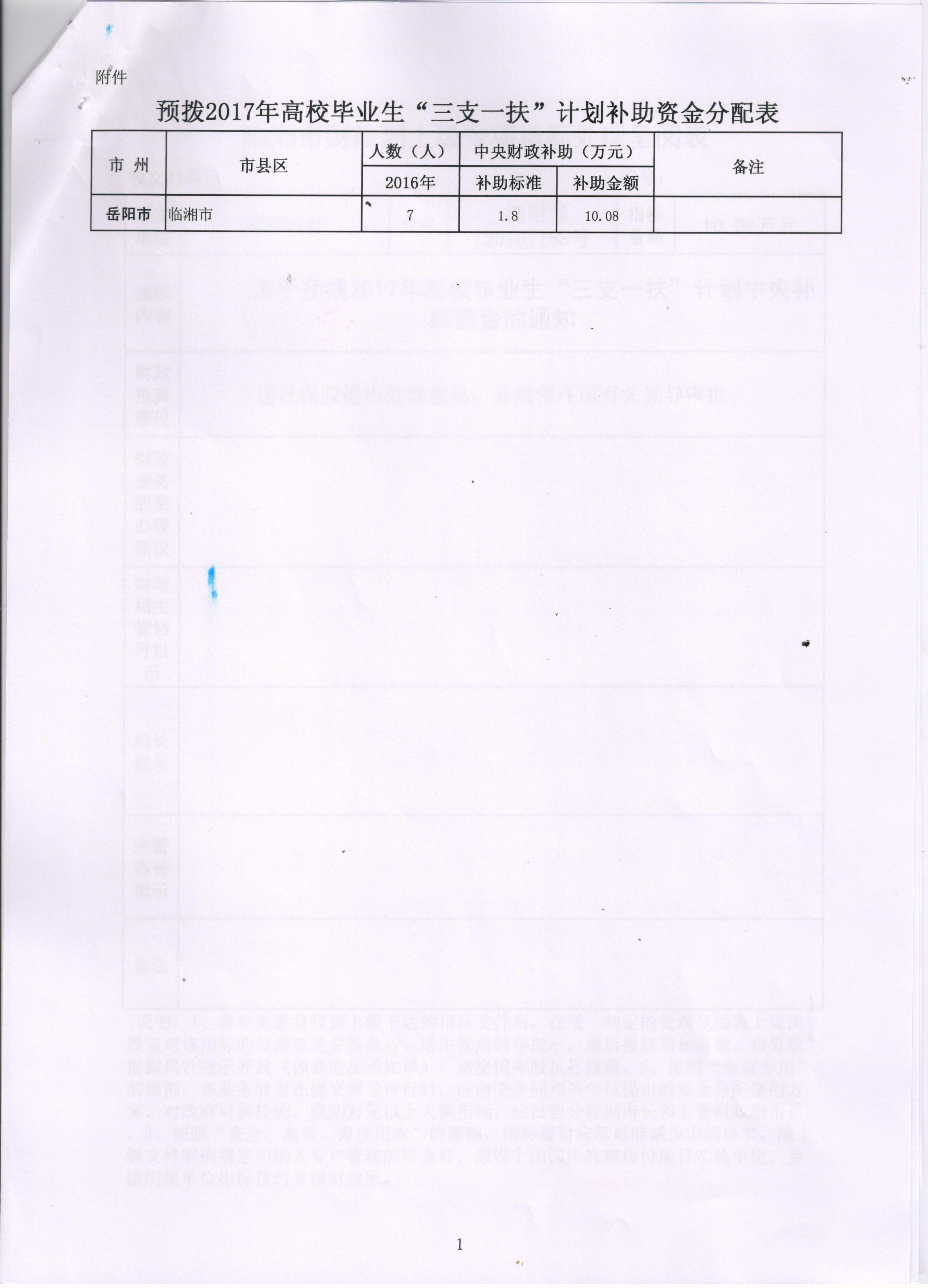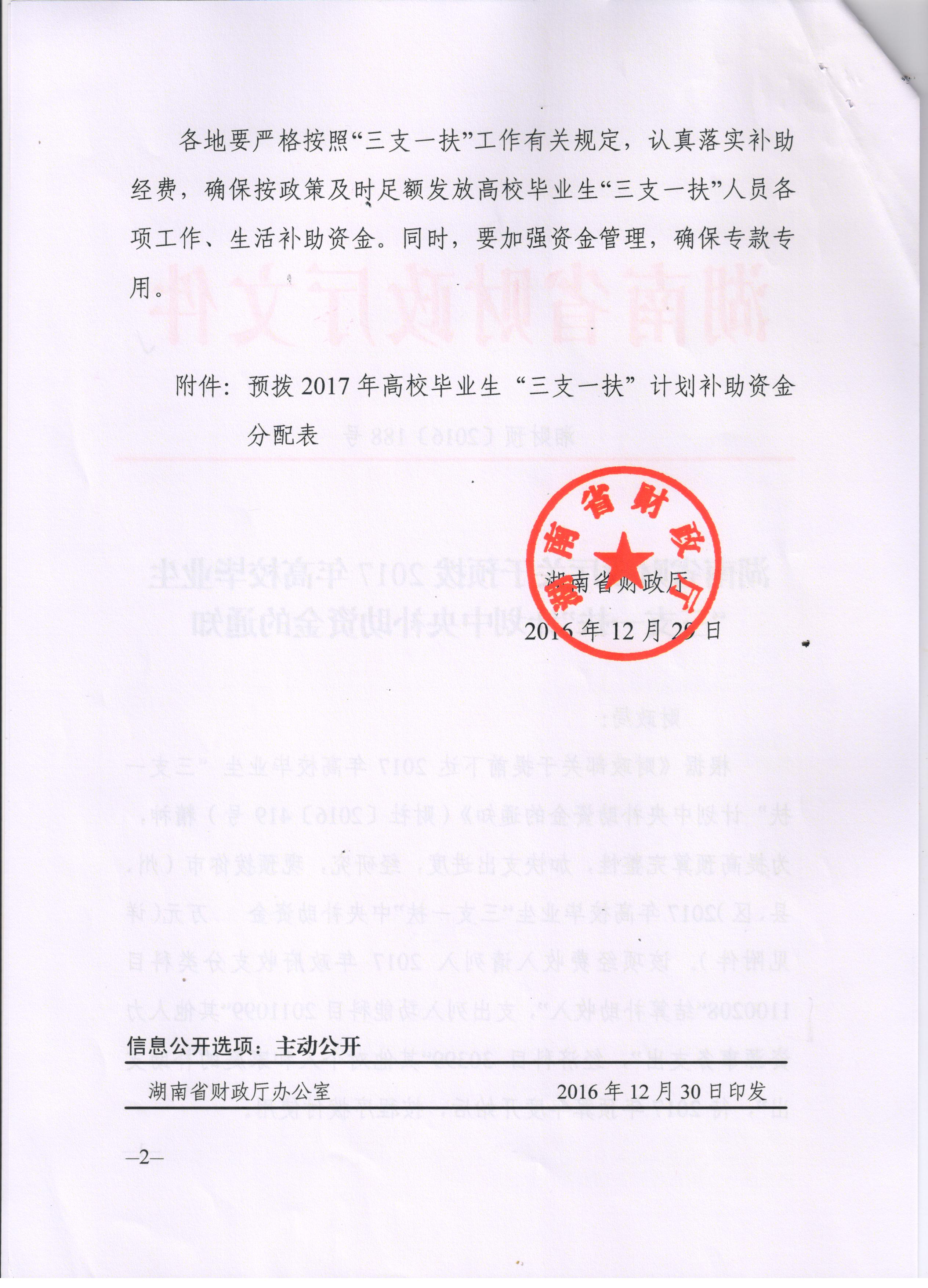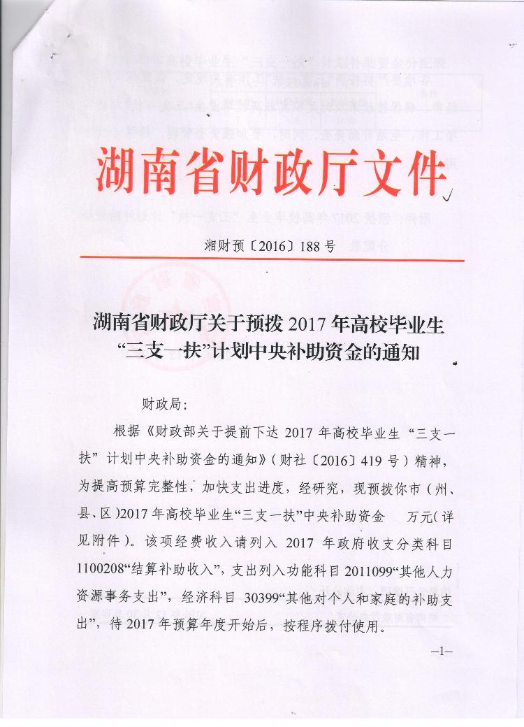 湖南省财政厅关于预拨2017年高校毕业生“三支一扶”计划中央补助资金的通知
