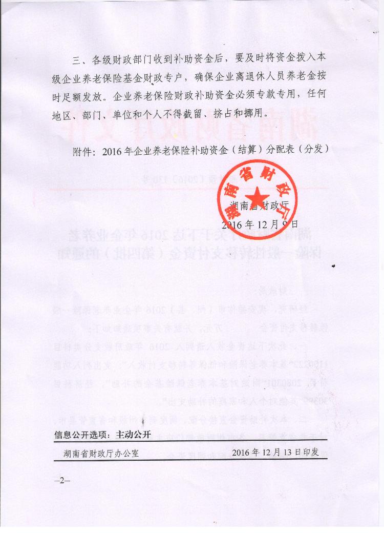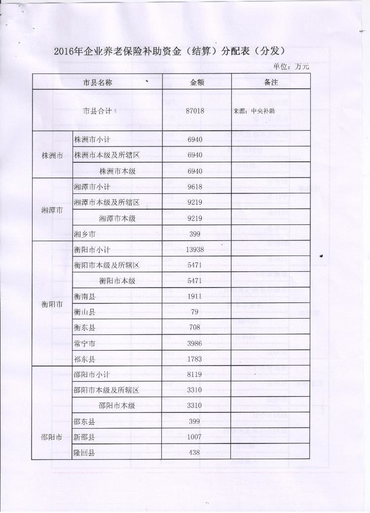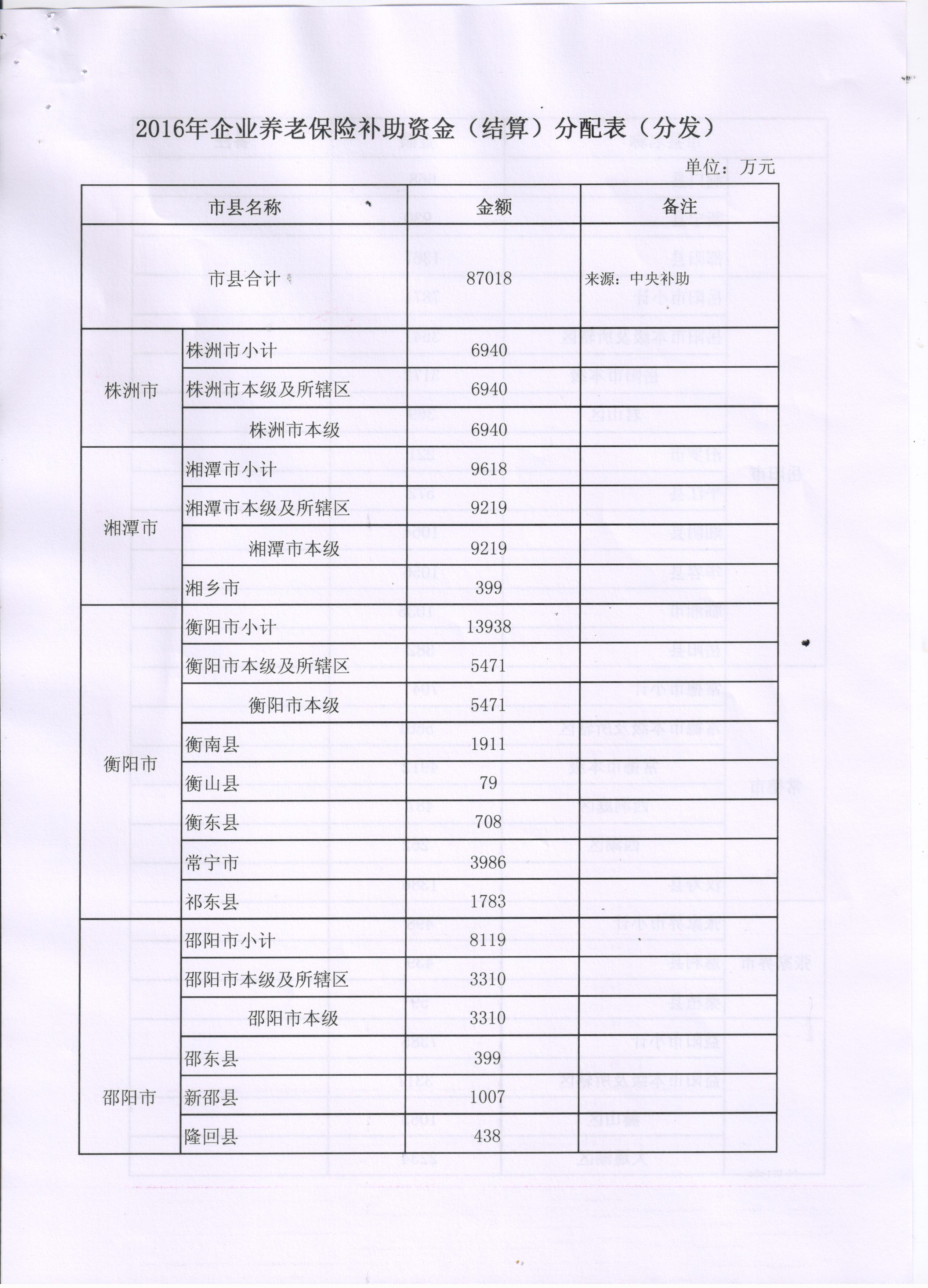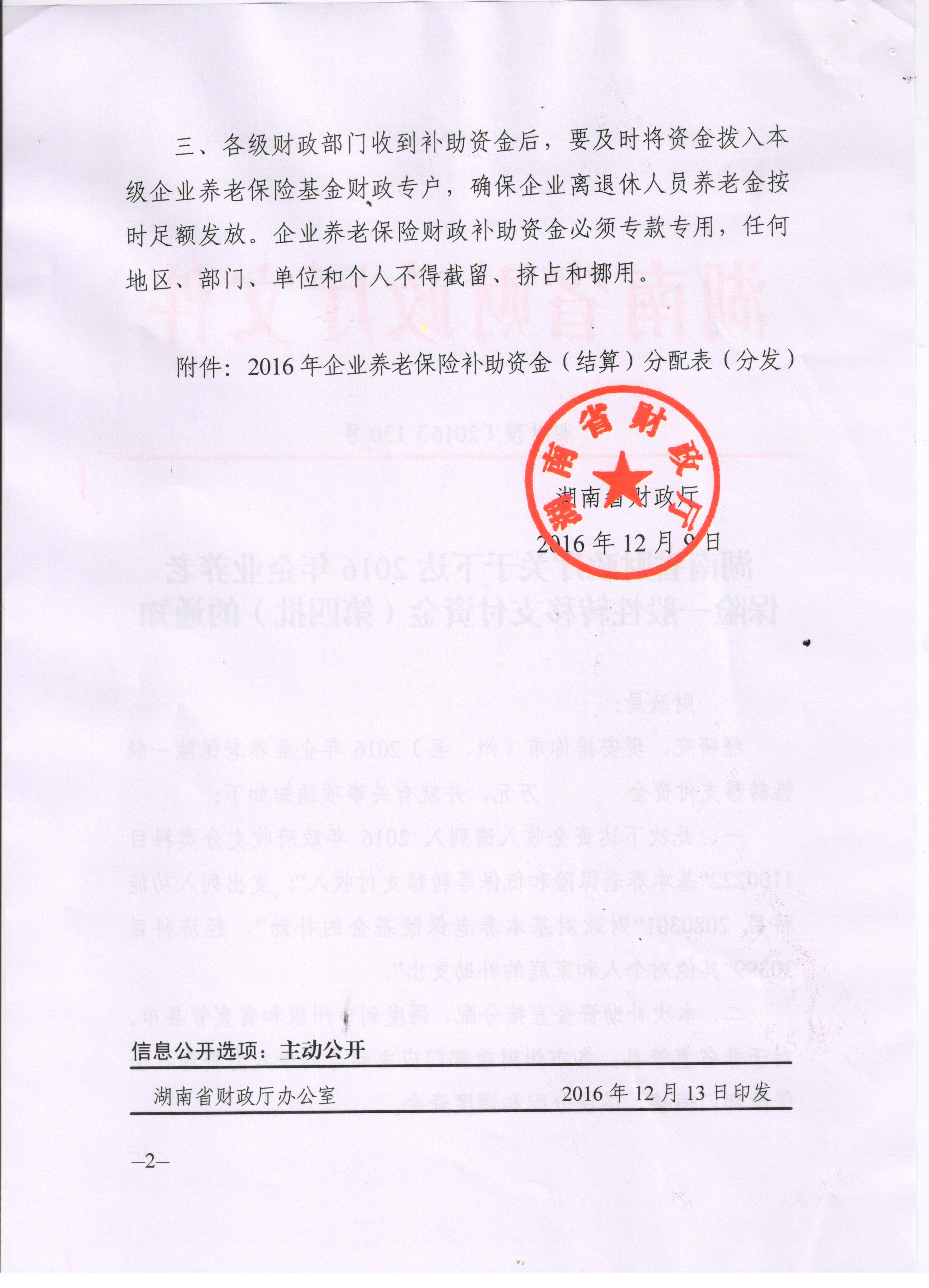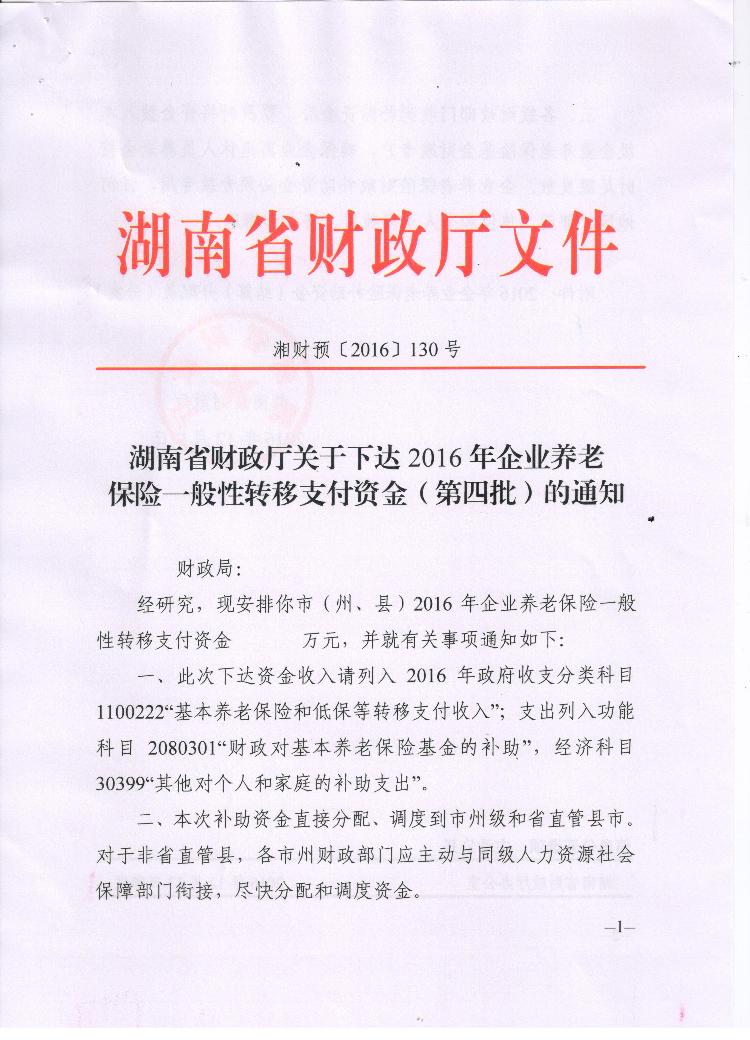 湖南省财政厅关于下达2016年企业养老保险一般性转移支付资金的通知