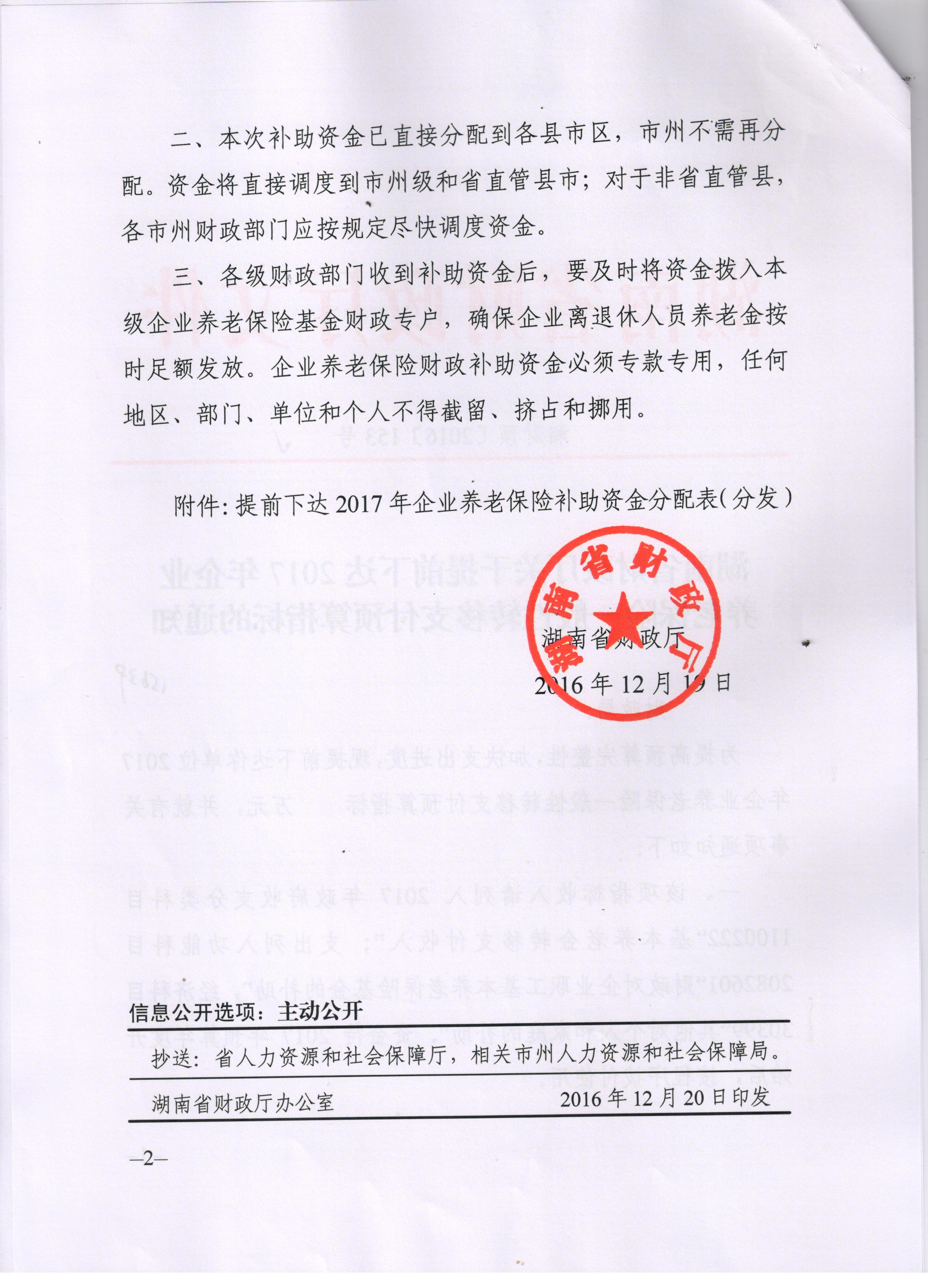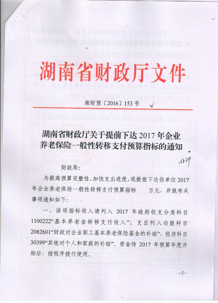 湖南省财政厅关于提前下达2017年企业养老保险一般性转移支付预算指标的通知