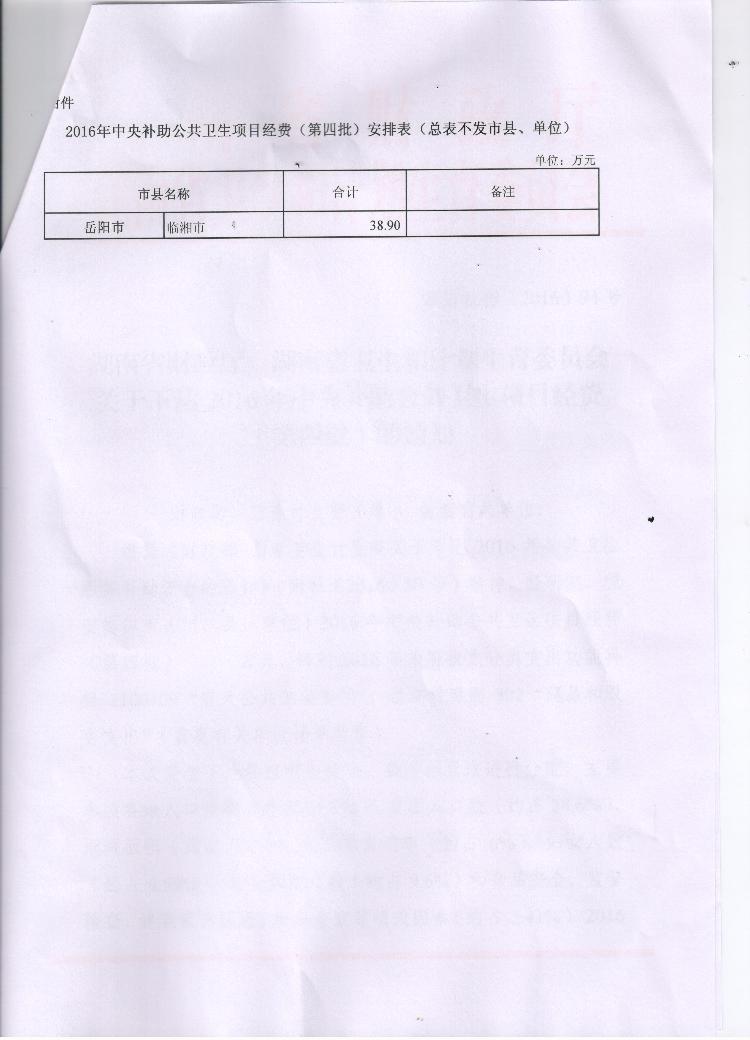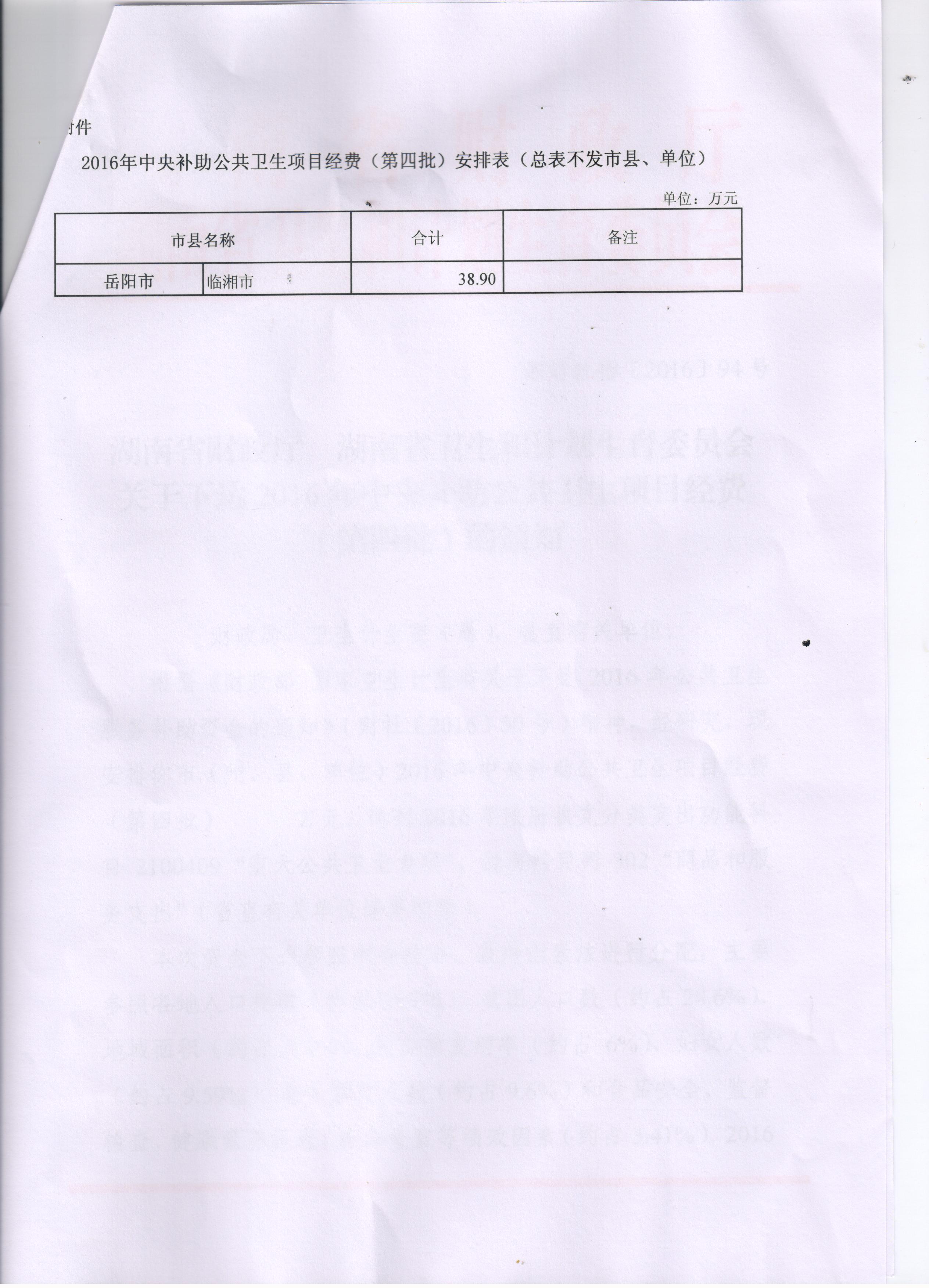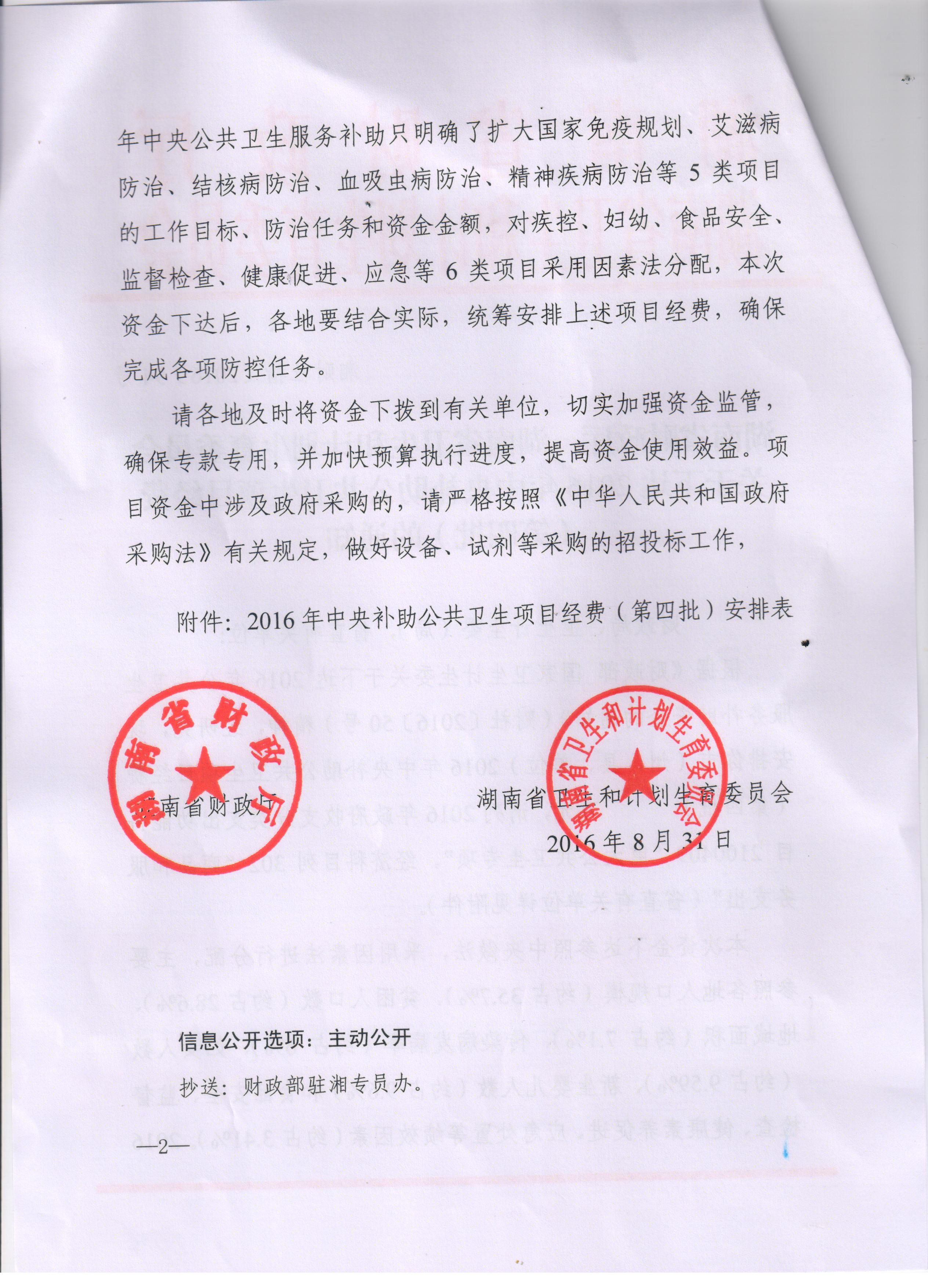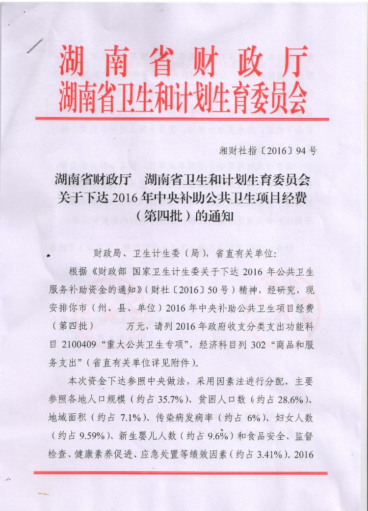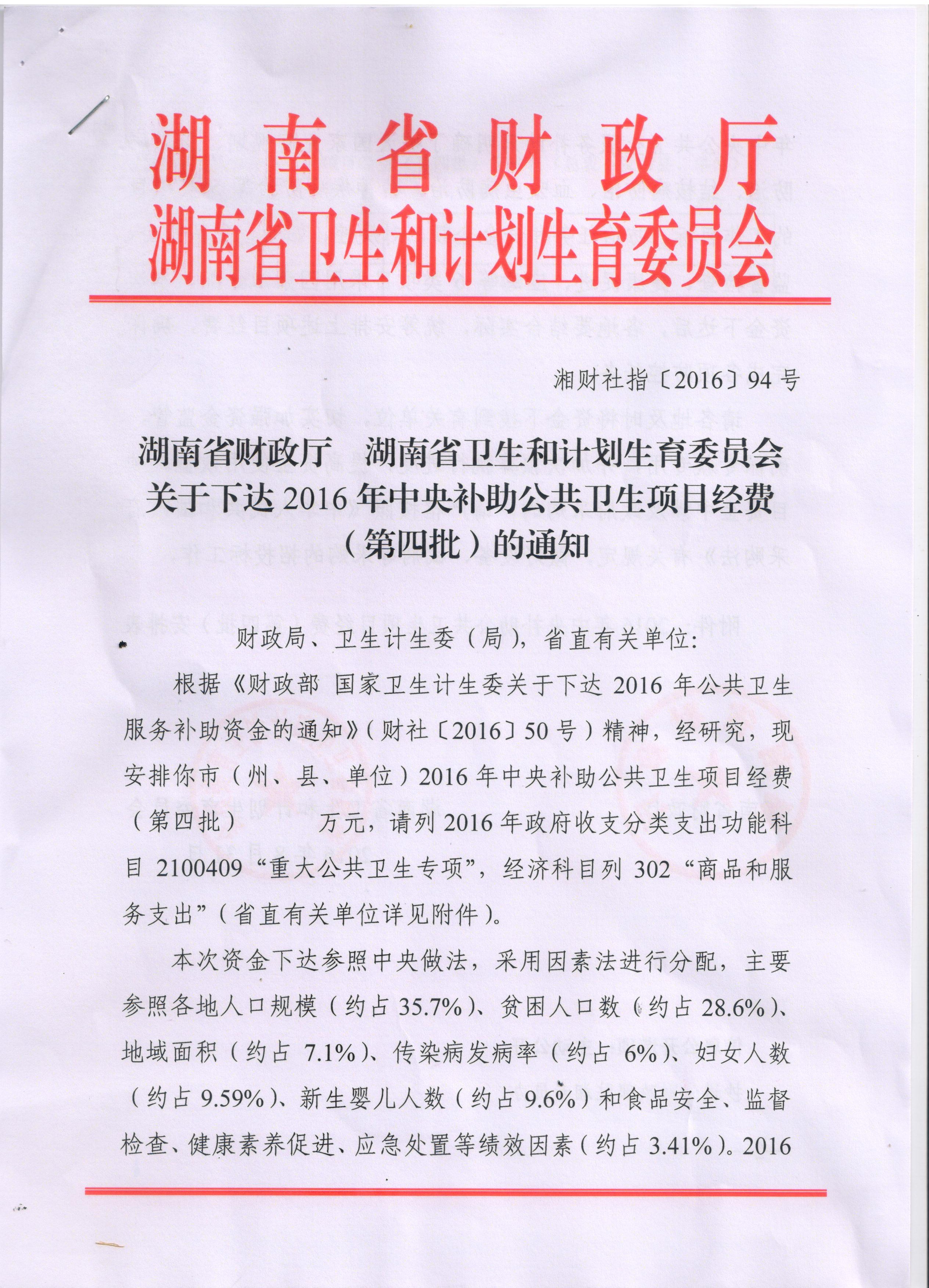 湖南省财政厅 湖南省卫生和计划生育委员会关于下达2016年中央补助公共卫生顶目经费(第四批)的通知