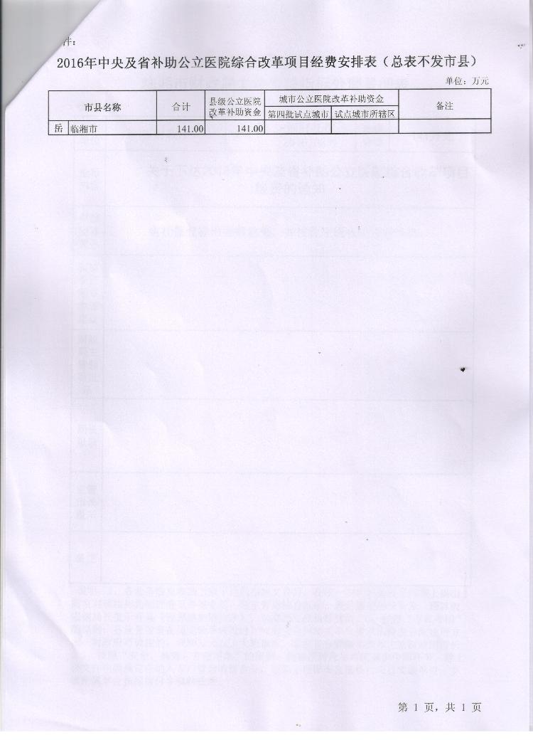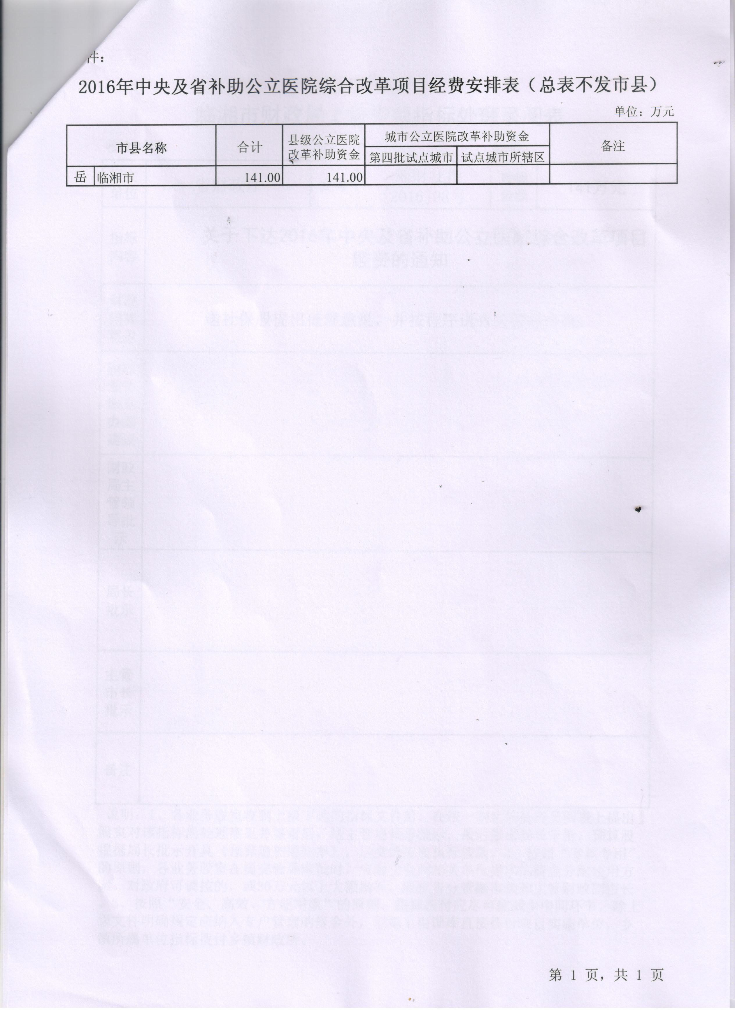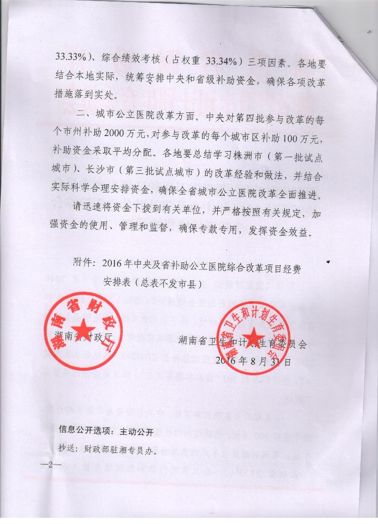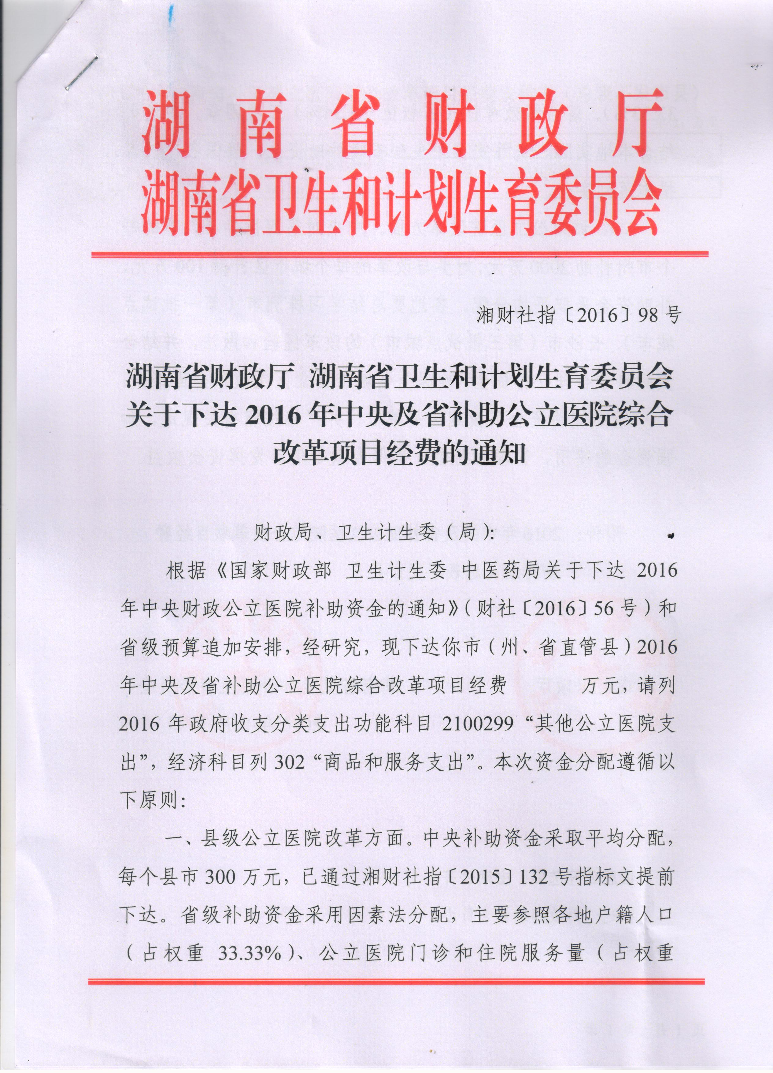 湖南省财政厅 湖南省卫生和计划生育委员会关于下达2016年中央及省补助公立院综合改革项目经费的通知
