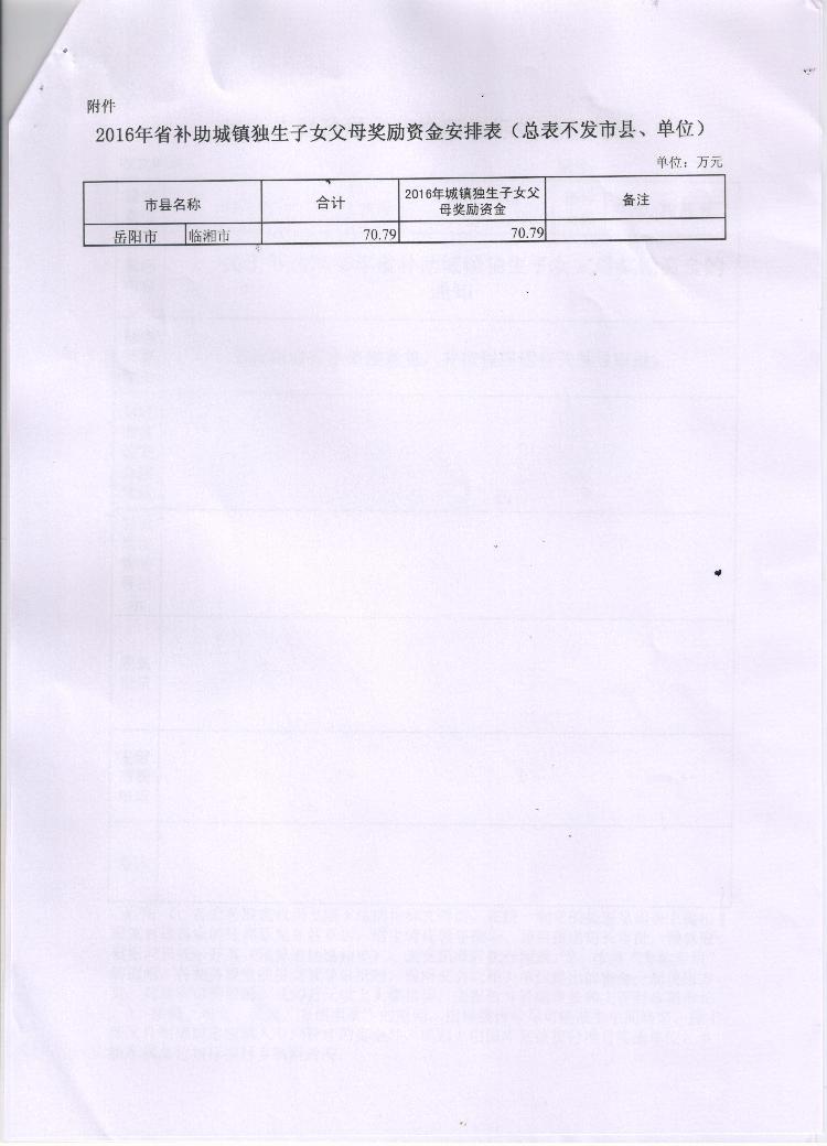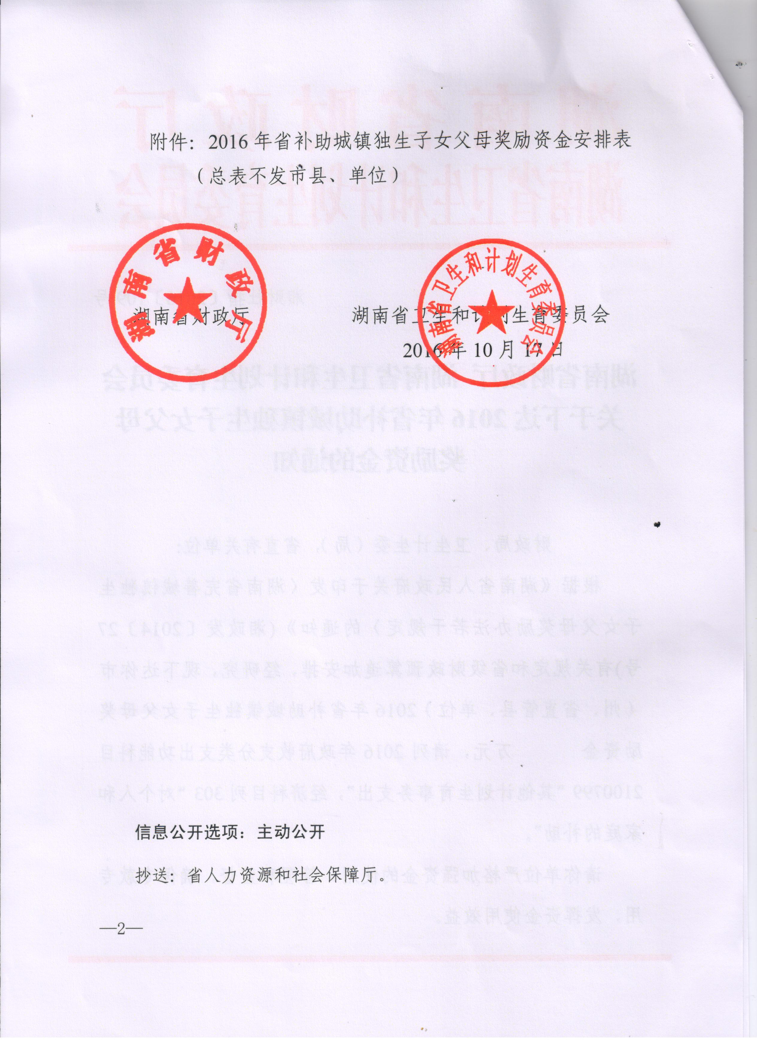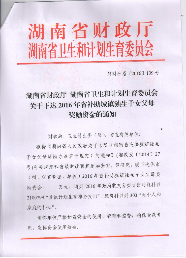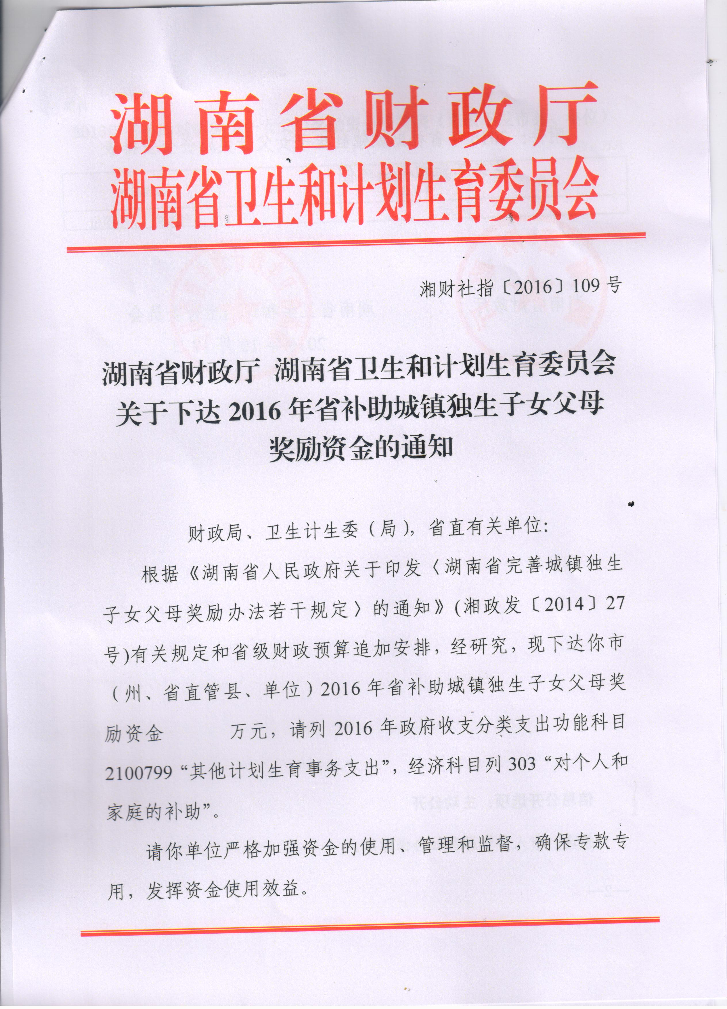 湖南省财政厅 湖南省卫生和计划生育委员会关于下达2016年省补助城镇独生子女父母奖励资金的通知