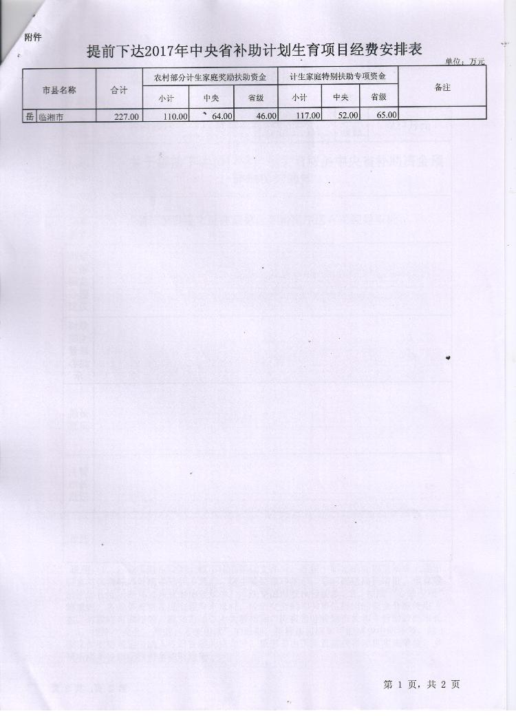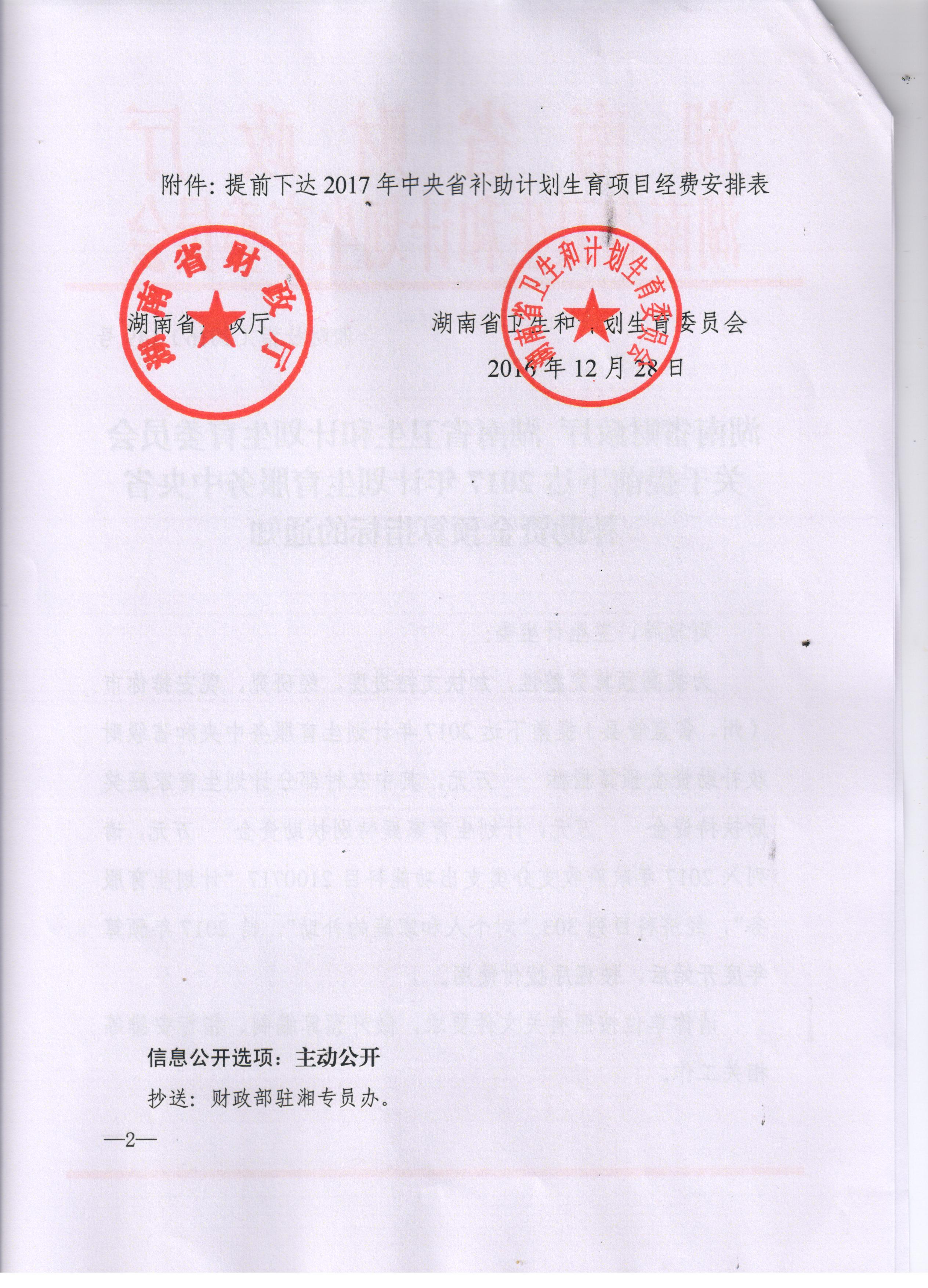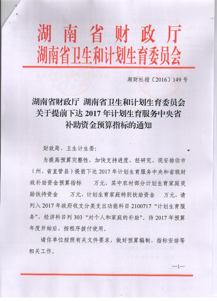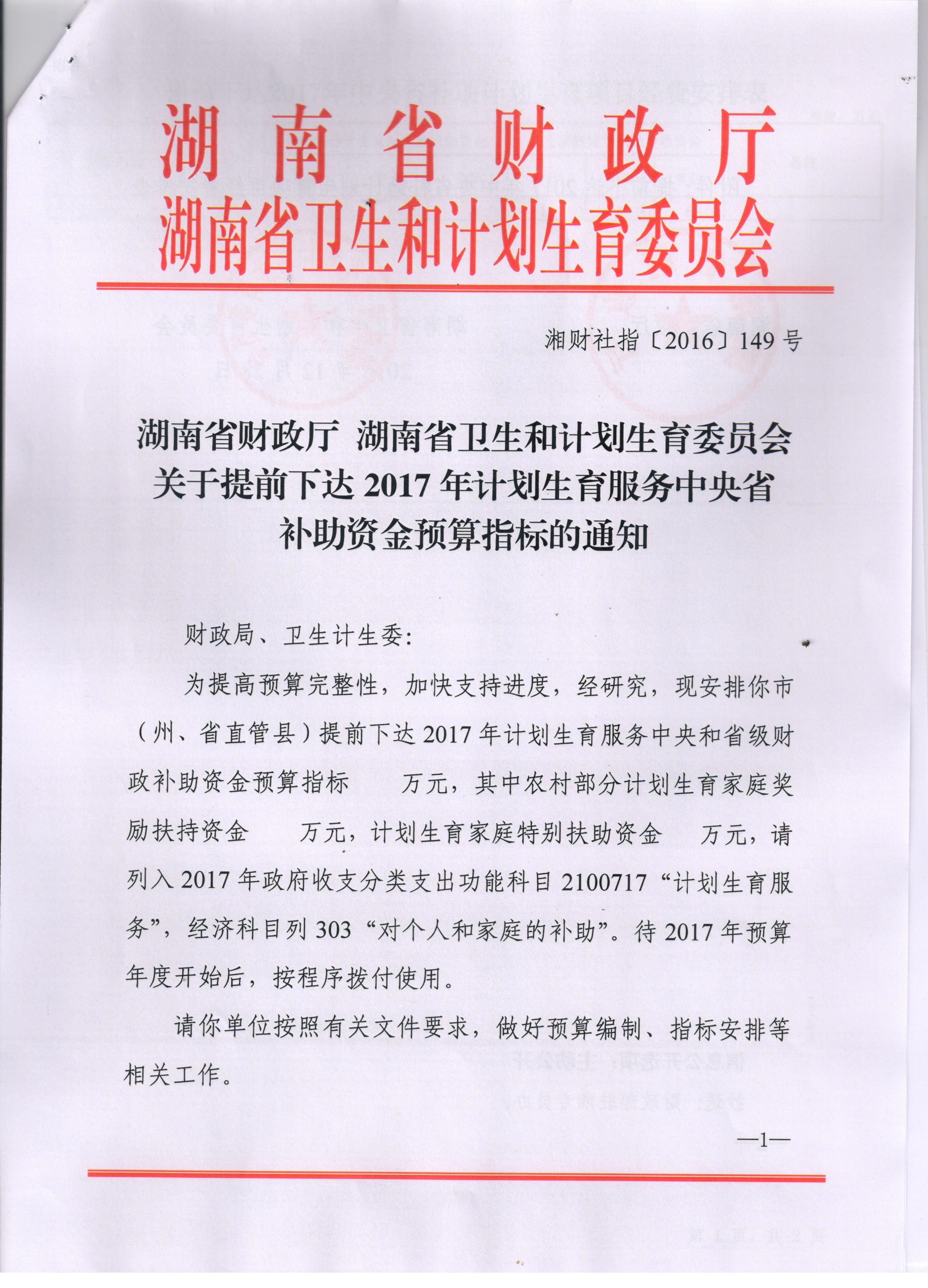 湖南省财政厅 湖南省卫生和计划生育委员会关于提前下达2017年计划生服务中央省补助资金预算指标的通知