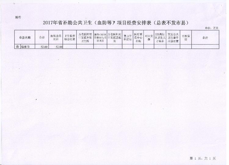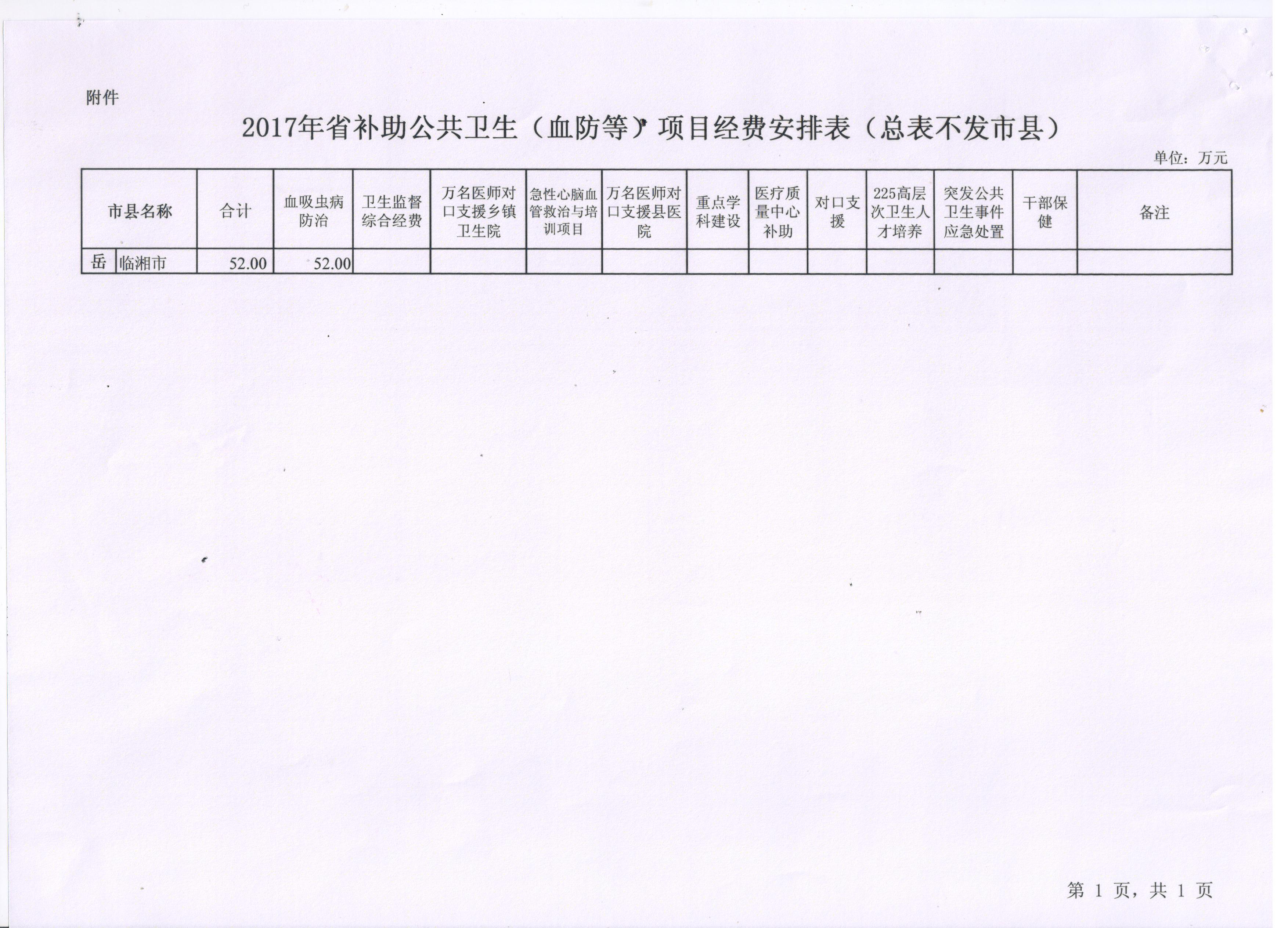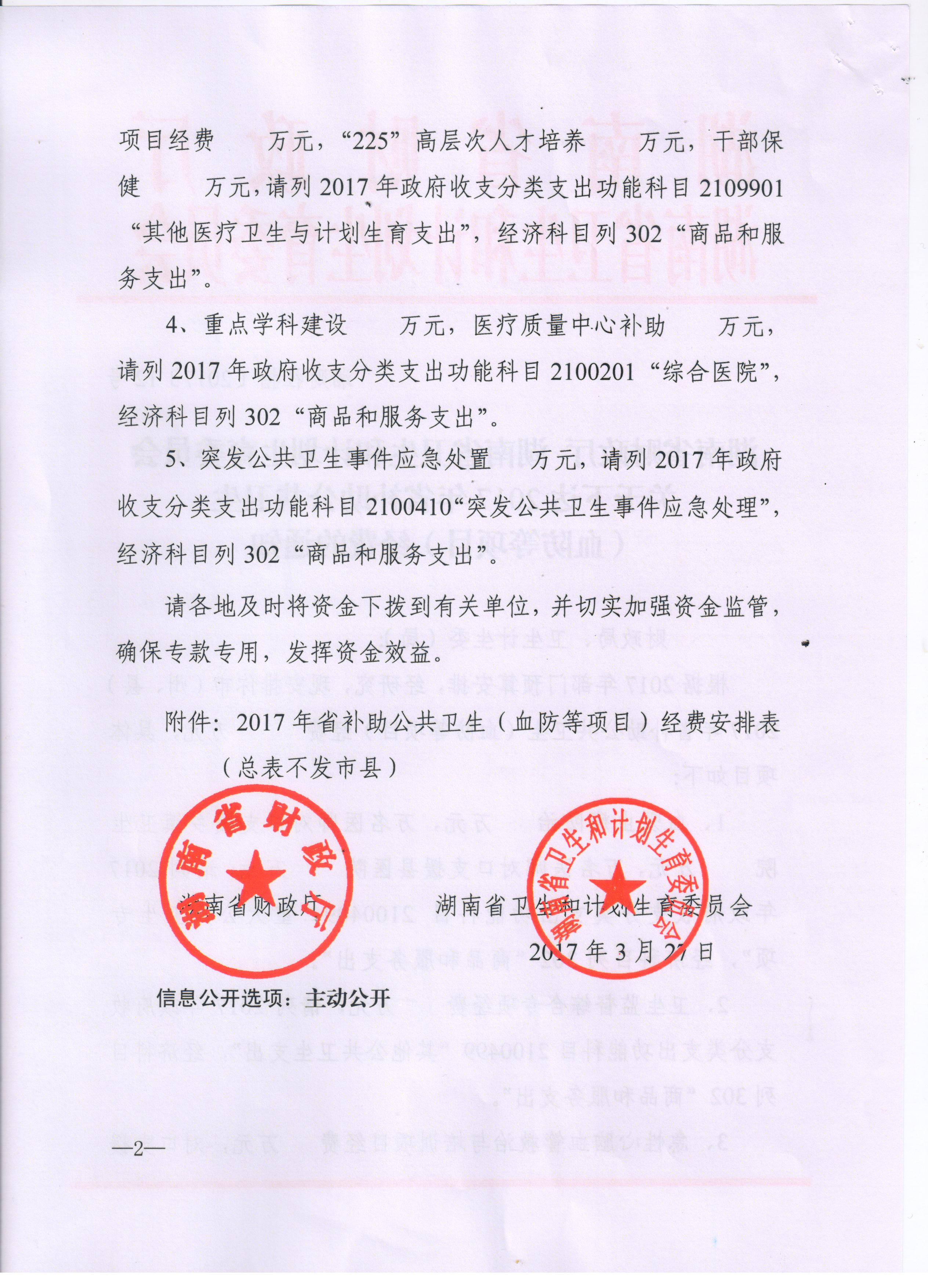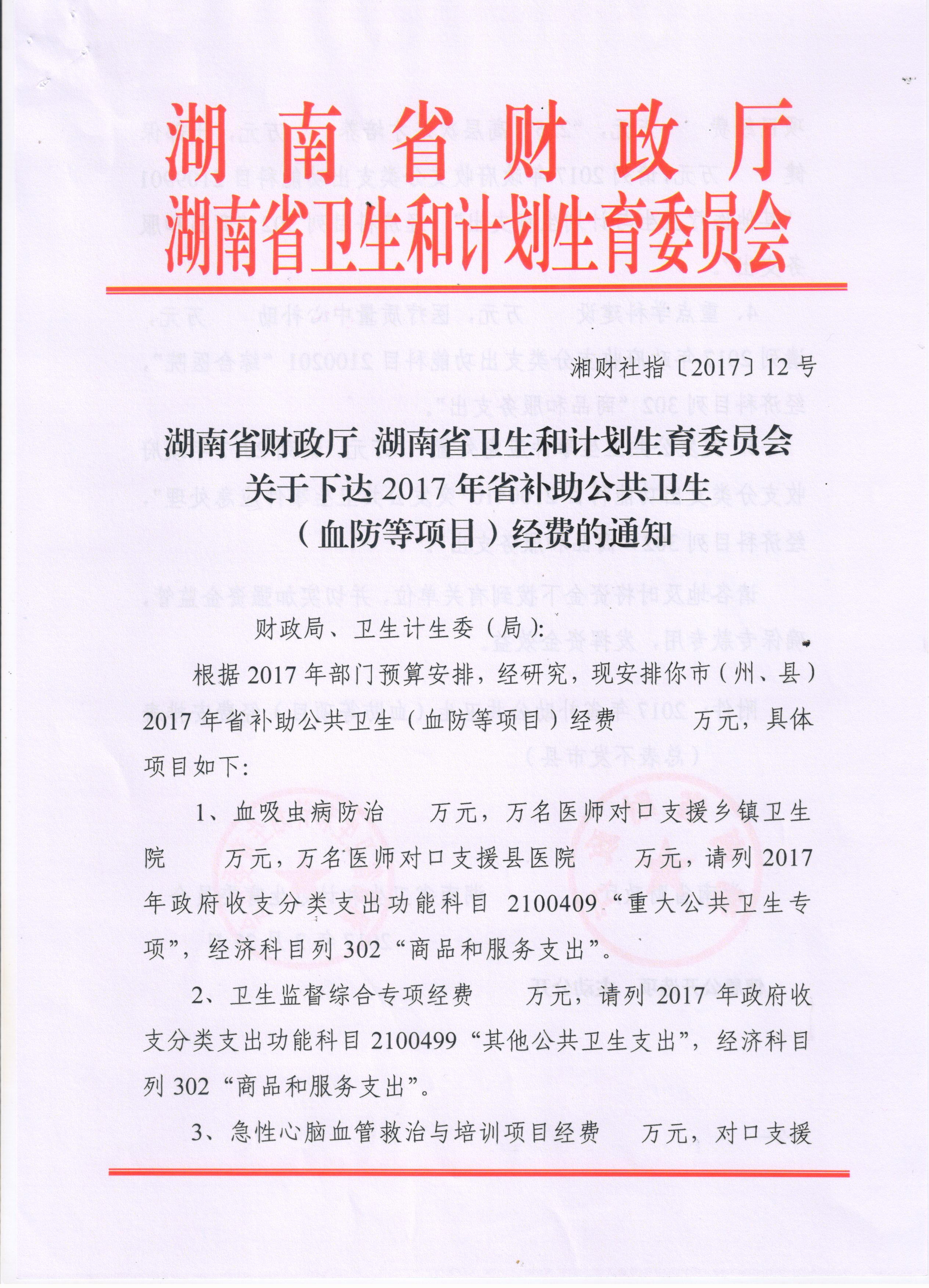 湖南省财政厅 湖南省卫生和计划生育委员会关于下达2017年省补助公共卫生(血防等项目)经费的通知