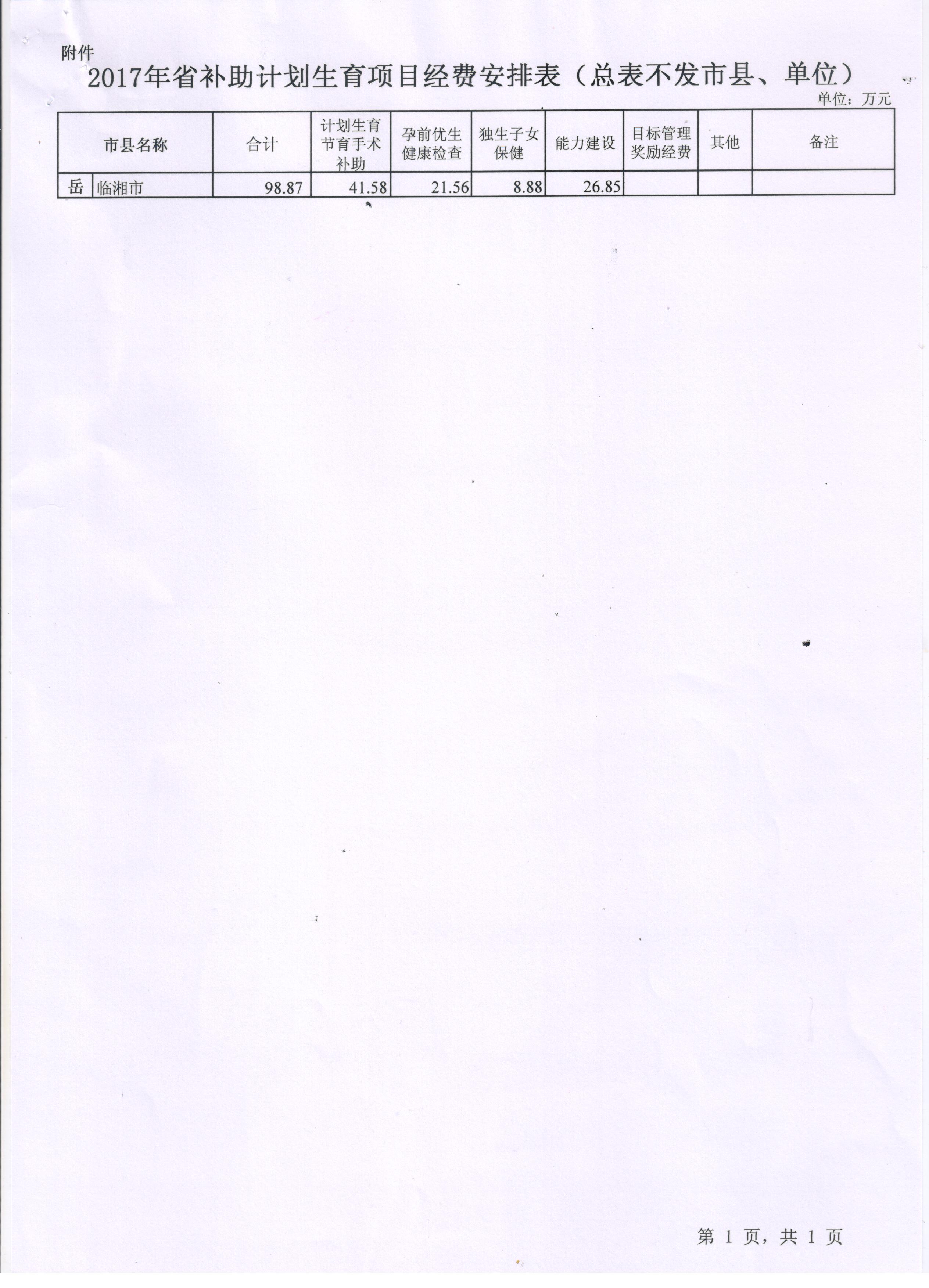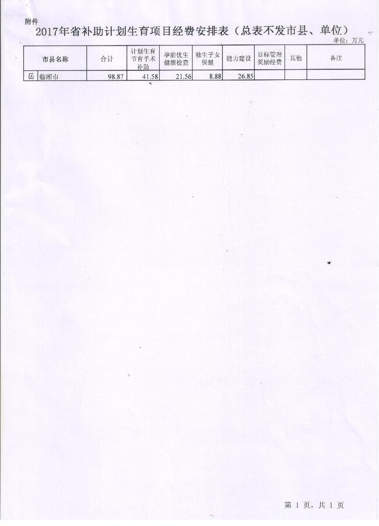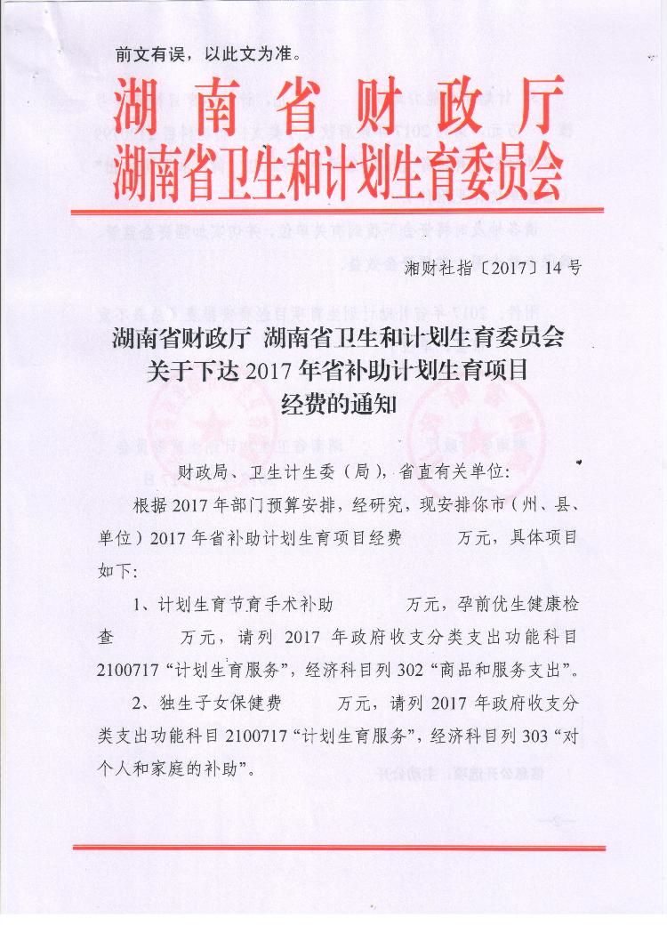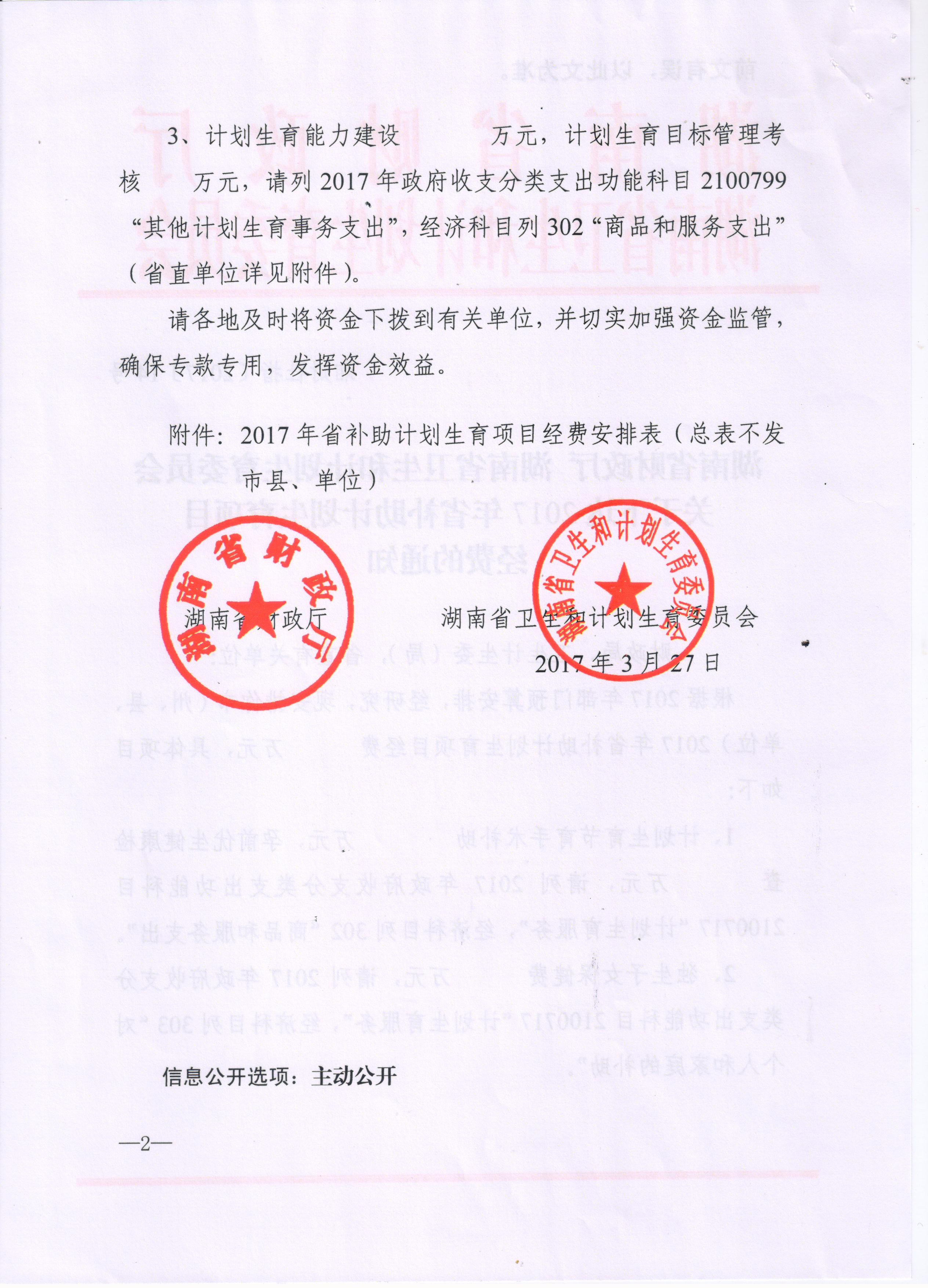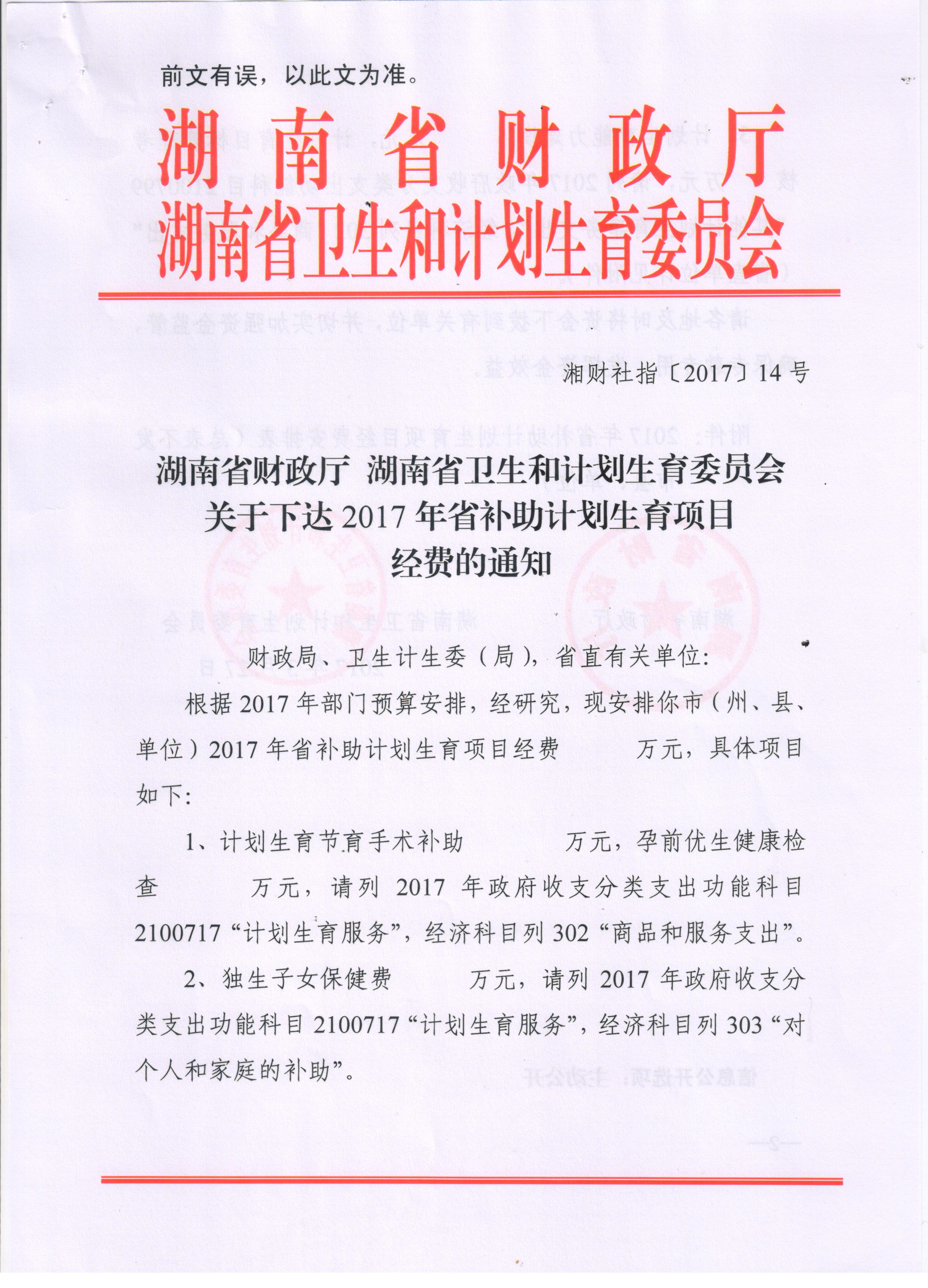 湖南省财政厅 湖南省卫生和计划生育委员会关于下达2017年省补助计划生育项目经费的通知