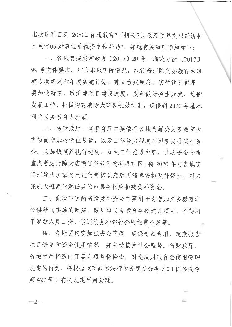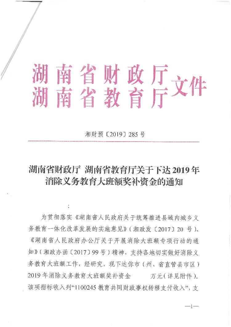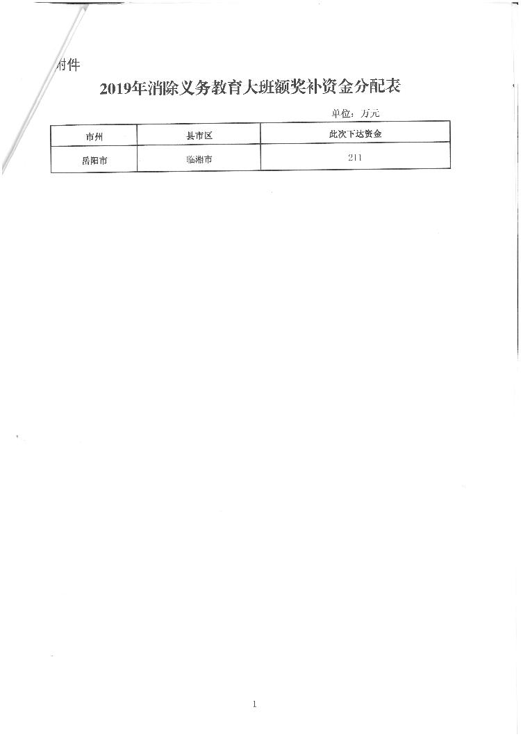 关于下达2019年消除义务教育大班额奖补资金的通知