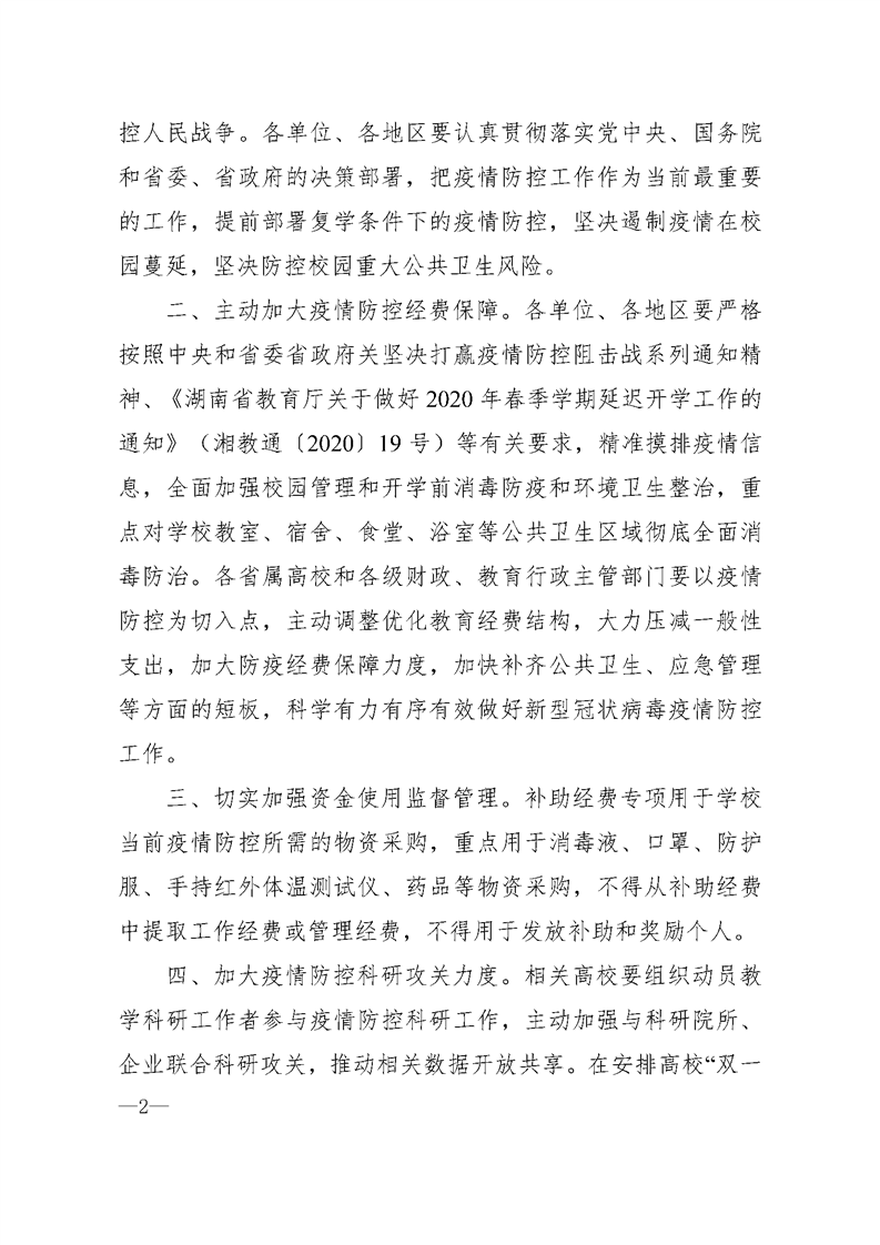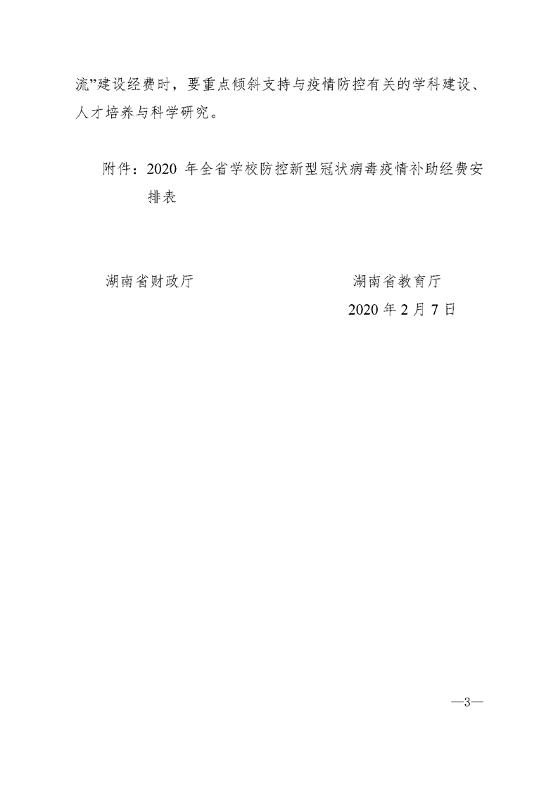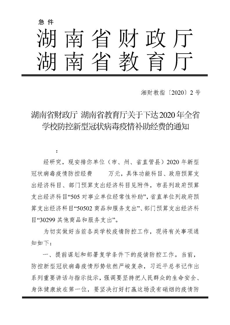 湖南省财政厅 湖南省教育厅关于下达2020年全省学校防控新型冠状病毒疫情补助经费的通知