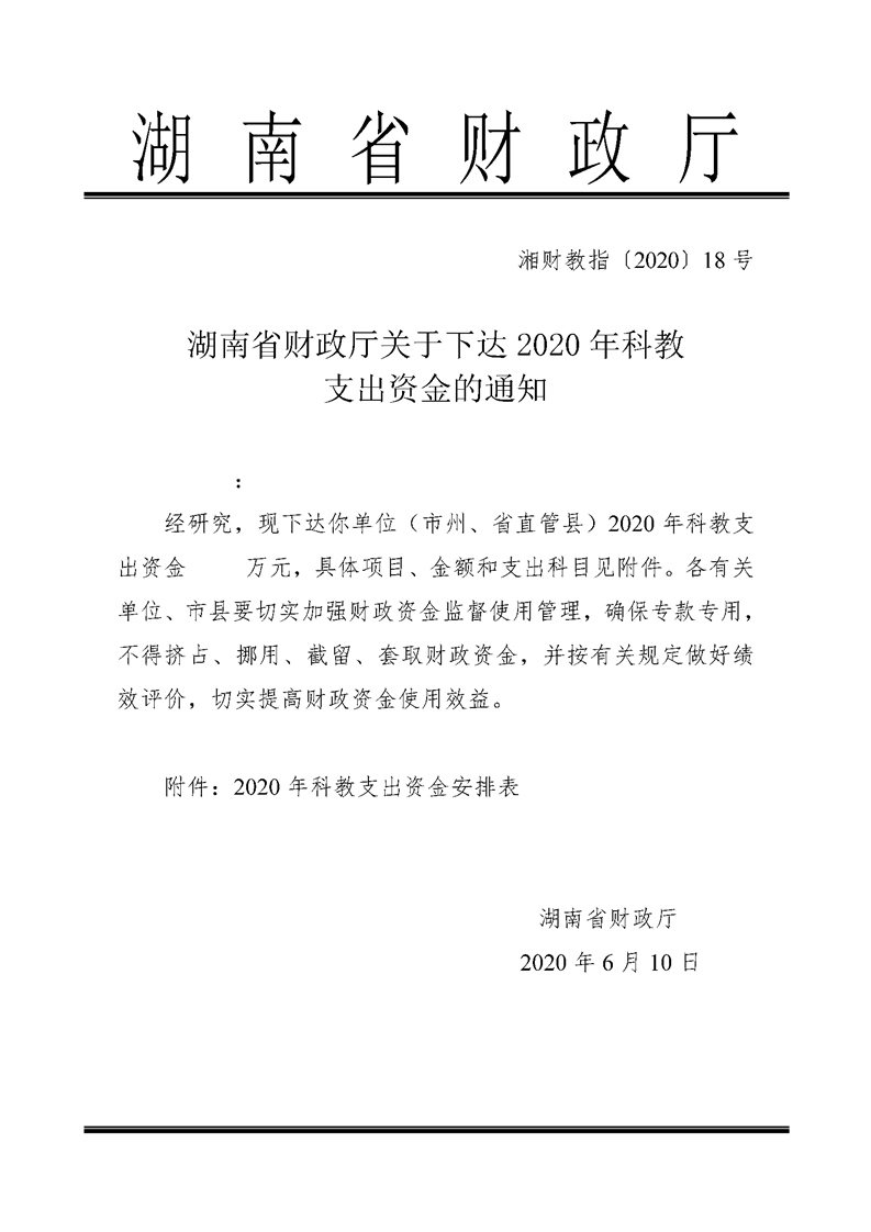 湖南省财政厅关于下达2020年科教支出资金的通知