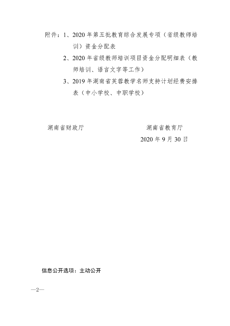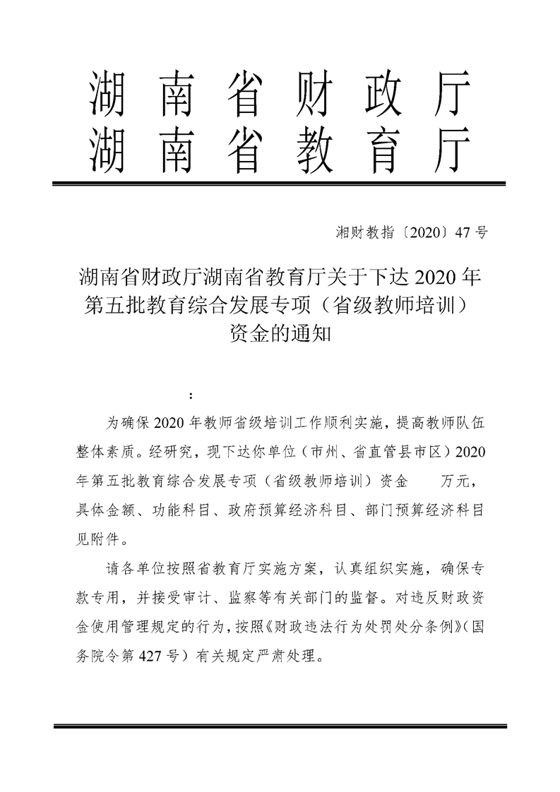 湖南省财政厅湖南省教育厅关于下达2020年第五批教育综合发展专项(省级教师培训)资金的通知