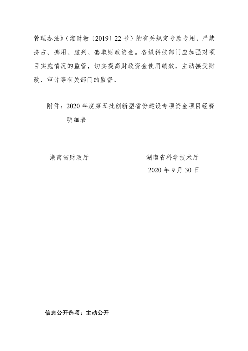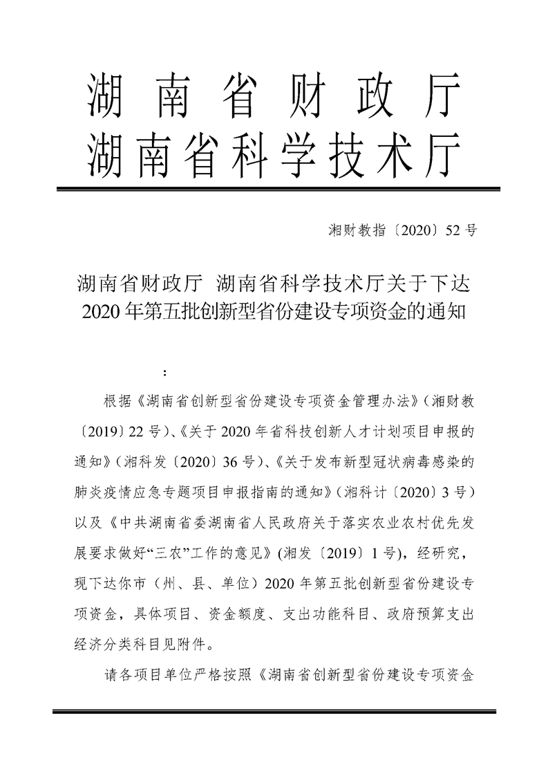 湖南省财政厅 湖南省科学技术厅关于下达2020年第五批创新型省份建设专项资金的通知