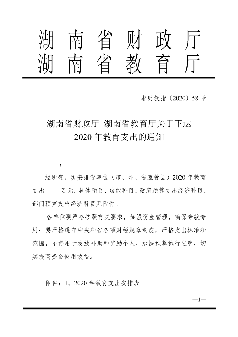 湖南省财政厅 湖南省教育厅关于下达2020年教育支出的通知