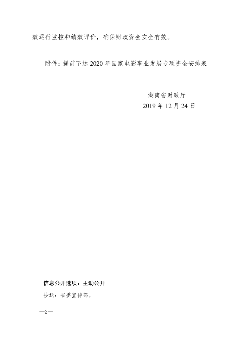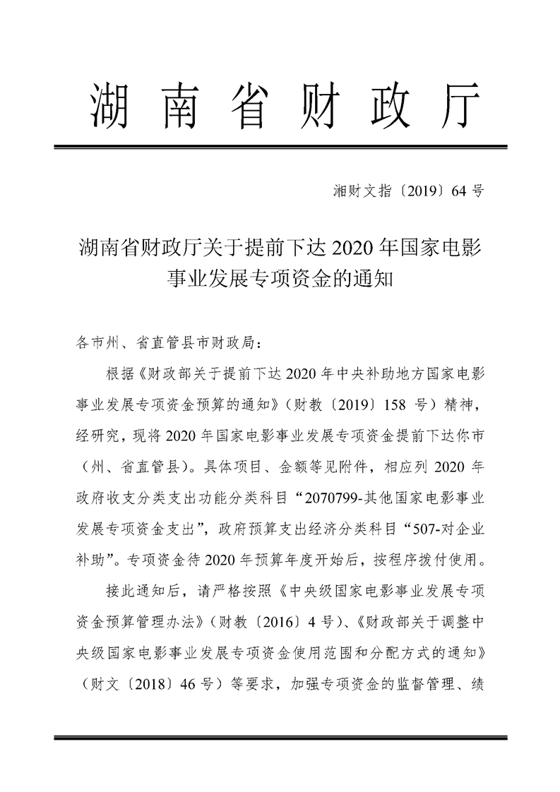 湖南省财政厅关于提前下达2020年国家电影事业发展专项资金的通知