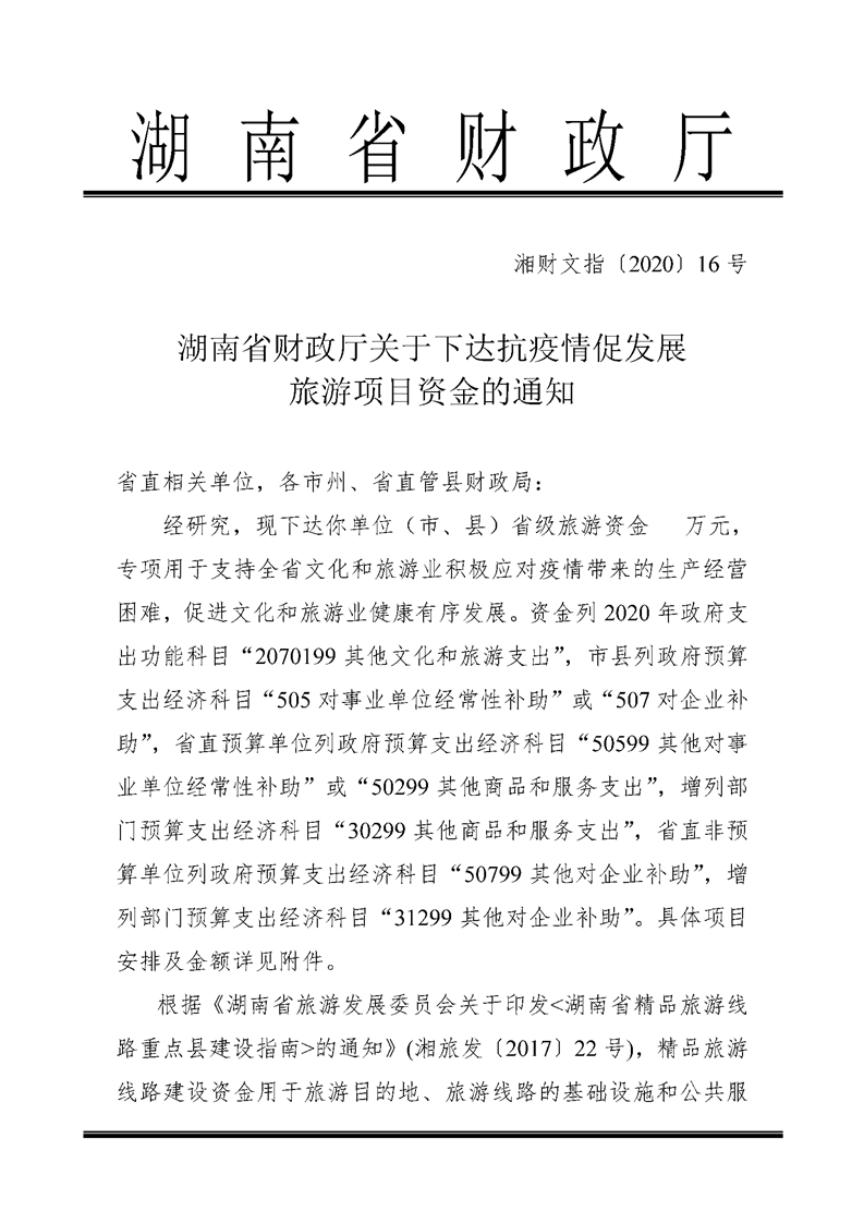 湖南省财政厅关于下达抗疫情促发展旅游项目资金的通知