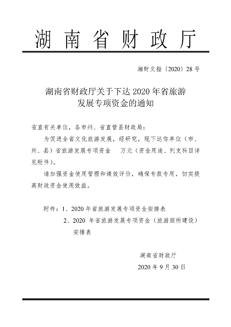 湖南省财政厅关于下达2020年省旅游发展专项资金的通知