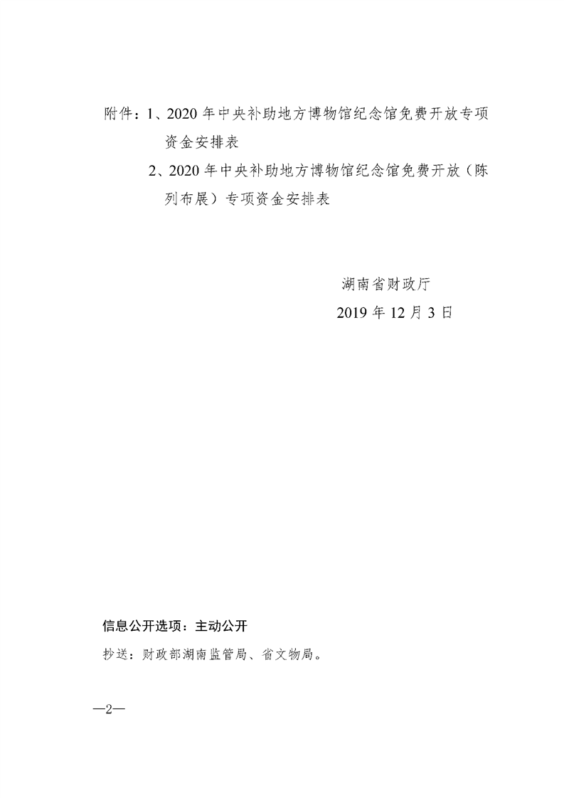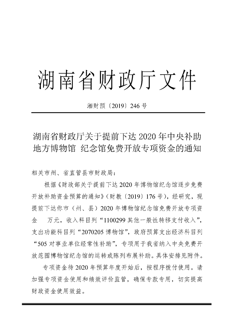 湖南省财政厅关于提前下达2020年中央补助地方博物馆纪念馆免费开放专项资金的通知