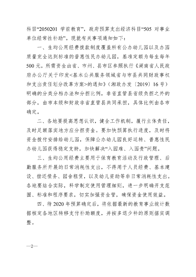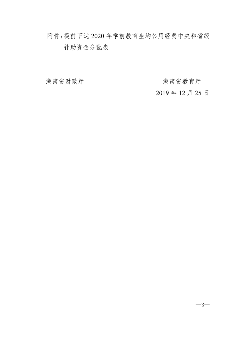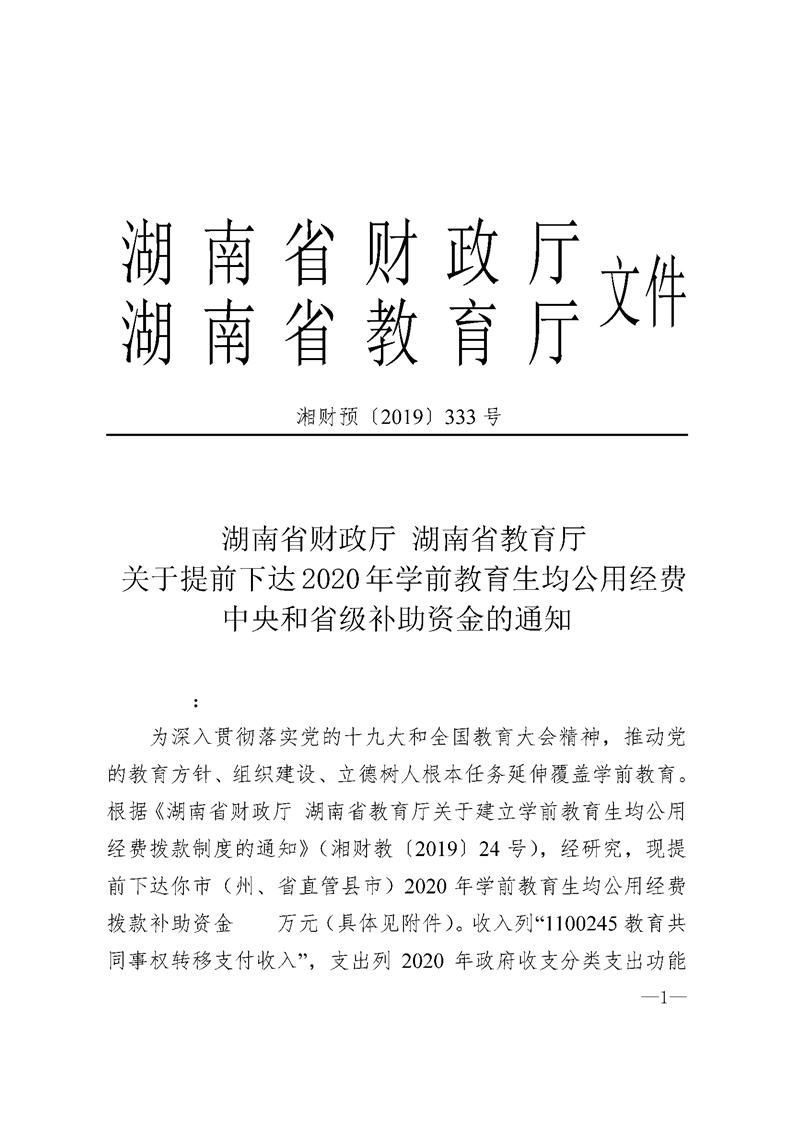 湖南省财政厅 湖南省教育厅关于提前下达2020年学前教育生均公用经费中央和省级补助资金的通知