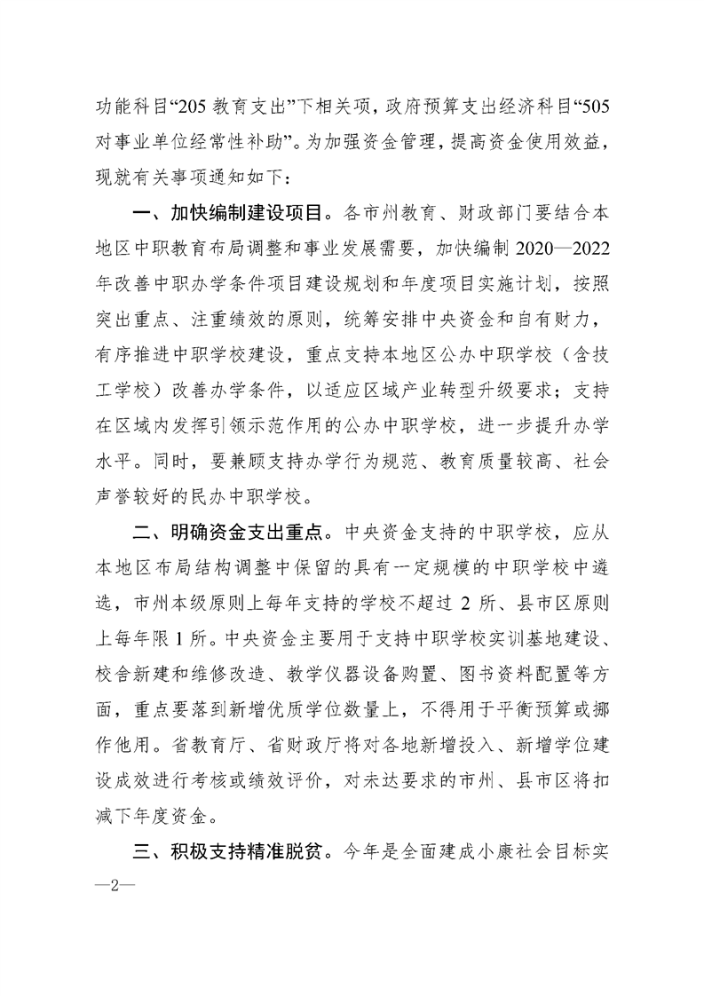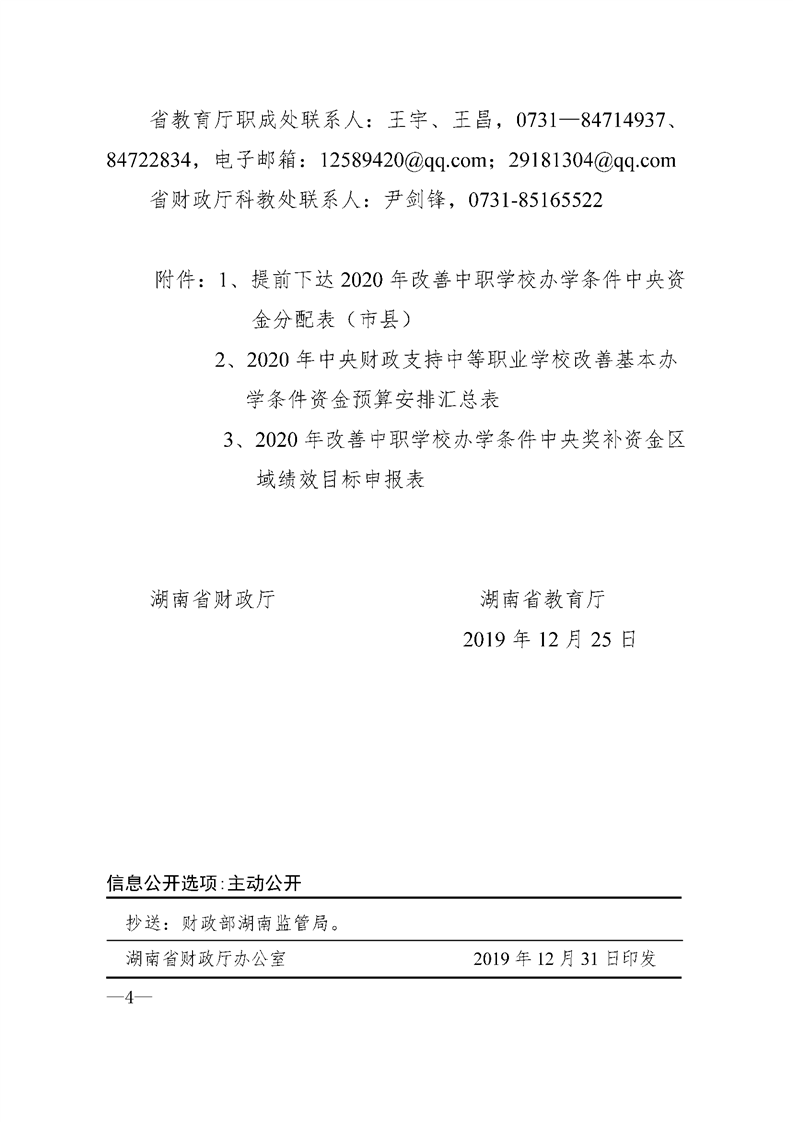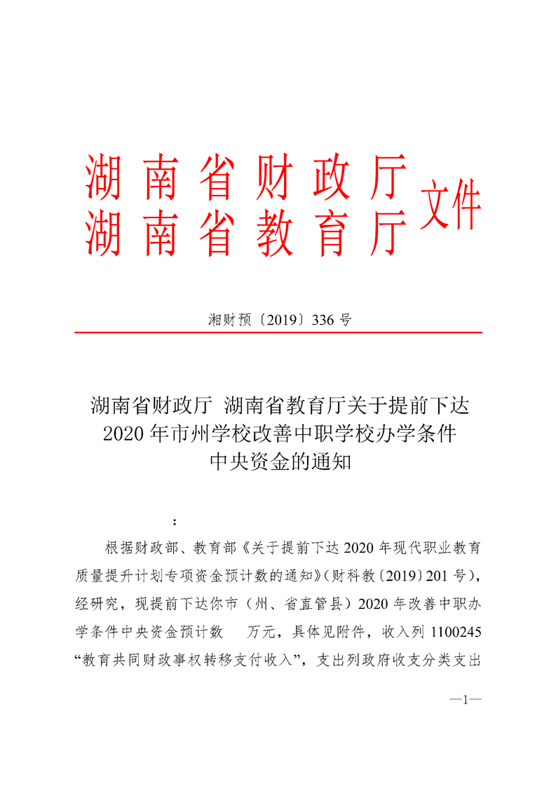 湖南省财政厅 湖南省教育厅关于提前下达2020年市州学校改善中职学校办学条件中央资金的 通知