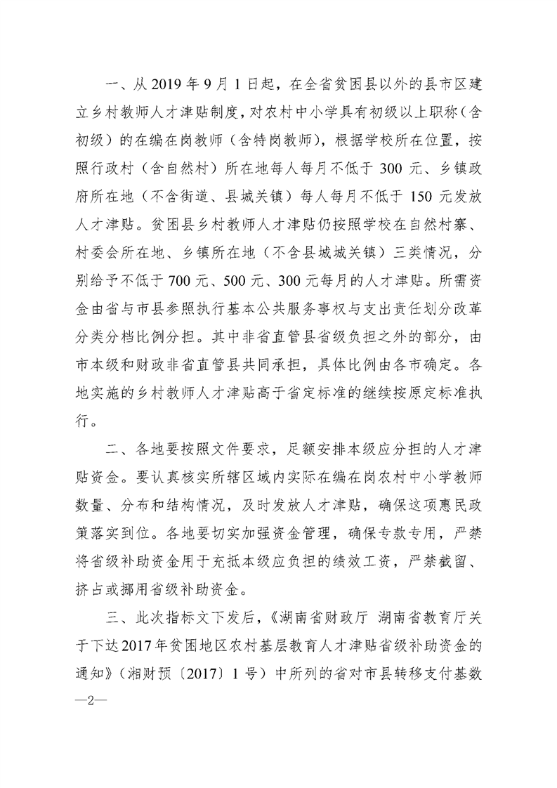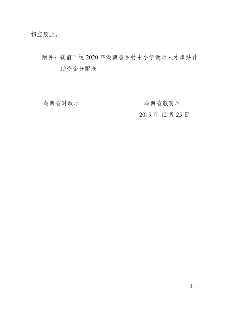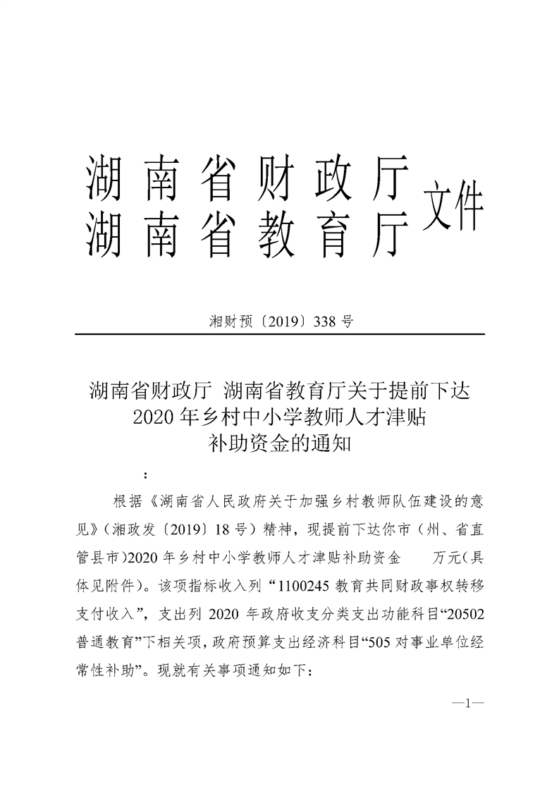 湖南省财政厅 湖南省教育厅关于提前下达2020年乡村中小学教师人才津贴补助资金的通知