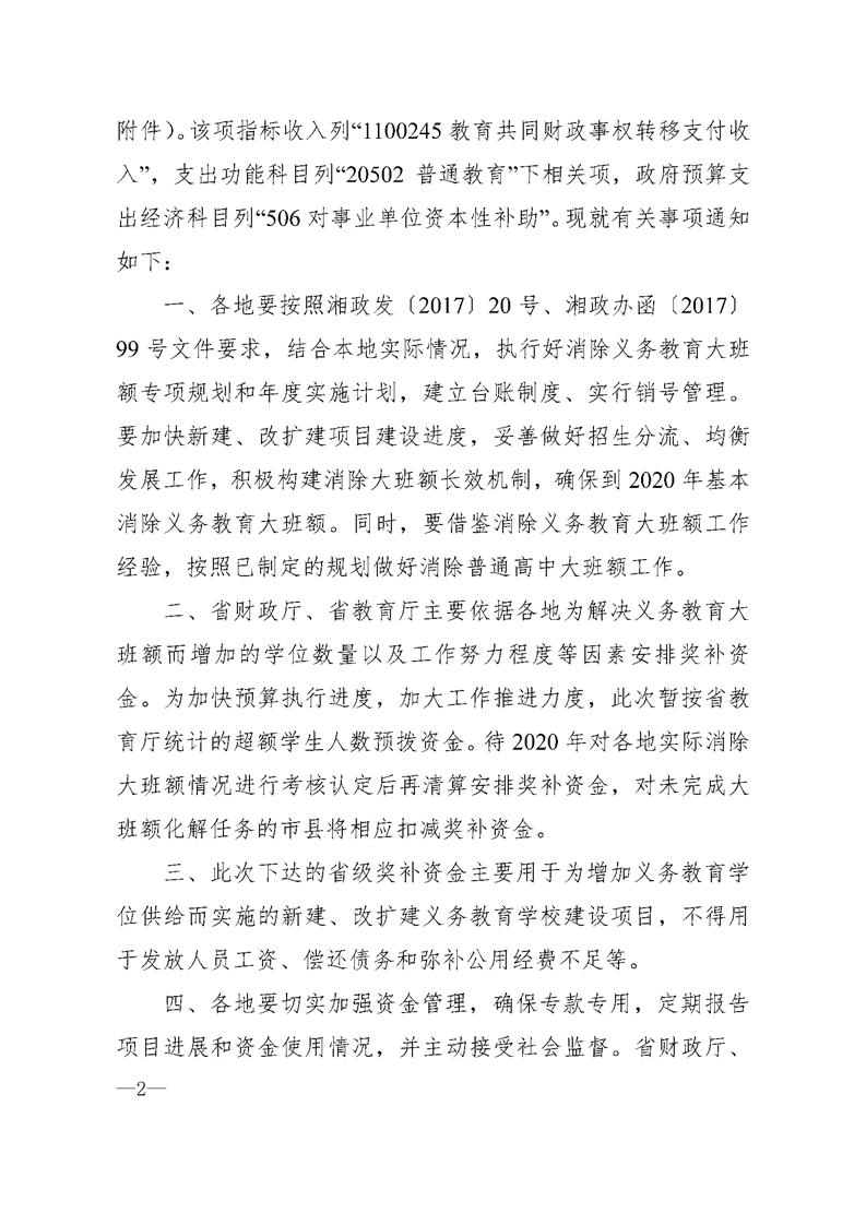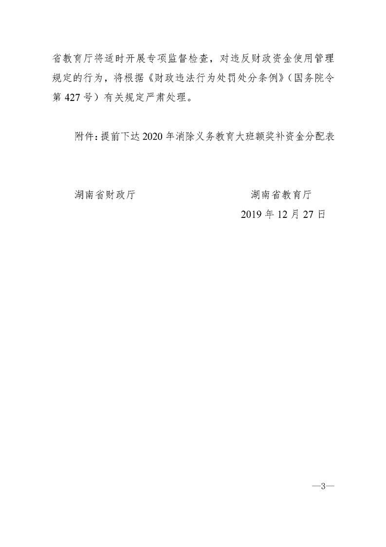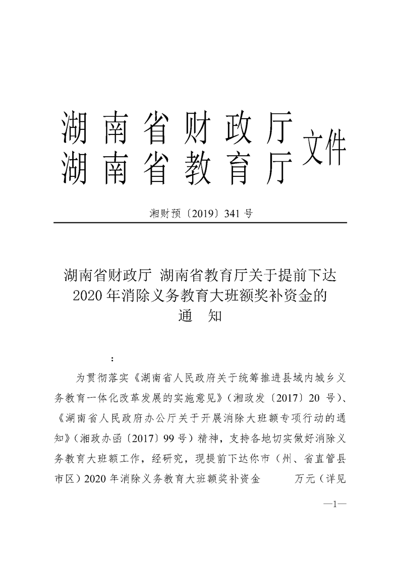 湖南省财政厅 湖南省教育厅关于提前下达2020年消除义务教育大班额奖补资金的通知