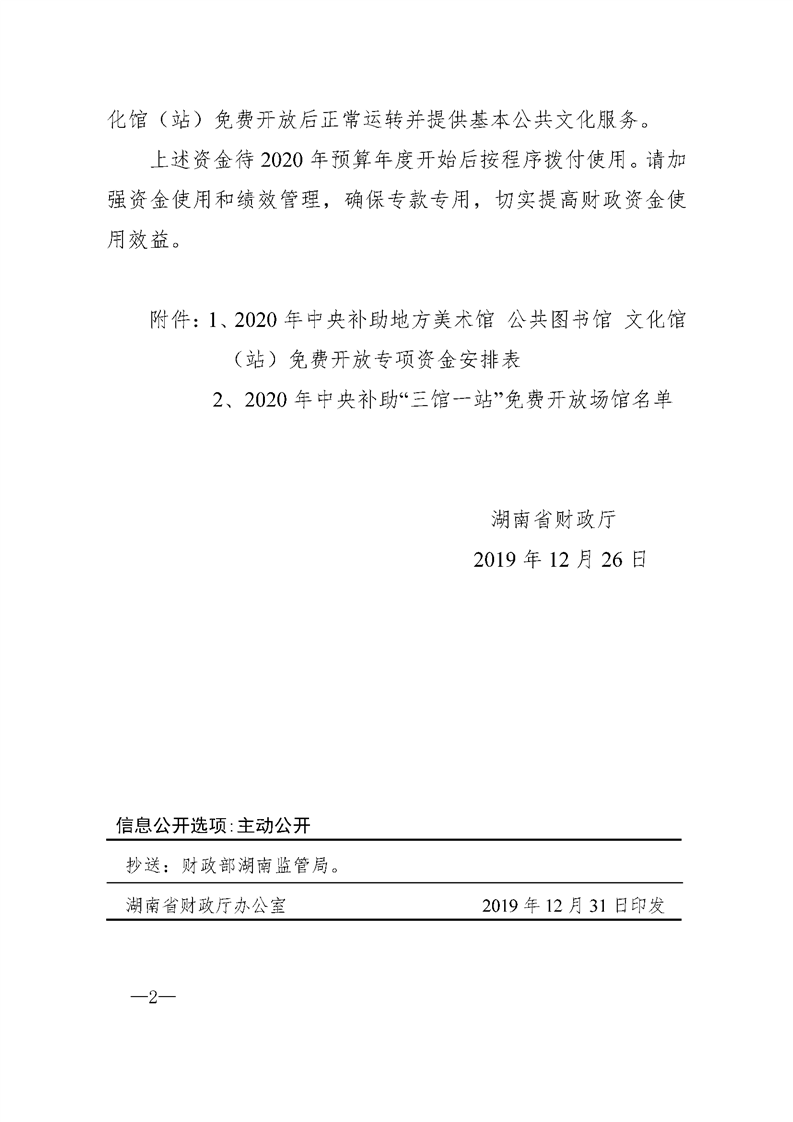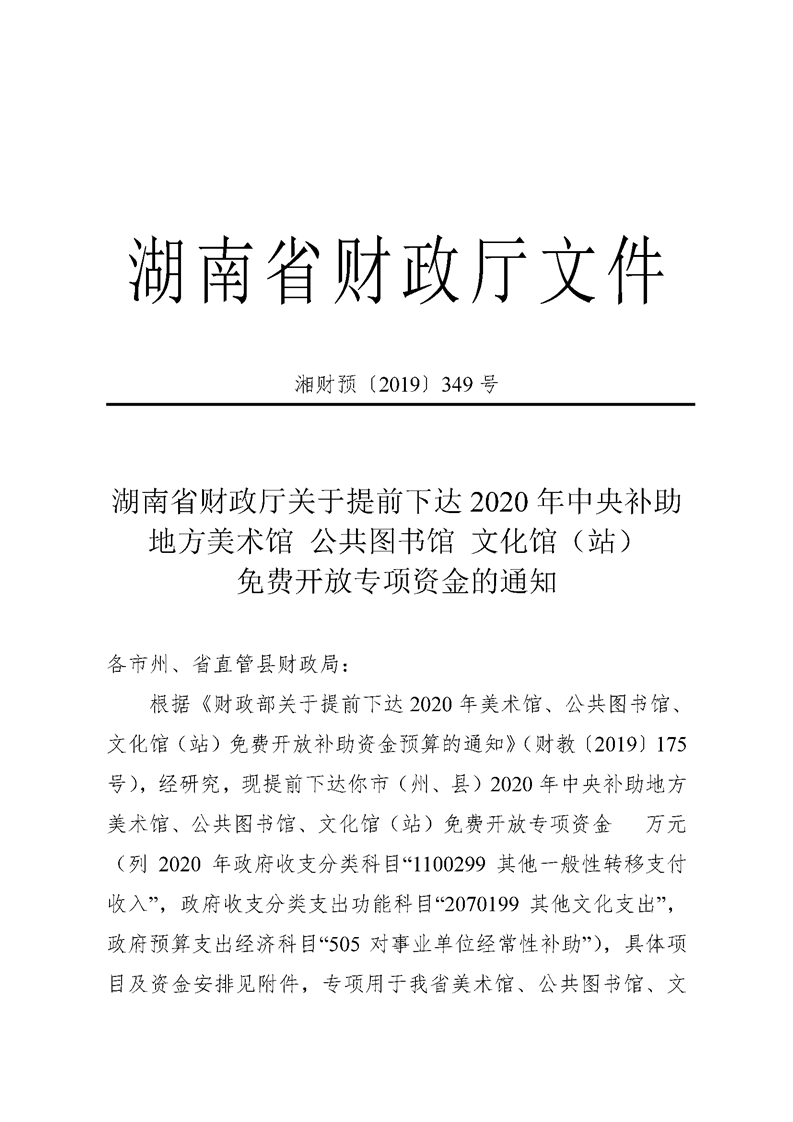 湖南省财政厅关于提前下达2020年中央补助地方美术馆公共图书馆文化馆(站)免费开放专项资金的通知