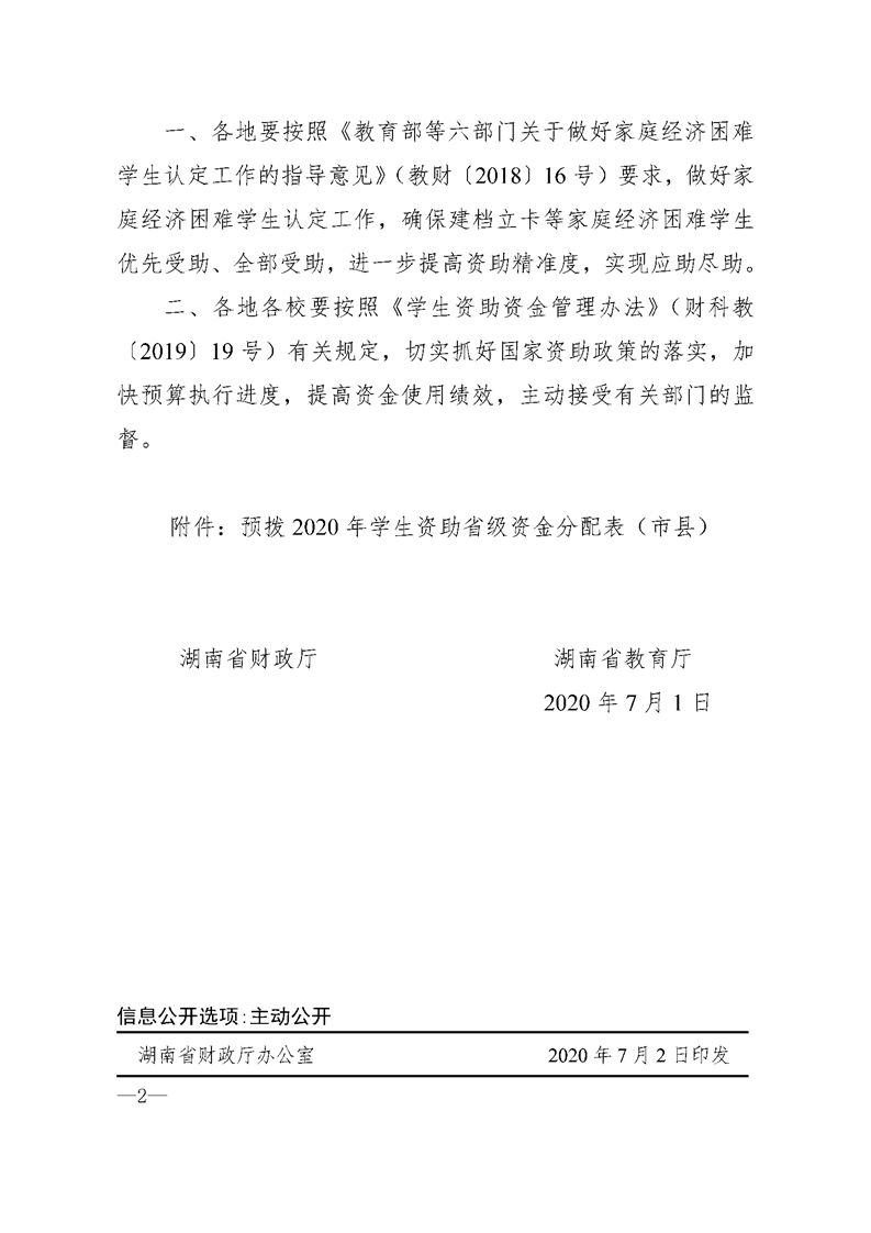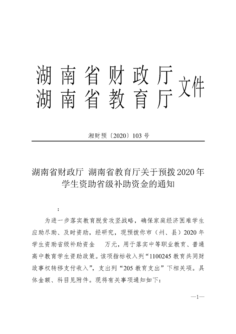 湖南省财政厅 湖南省教育厅关于预拨2020年学生资助省级补助资金的通知