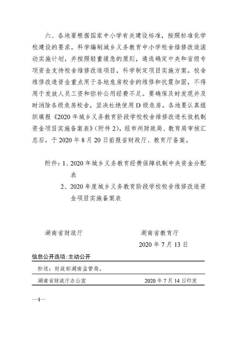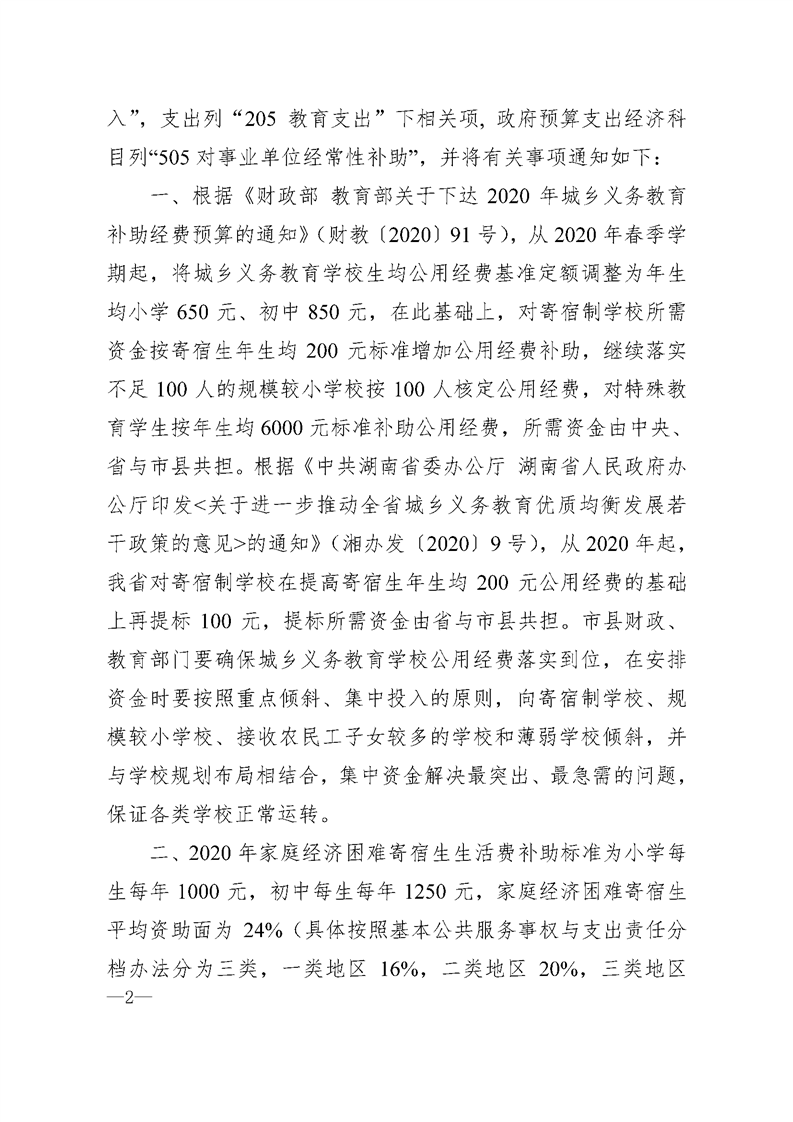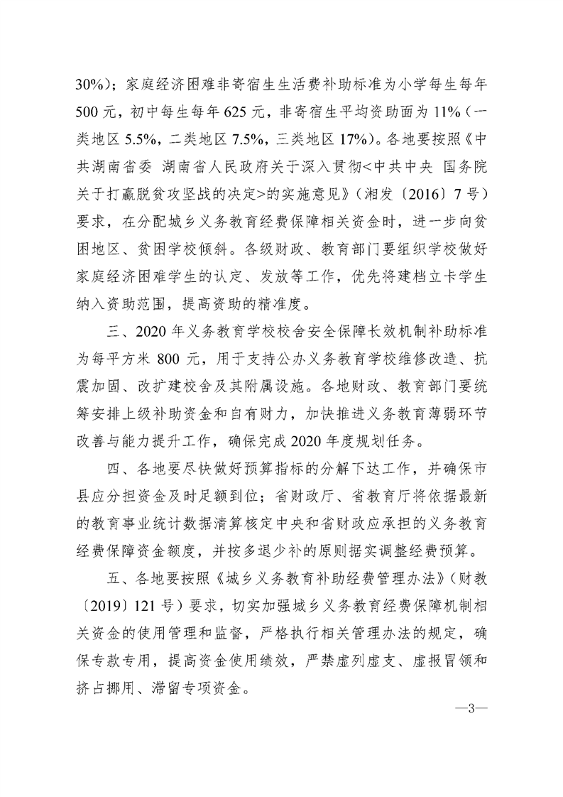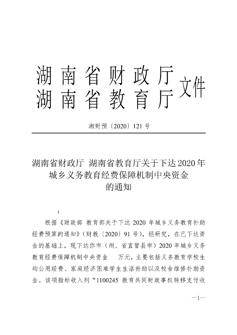 湖南省财政厅 湖南省教育厅关于下达2020年城乡义务教育经费保障机制中央资金的通知