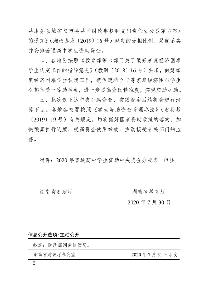 湖南省财政厅 湖南省教育厅关于下达2020年普通高中资助中央补助资金(市县)的通知