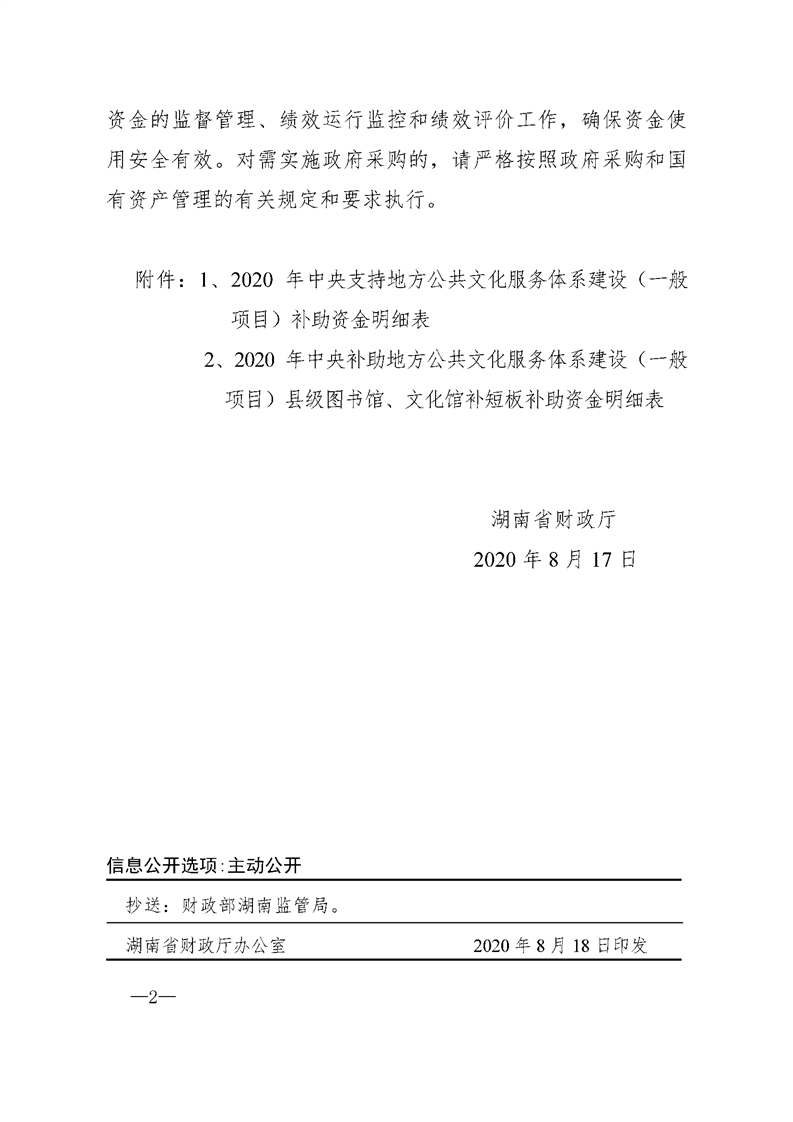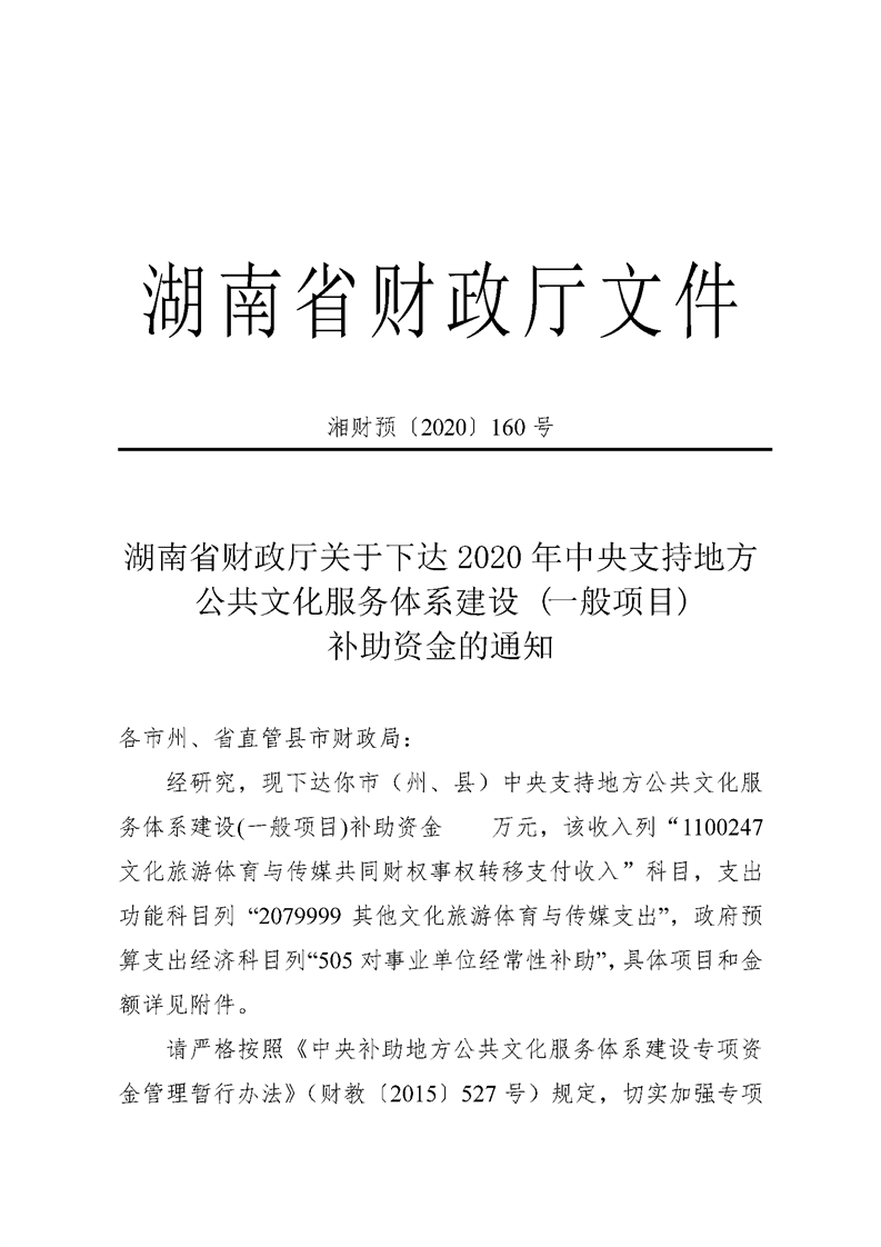 湖南省财政厅关于下达2020年中央支持地方公共文化服务体系建设(一般项目)补助资金的通知