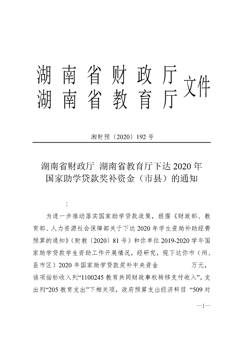 湖南省财政厅 湖南省教育厅下达2020年国家助学贷款奖补资金(市县)的通知
