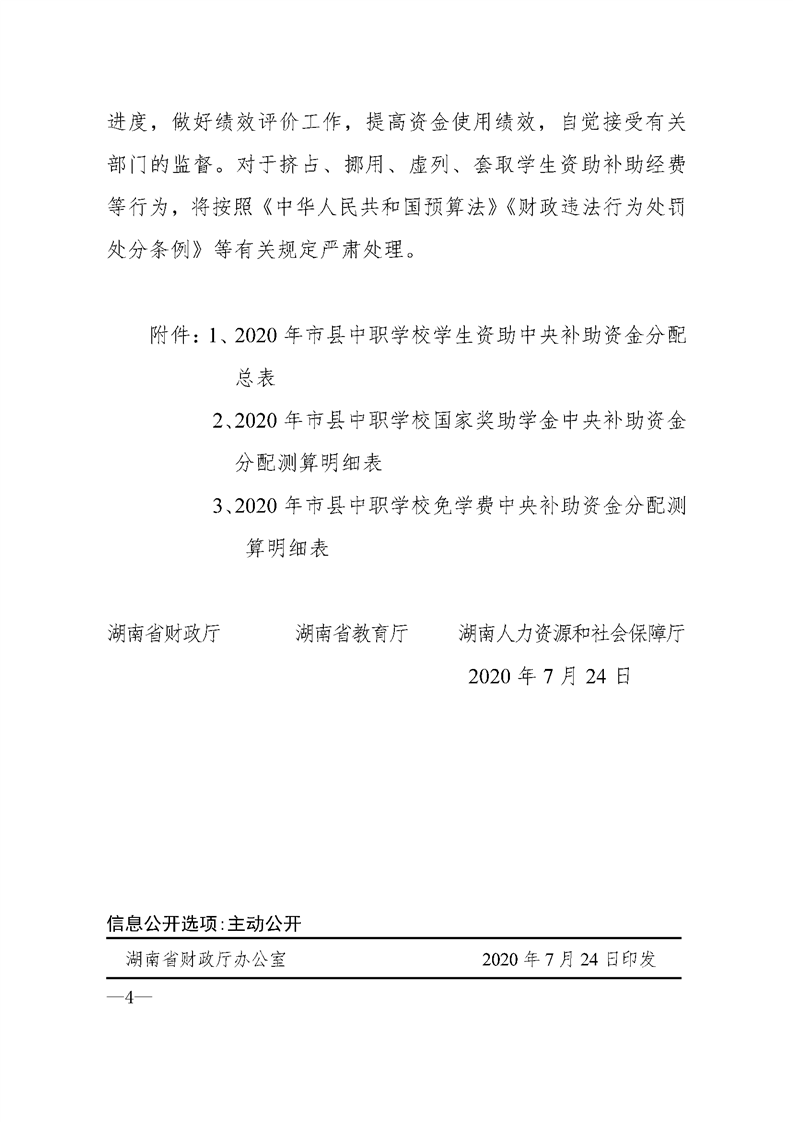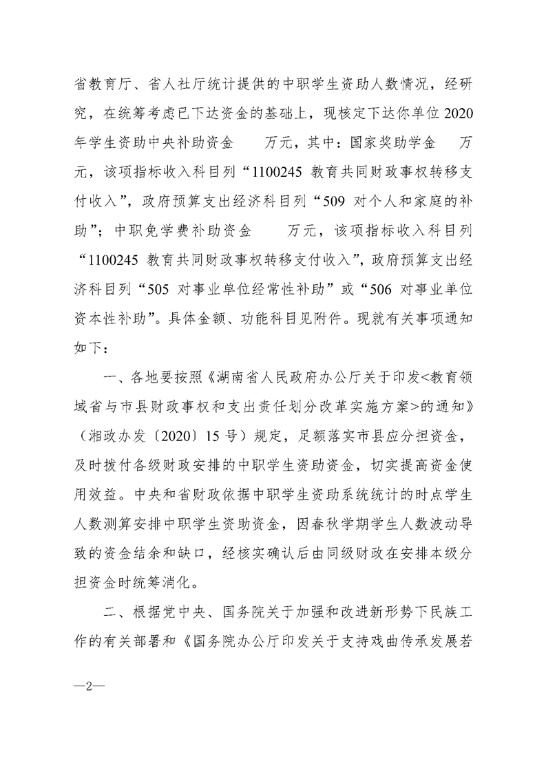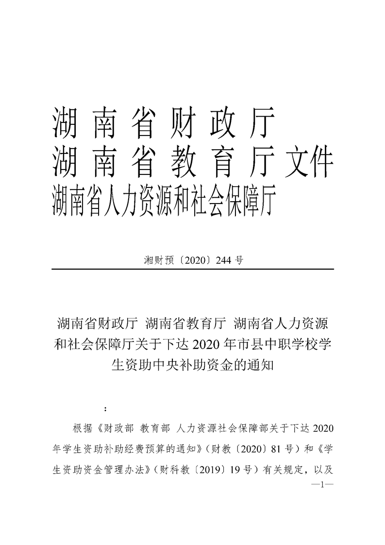 湖南省财政厅 湖南省教育厅 湖南省人力资源和社会保障厅关于下达2020年市县中职学校学生资助中央补助资金的通知