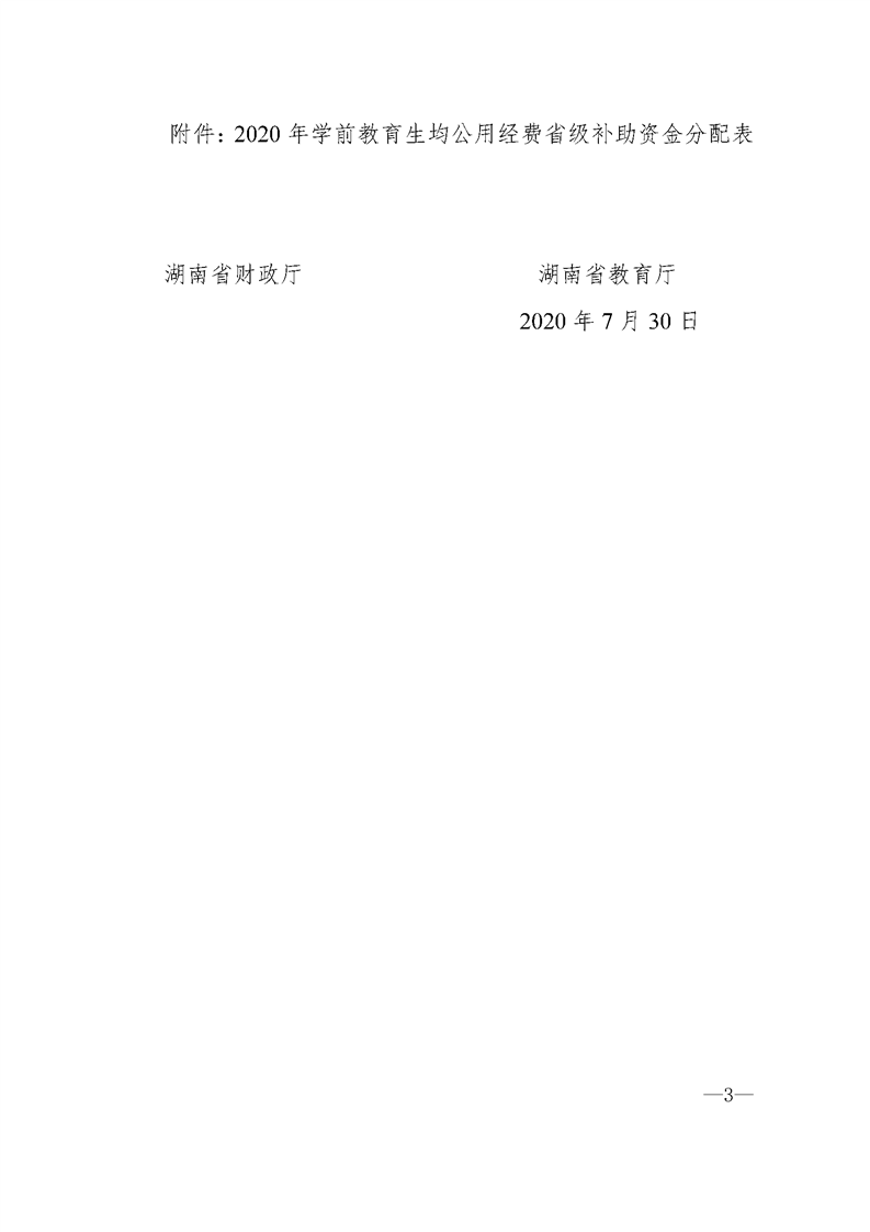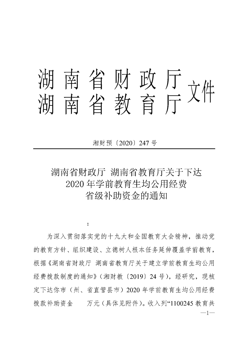 湖南省财政厅 湖南省教育厅关于下达2020年学前教育生均公用经费省级补助资金的通知