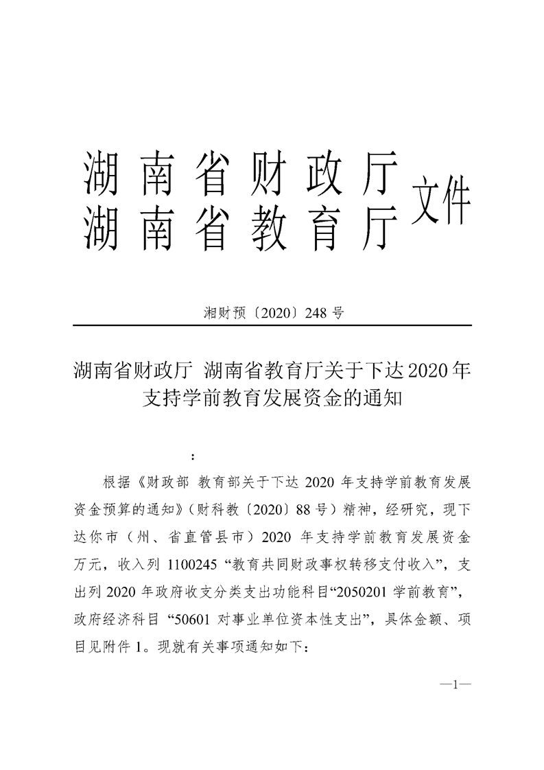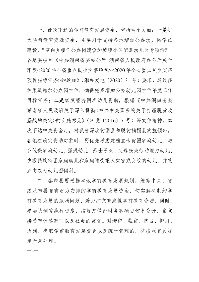 湖南省财政厅 湖南省教育厅关于下达2020年支持学前教育发展资金的通知