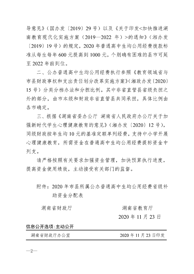 湖南省财政厅 湖南省教育厅关于下达2020年市县所属公办普通高中生均公用经费省级补助资金的通知