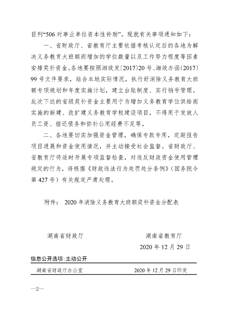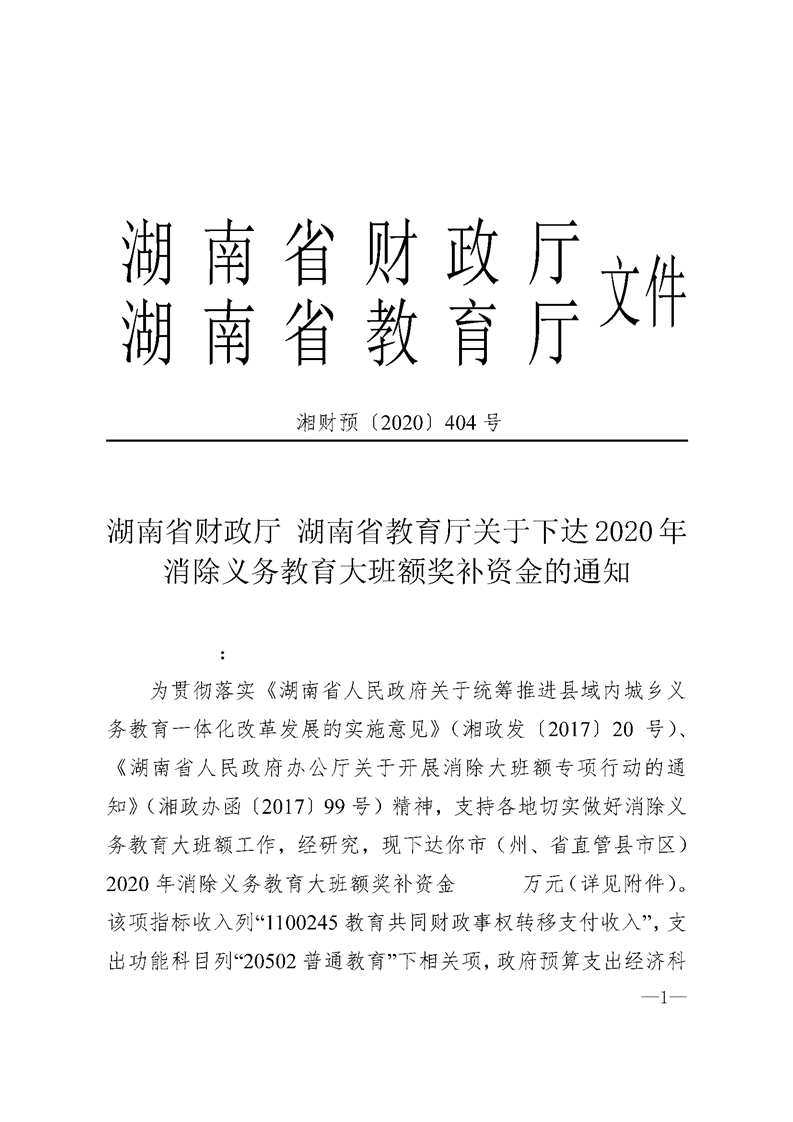湖南省财政厅 湖南省教育厅关于下达2020年消除义务教育大班额奖补资金的通知