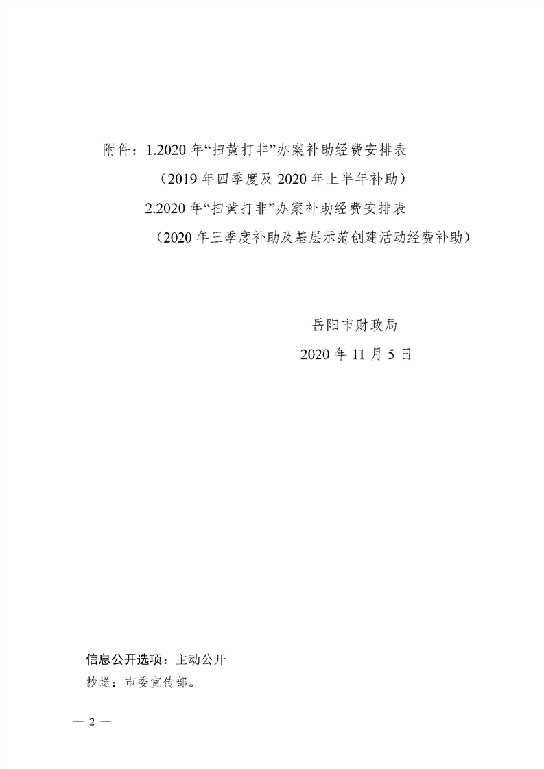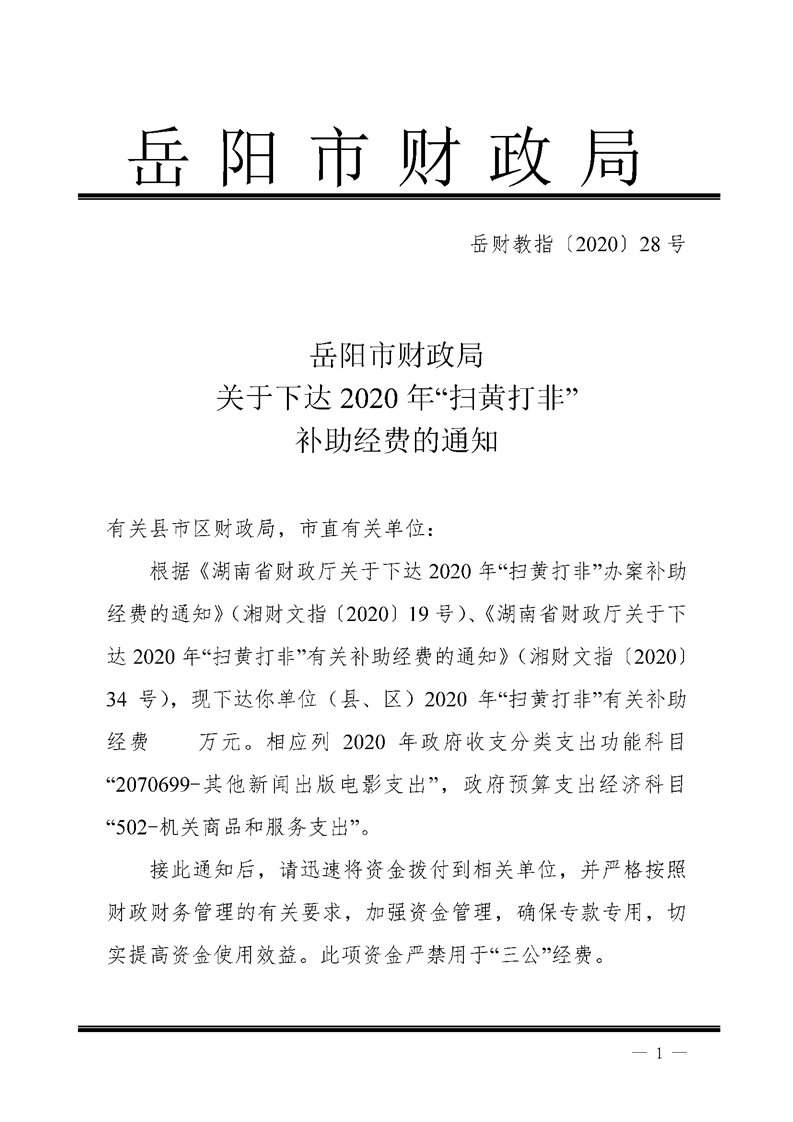 岳阳市财政局关于下达2020年“扫黄打非”有关补助经费的通知