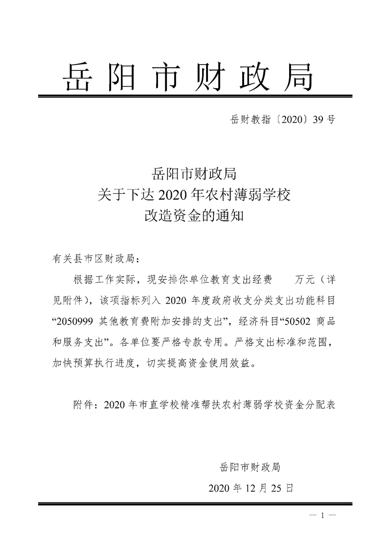 岳阳市财政局关于下达2020年农村薄弱学校改造资金的通知