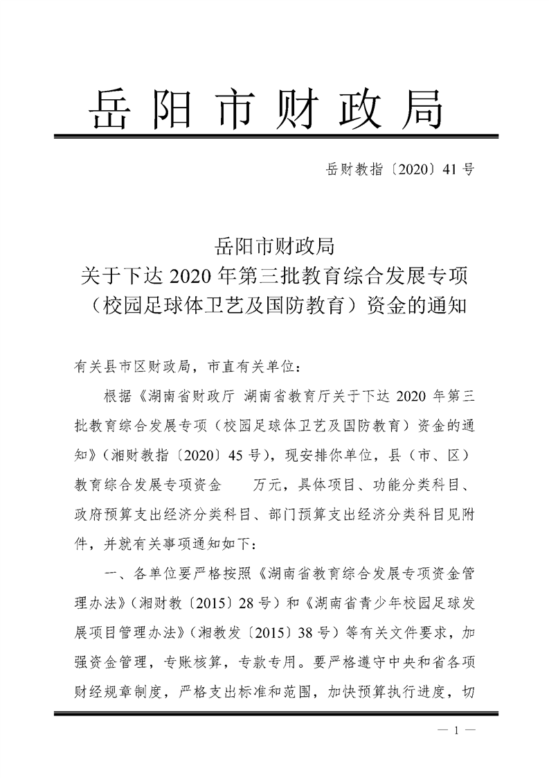 岳阳市财政局关于下达2020年第三批教育综合发展专项(校园足球、体卫艺及国防教育)资金的通知