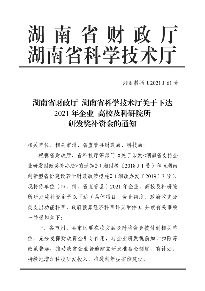 关于下达2021年企业高校及科研院所研发奖补资金的通知