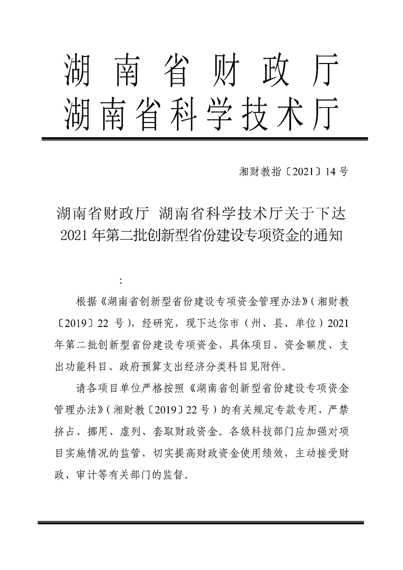 关于下达2021年第二批创新型省份建设专项资金的通知