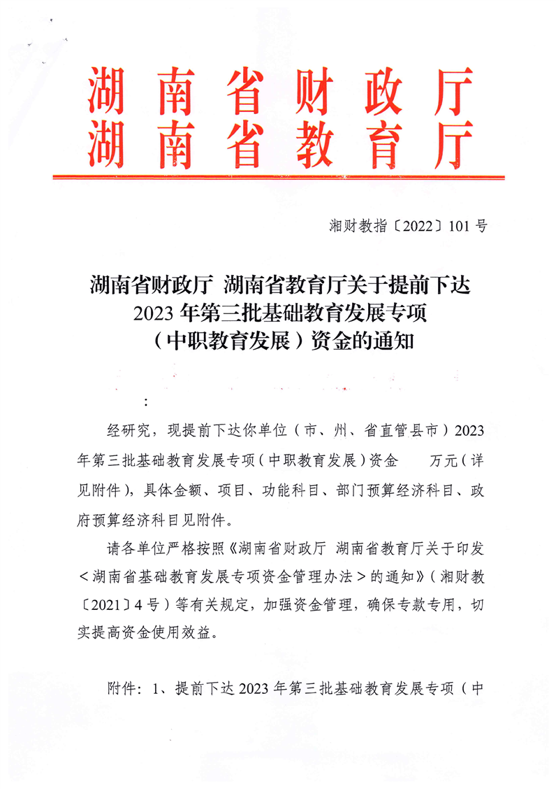 关于提前下达2023年第三批基础教育发展专项(中职教育发展)资金的通知