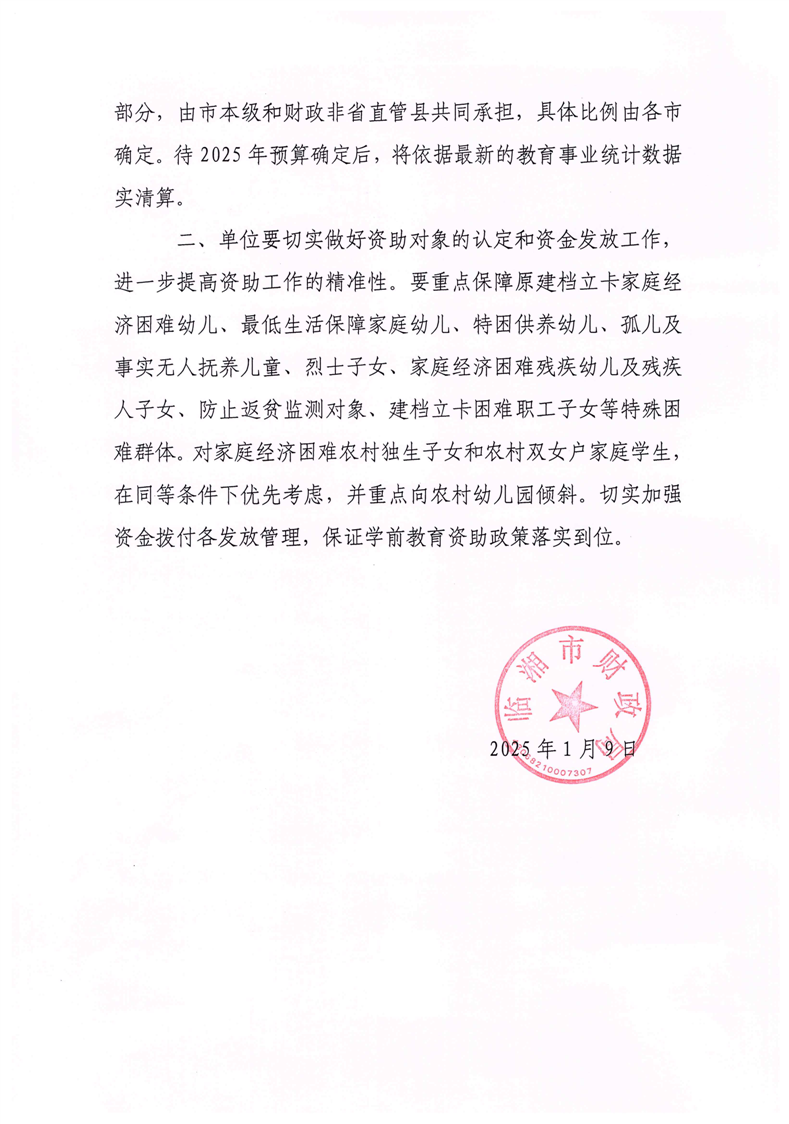 关于提前下达2025年家庭经济困难幼儿中央和省级补助资金的通知
