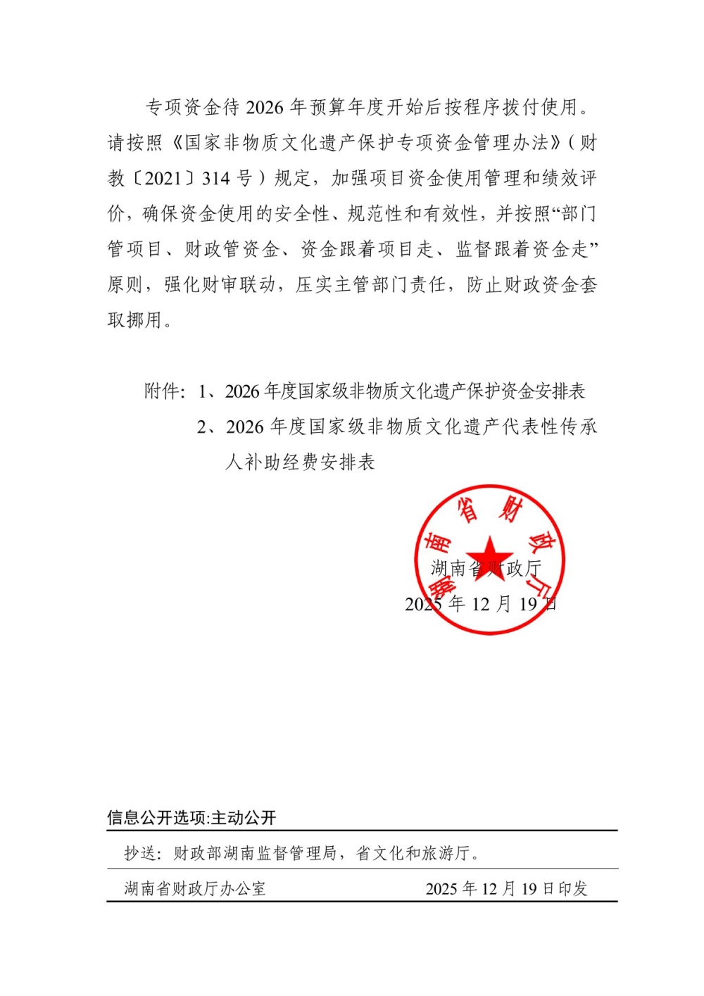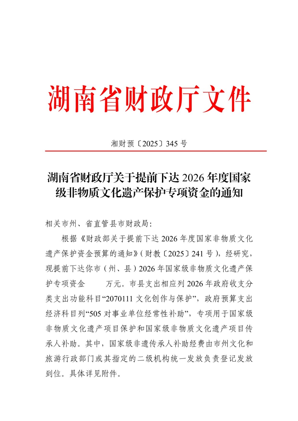 湖南省财政厅关于提前下达2026年度国家级非物质文化遗产保护专项资金的通知