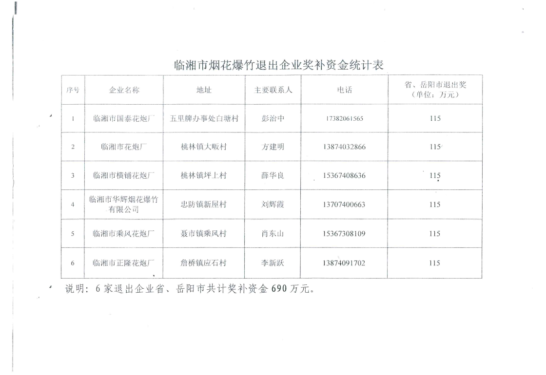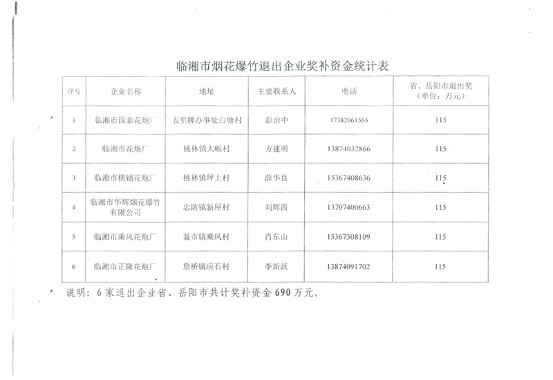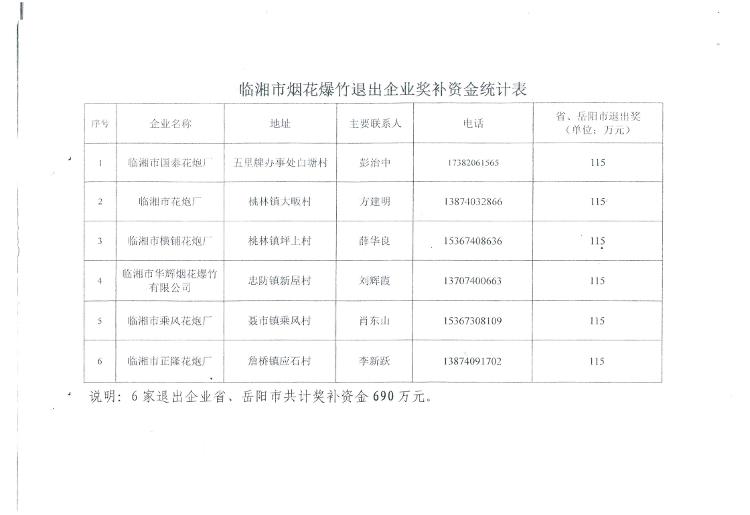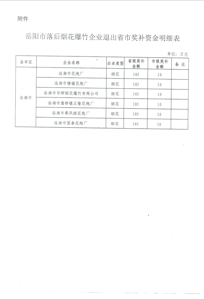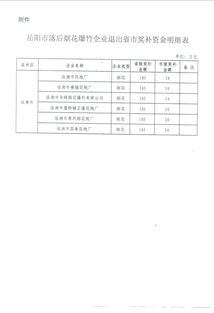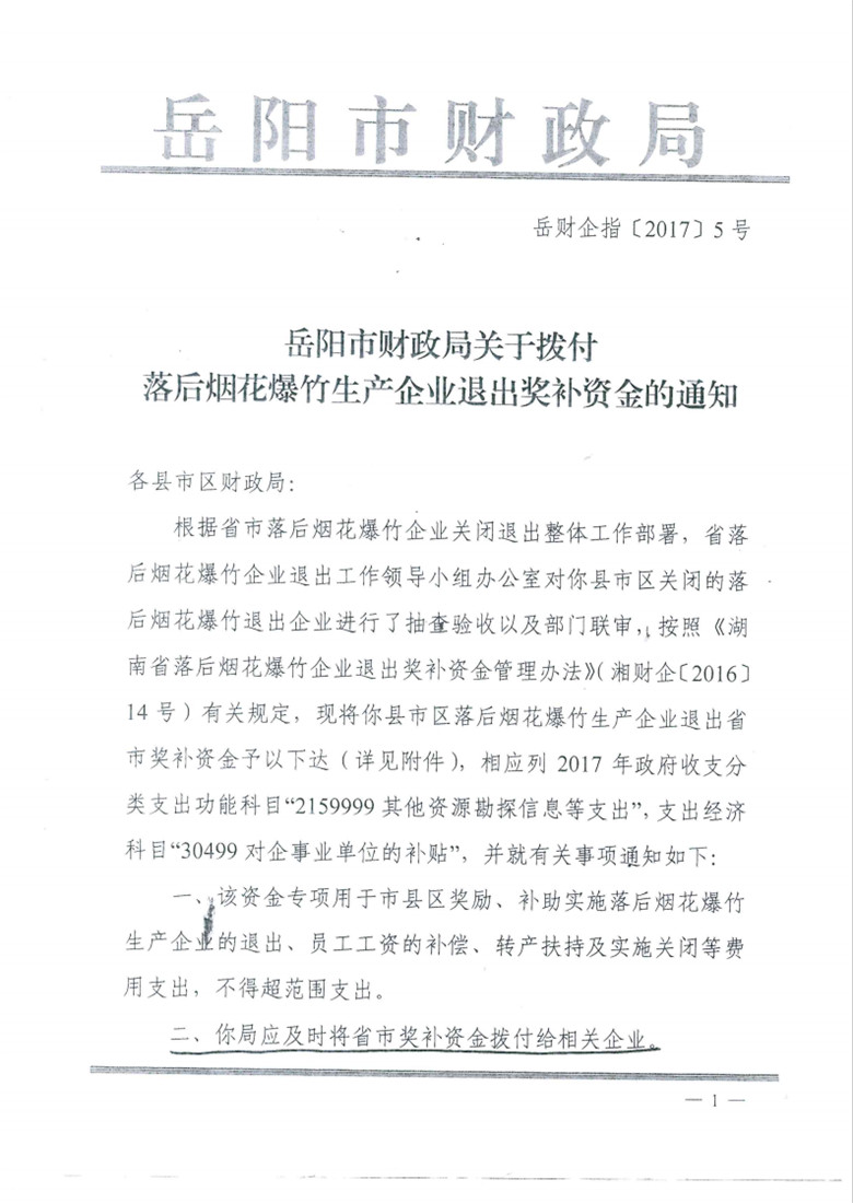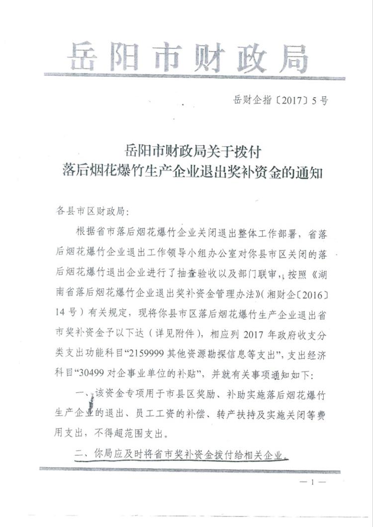 岳阳市财政局关于拨付落后烟花爆竹生产企业退出奖补资金的通知